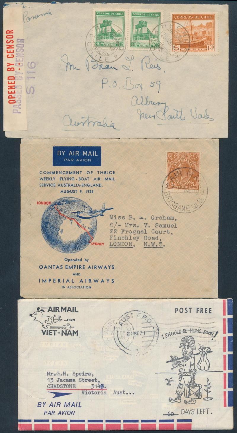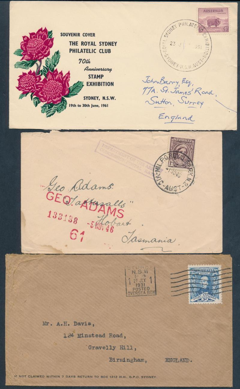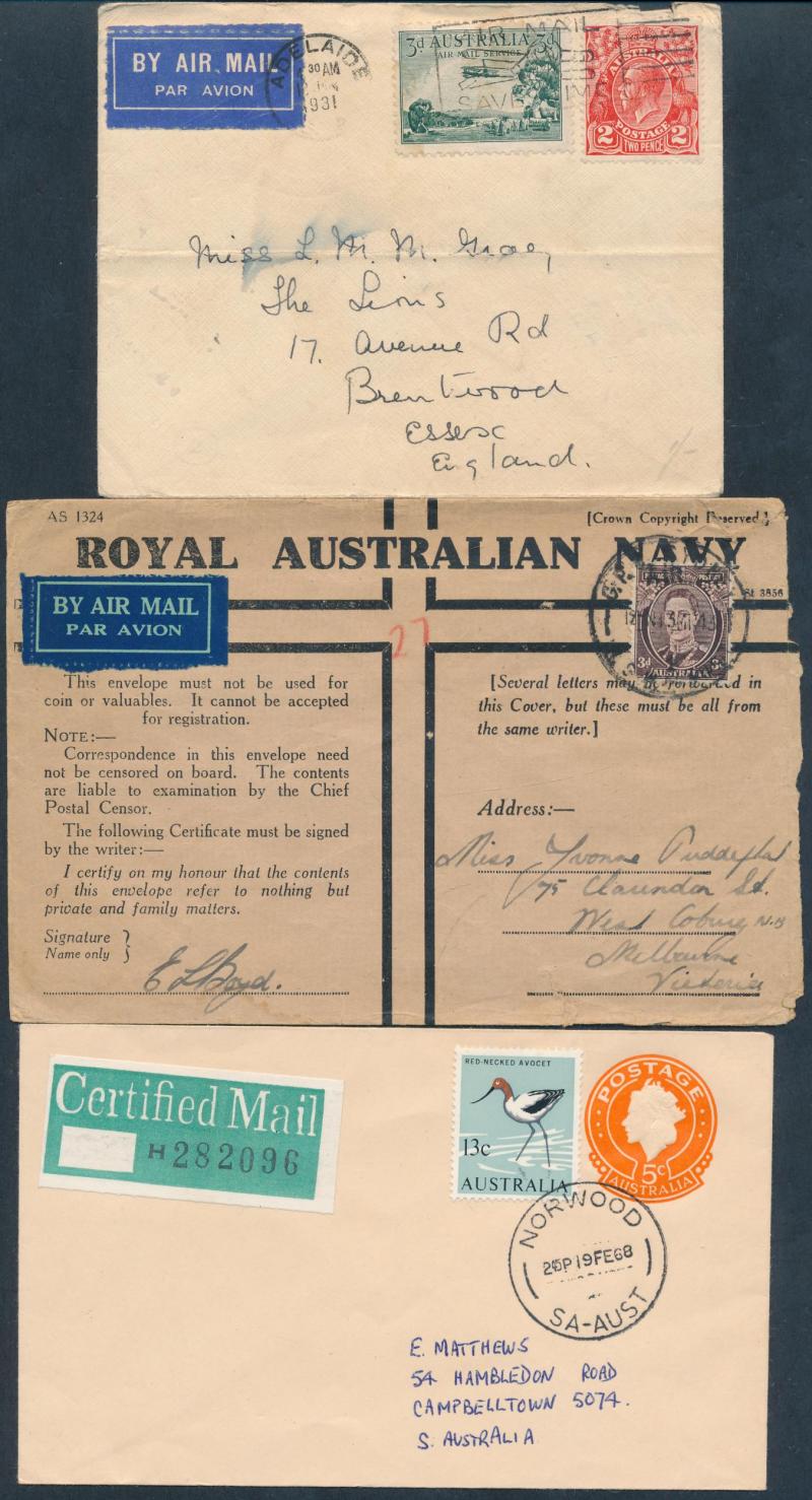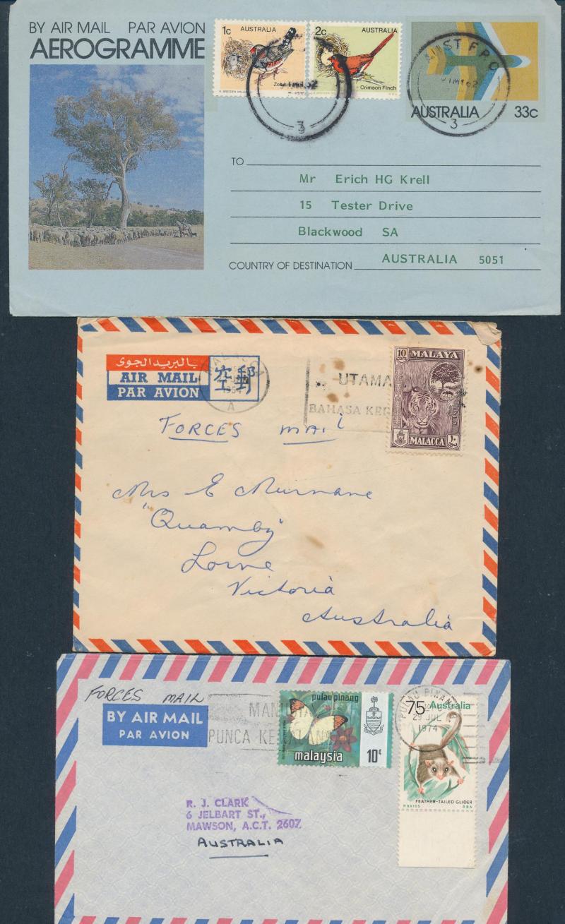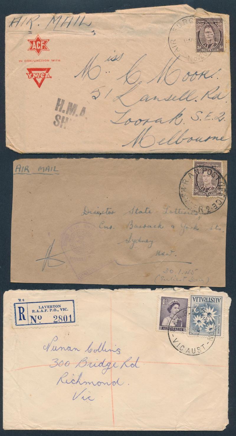 to England and 1915 cover with printed-boxed 'YMCA' & 1d red tied by 'MILITARY CAMP 1/TASMANIA' cds, Malayan Emergency covers to Australia x4 (one registered), 1930s commercial airmails & flights including inwards items, other covers from UK & USA