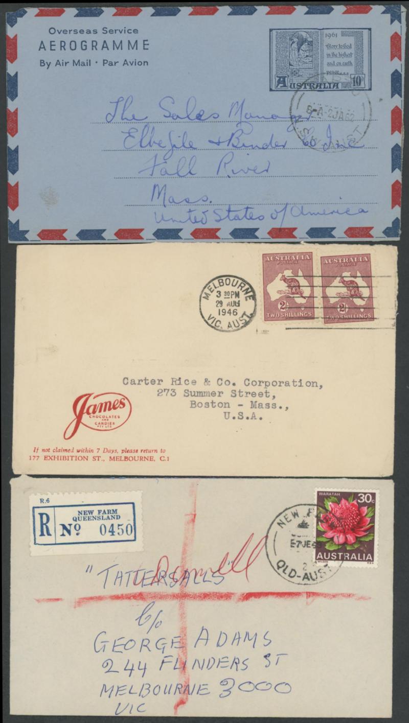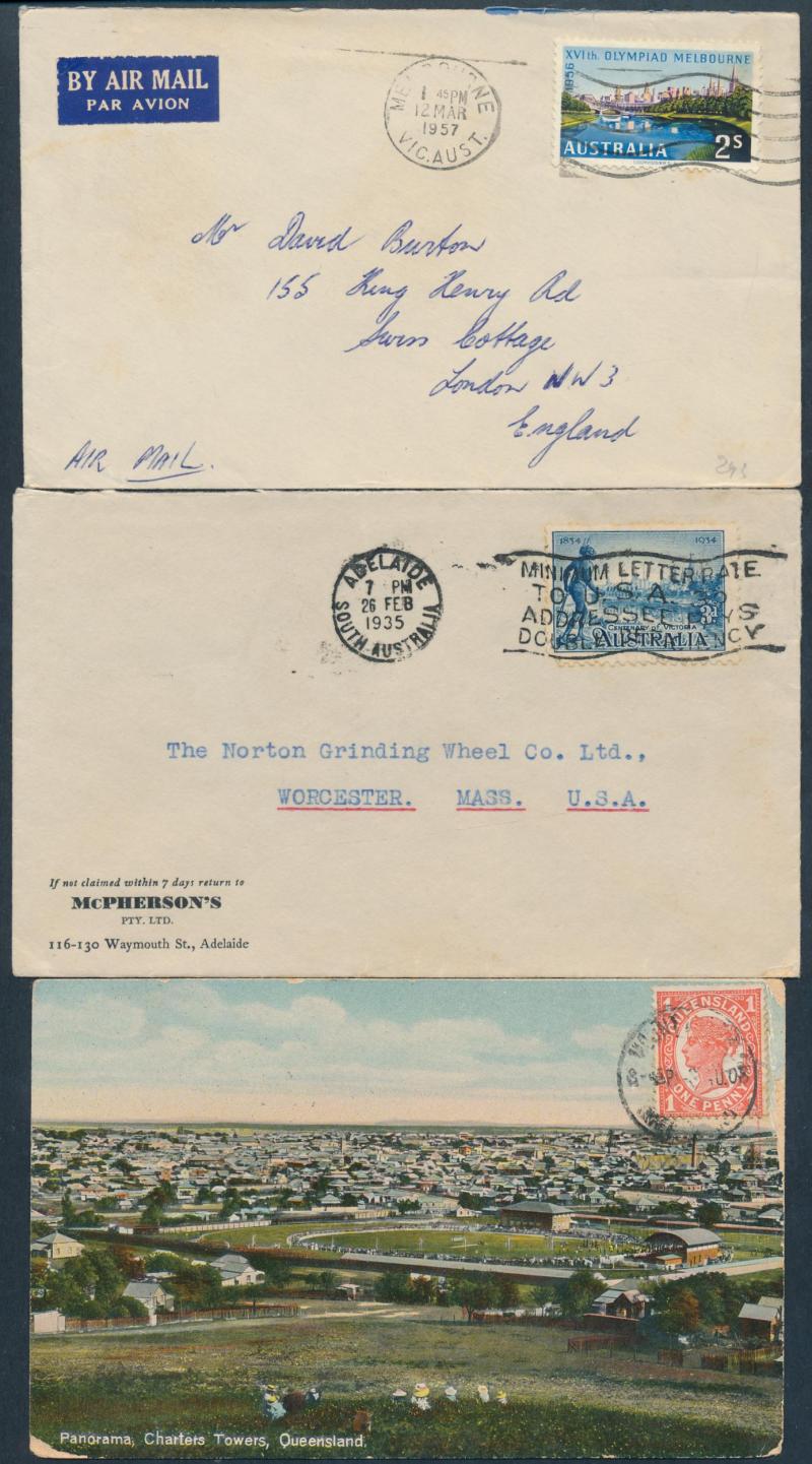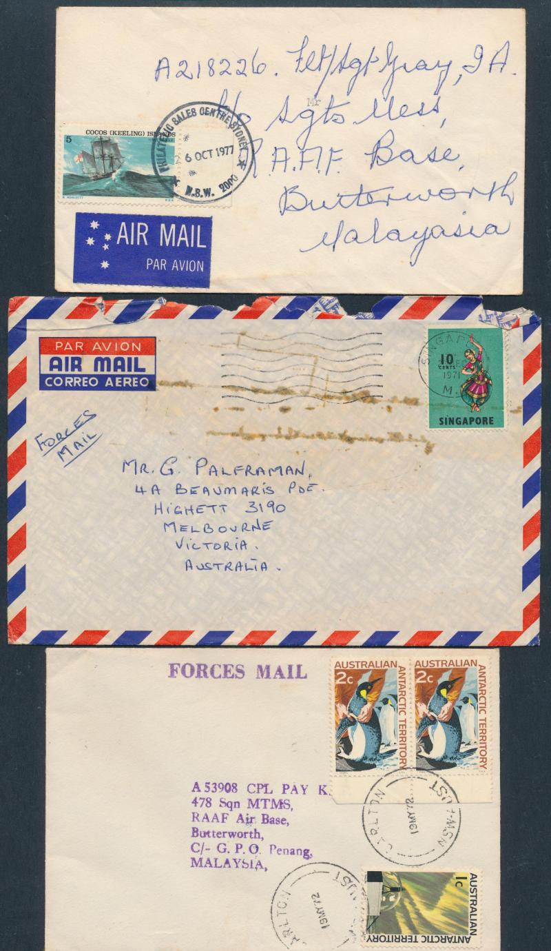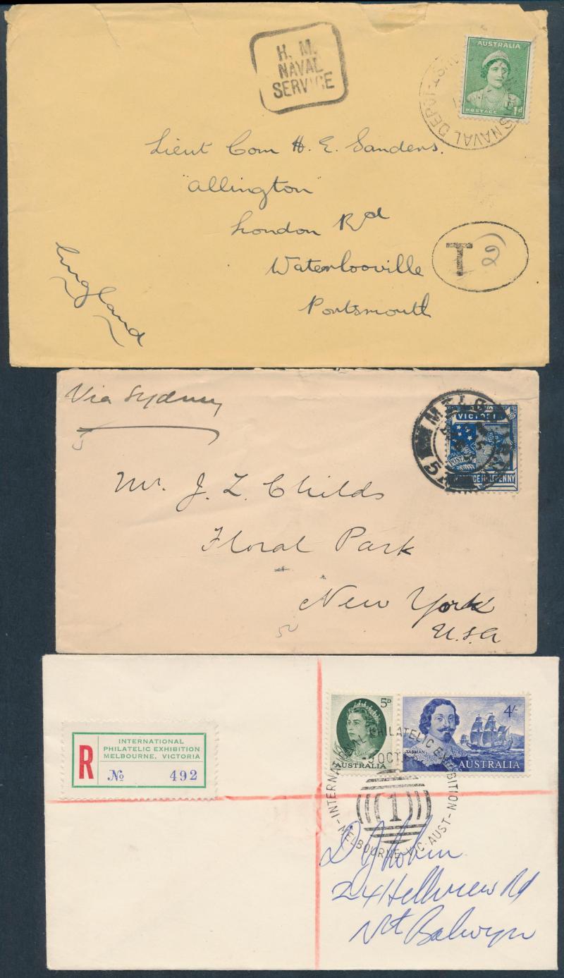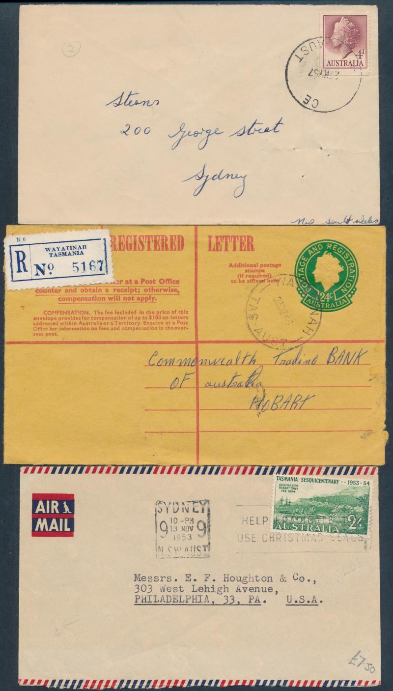 to England and 1915 cover with printed-boxed 'YMCA' & 1d red tied by 'MILITARY CAMP 1/TASMANIA' cds, Malayan Emergency covers to Australia x4 (one registered), 1930s commercial airmails & flights including inwards items, other covers from UK & USA