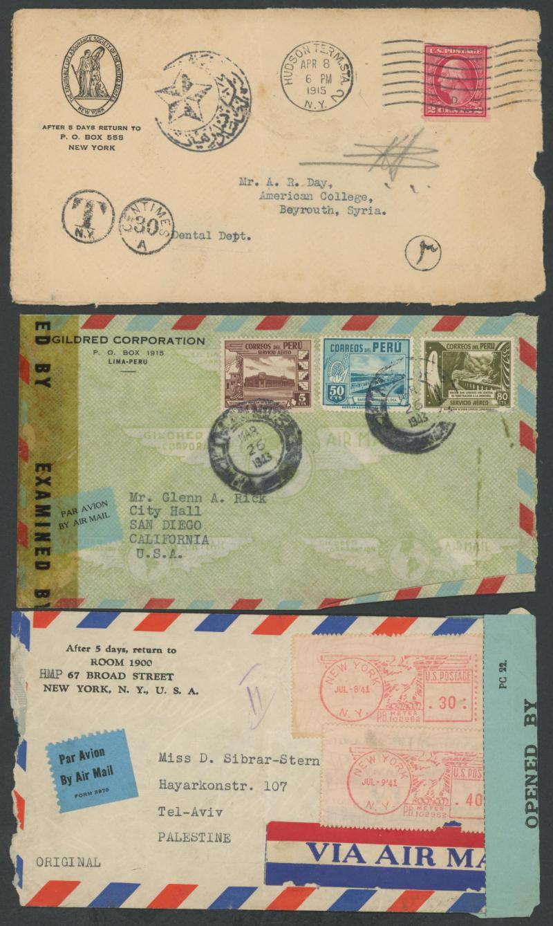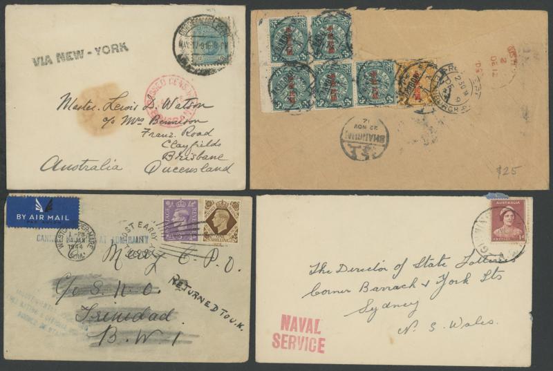 with KGV 1/4d + Vic Centenary 3d, 1941 to Czech Government in Exile in London x2 (one registered) both with impressive consular cachet on the reverse, 1940 to USA via Hong Kong at 4/8d rate, 1941 from internee to GB at 5/10d rate with superb