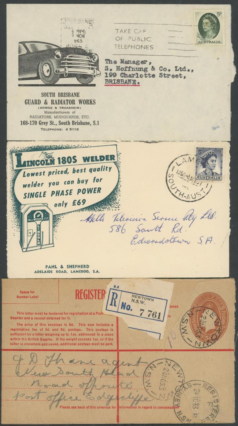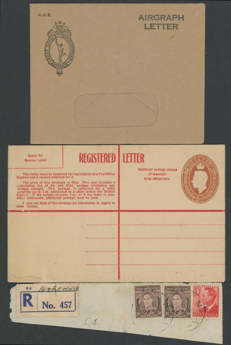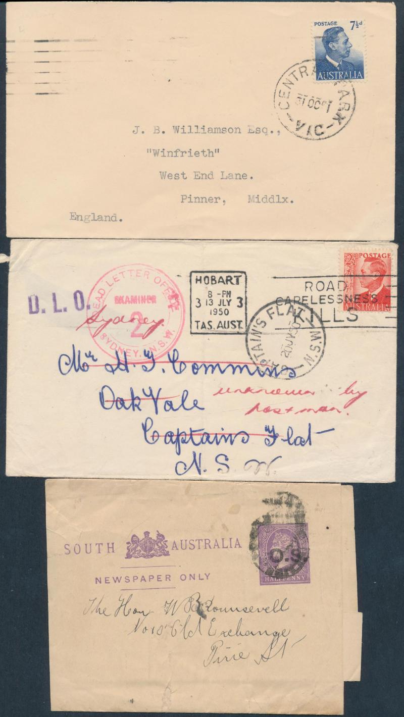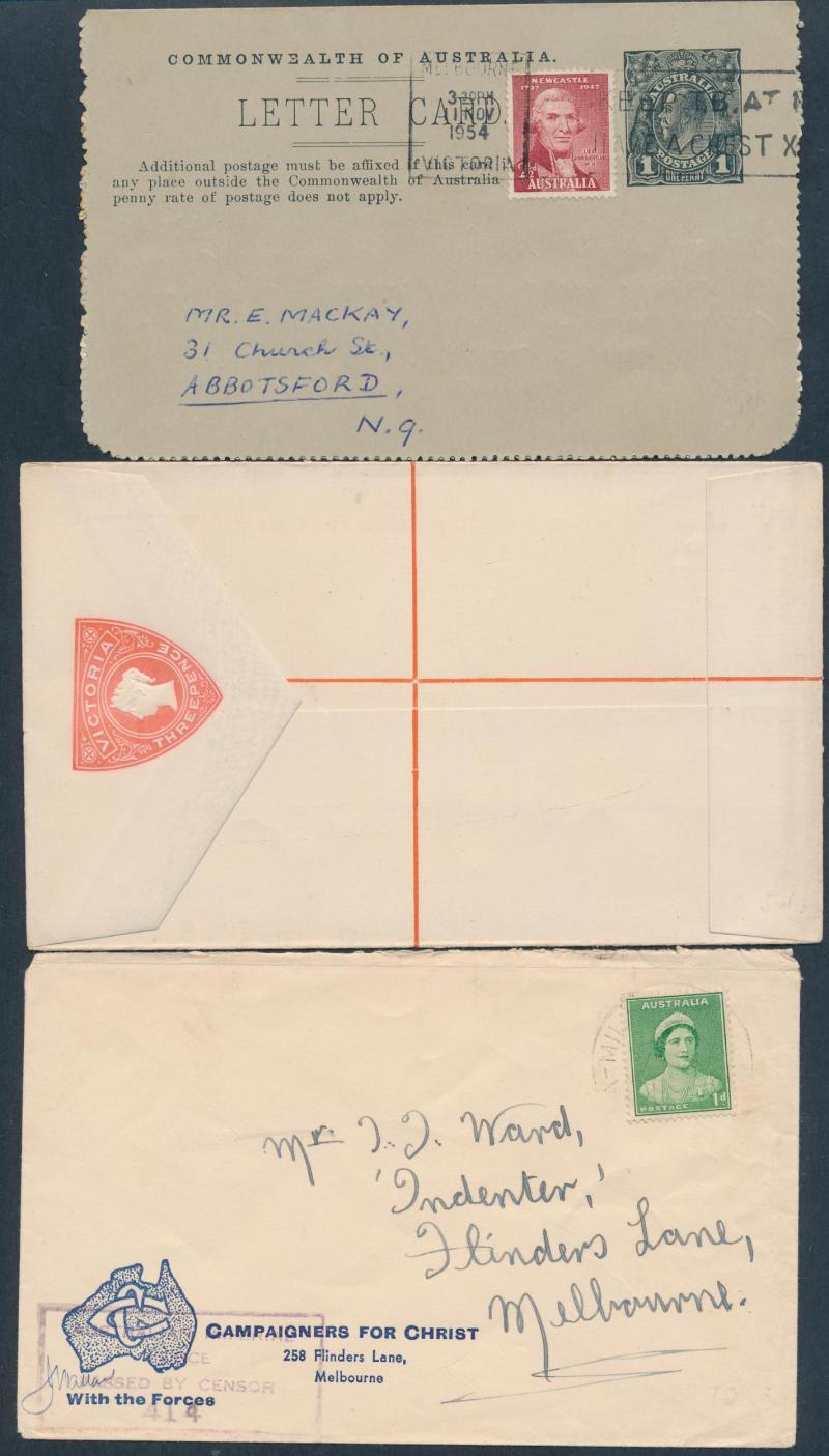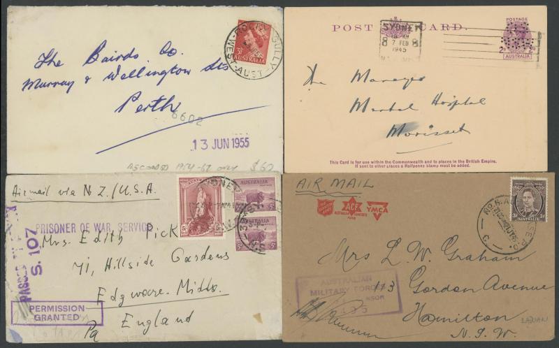 'PERMISSION/GRANTED' cachet, 1959 underpaid air express Vic-WA with Postage Due ½d block of 24 on the reverse, etc; also Postal Stationery including two KGVI 2d Postal Cards punctured 'OS/NSW', KGV 4d orange Registration Envelope with red &
