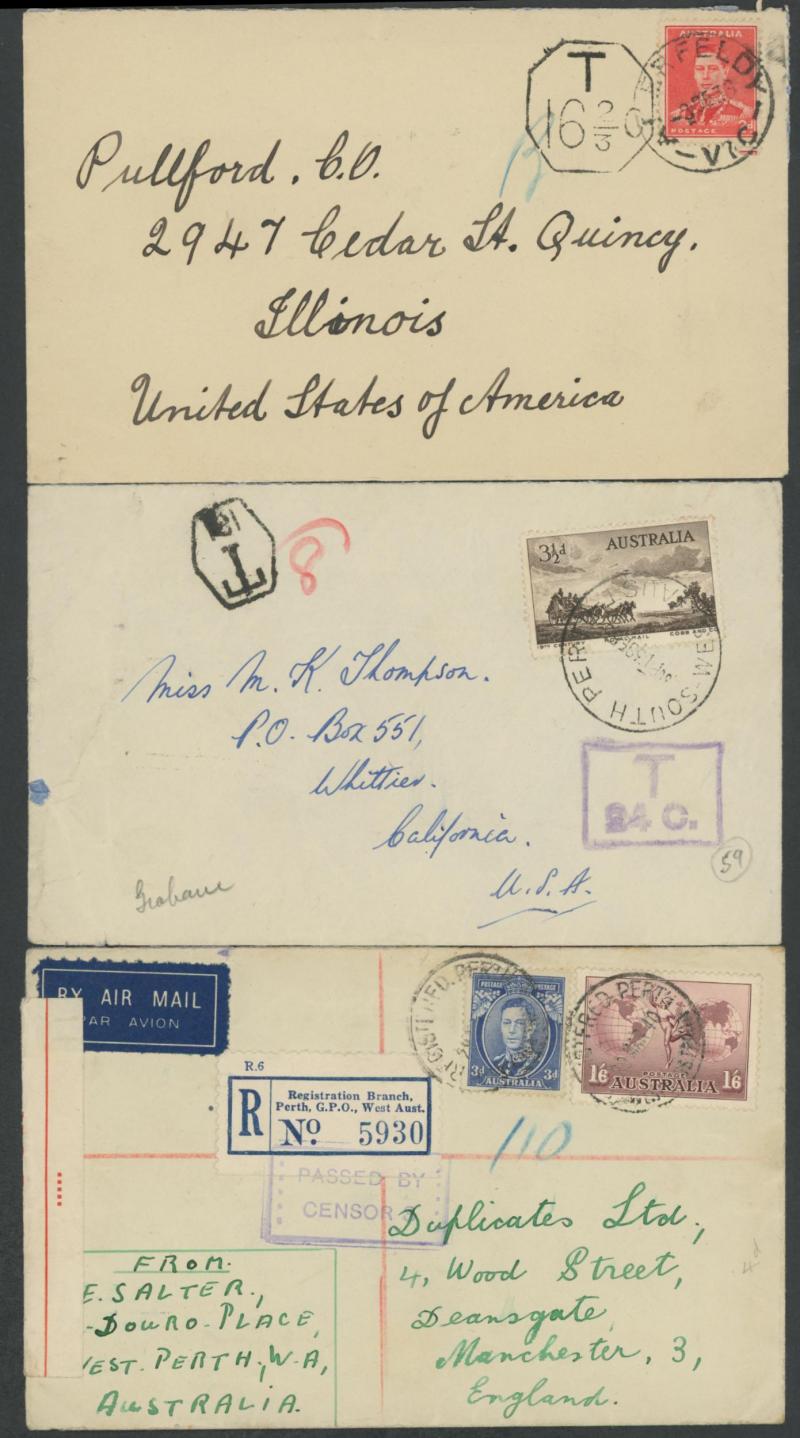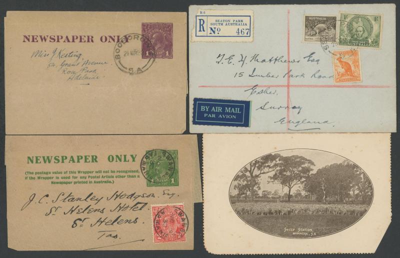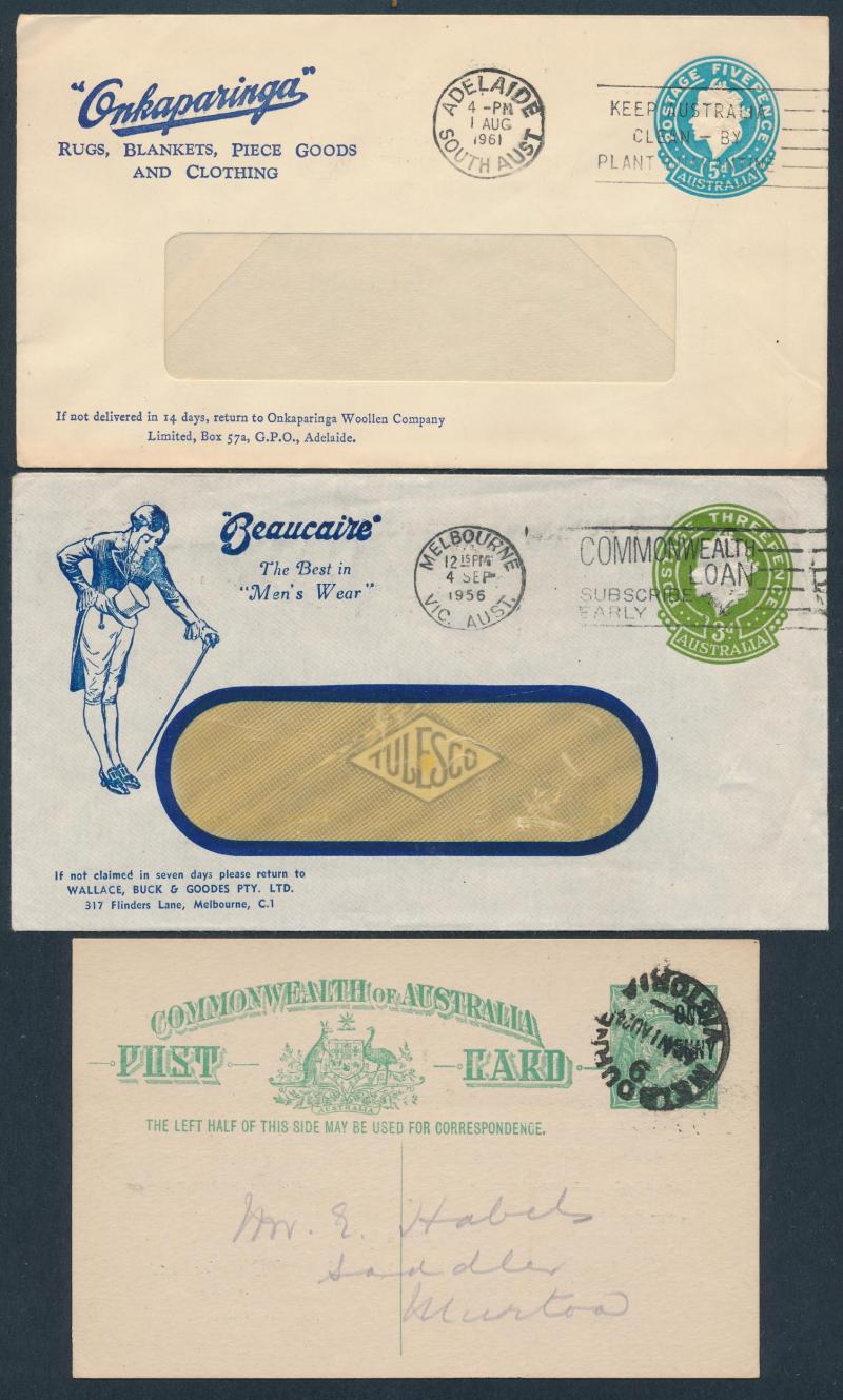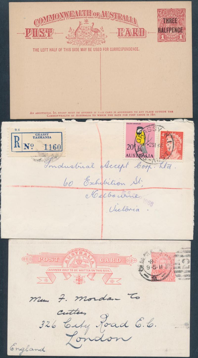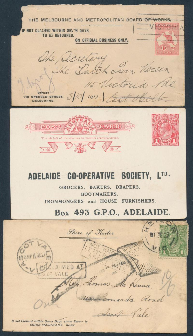 'PERMISSION/GRANTED' cachet, 1959 underpaid air express Vic-WA with Postage Due ½d block of 24 on the reverse, etc; also Postal Stationery including two KGVI 2d Postal Cards punctured 'OS/NSW', KGV 4d orange Registration Envelope with red &