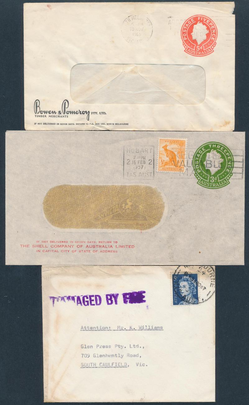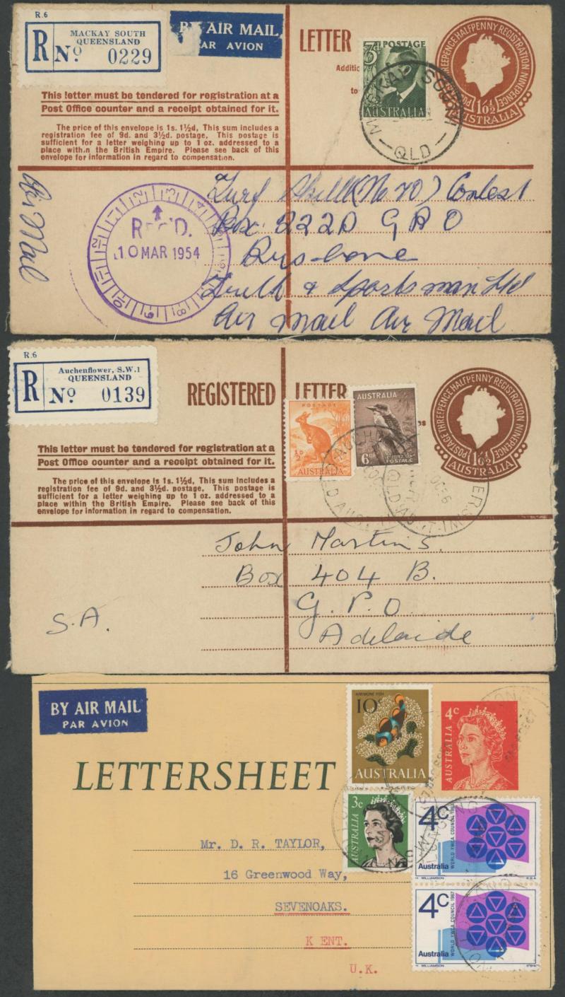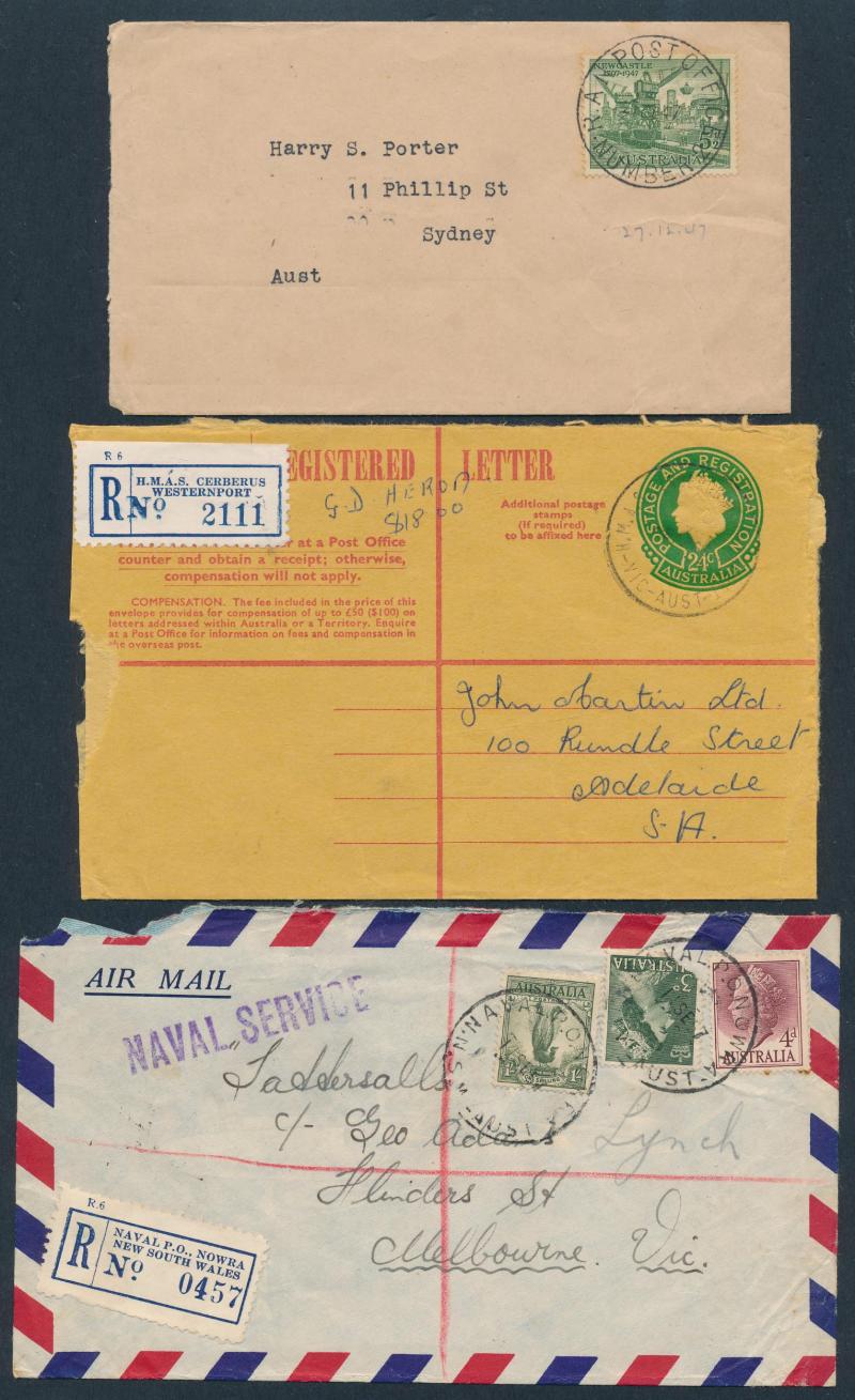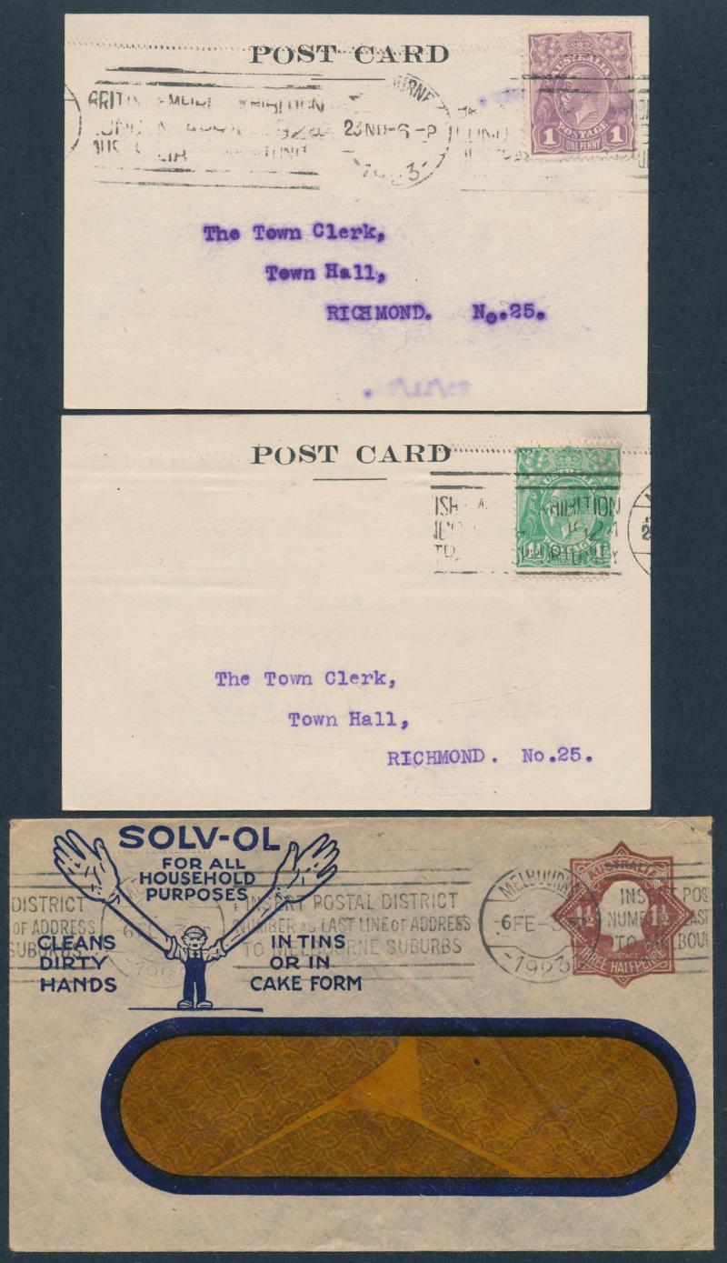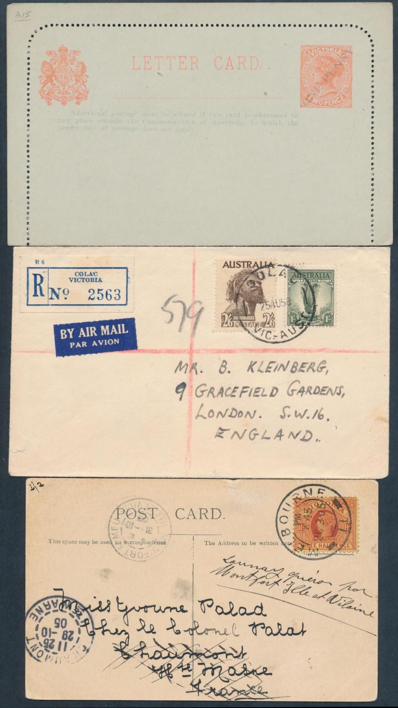 'PERMISSION/GRANTED' cachet, 1959 underpaid air express Vic-WA with Postage Due ½d block of 24 on the reverse, etc; also Postal Stationery including two KGVI 2d Postal Cards punctured 'OS/NSW', KGV 4d orange Registration Envelope with red &