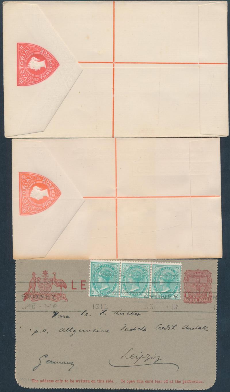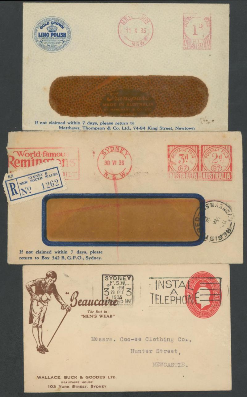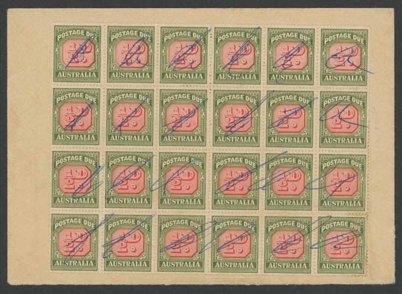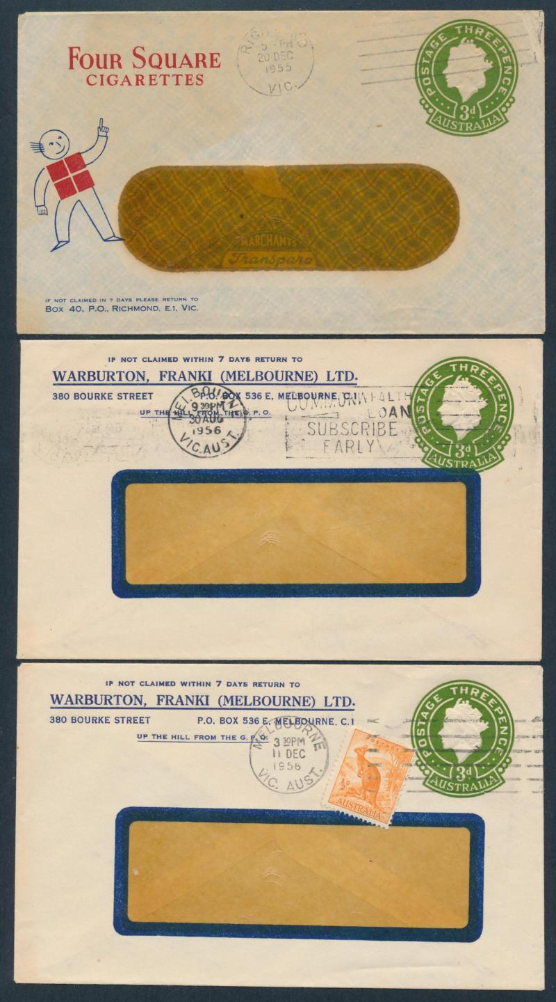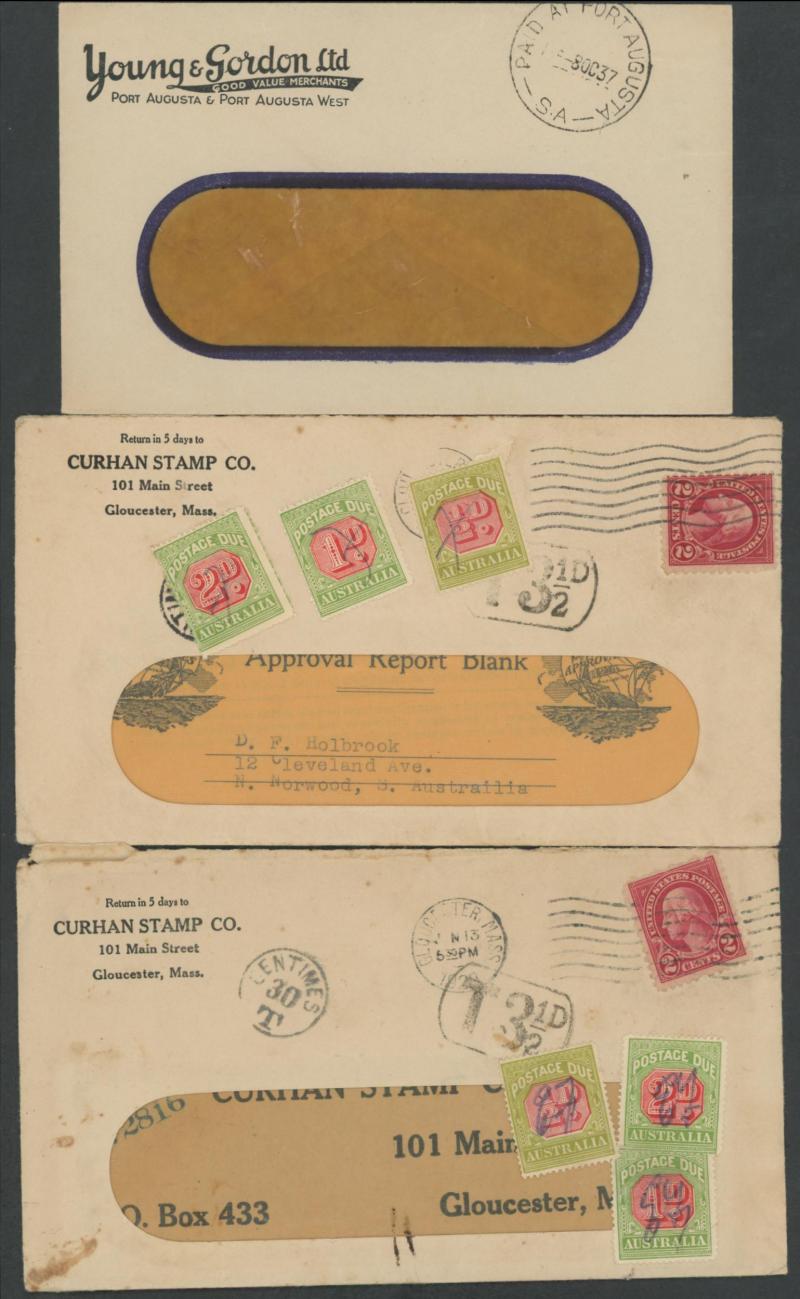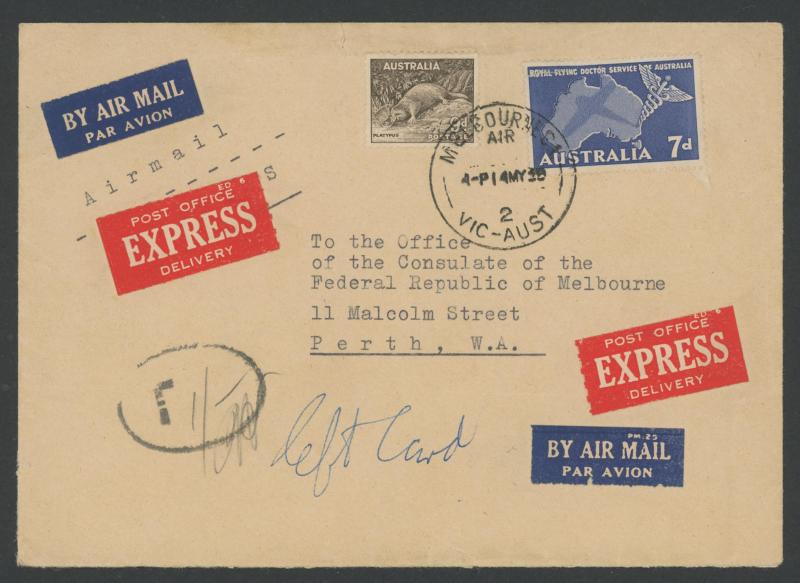 'PERMISSION/GRANTED' cachet, 1959 underpaid air express Vic-WA with Postage Due ½d block of 24 on the reverse, etc; also Postal Stationery including two KGVI 2d Postal Cards punctured 'OS/NSW', KGV 4d orange Registration Envelope with red &