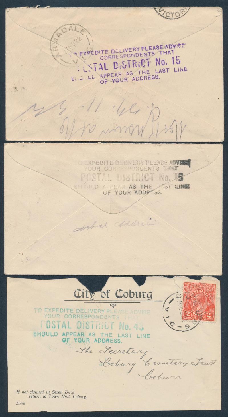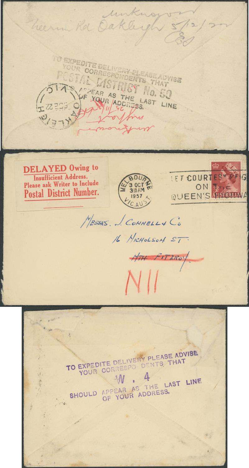 cancels, use in addresses & covers with five different correct-address instructional handstamps, several items for the 1928-67 alpha-numeric scheme including a similar handstamp (the only such item we have seen) on 1928 cover, slogan cancels & two
