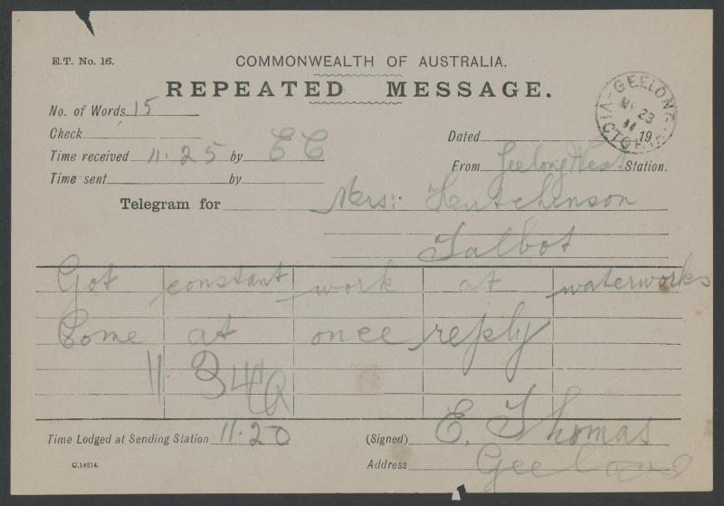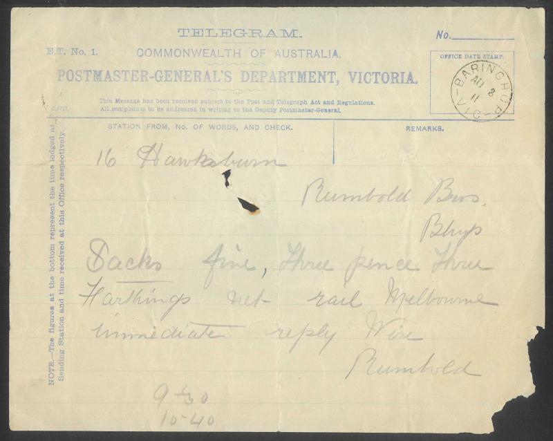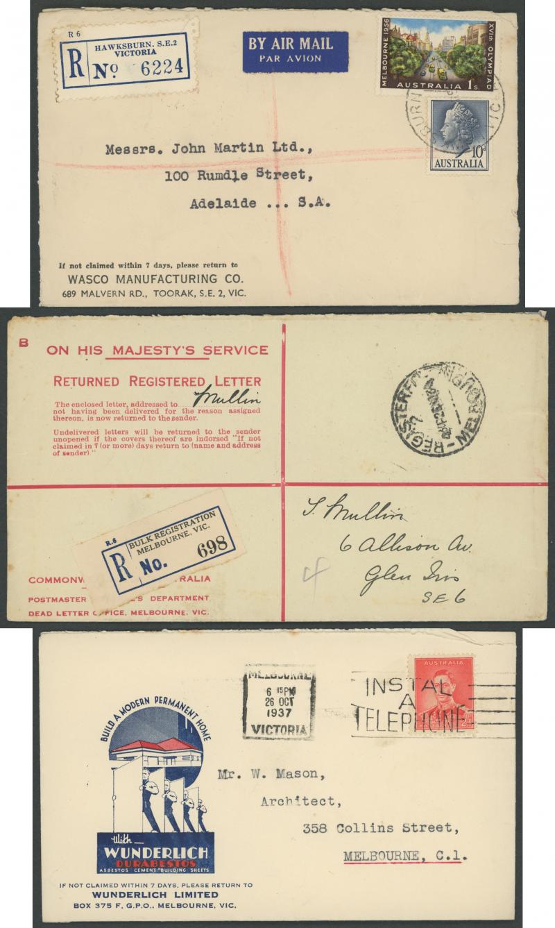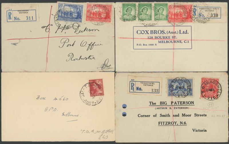 range of post-WWII forms & envelopes with some scarce Victorian TO datestamps plus covers with 'POMBORNEIT NORTH TO' (1937), 'TO ROCKBANK/VIC' (1938) & 'TO TRAGOWEL' (1937) all registered, 'TO ROCKBANK/VIC-AUST' (1955) & boxed 'TELEGRAPH/PUCKAPUNYAL