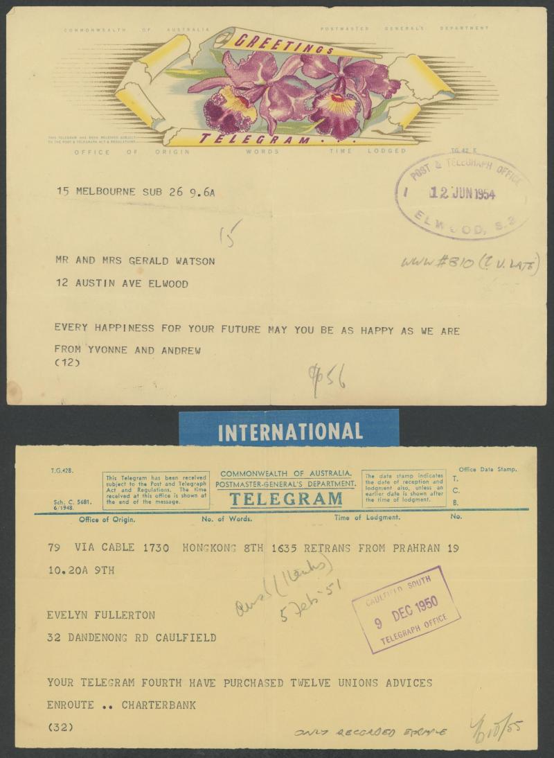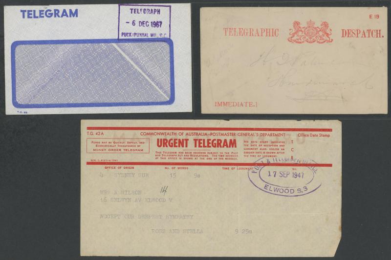 Telegrams mostly post-WWII but earlier items including Greetings types noted 1938 NSW Sesquicentenary unused (very scarce), variety