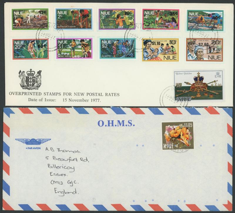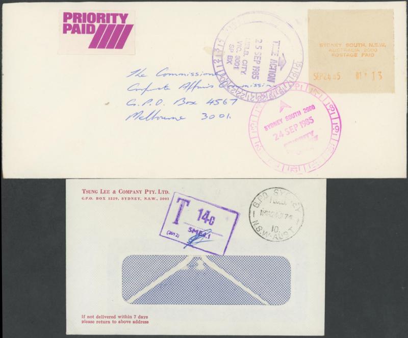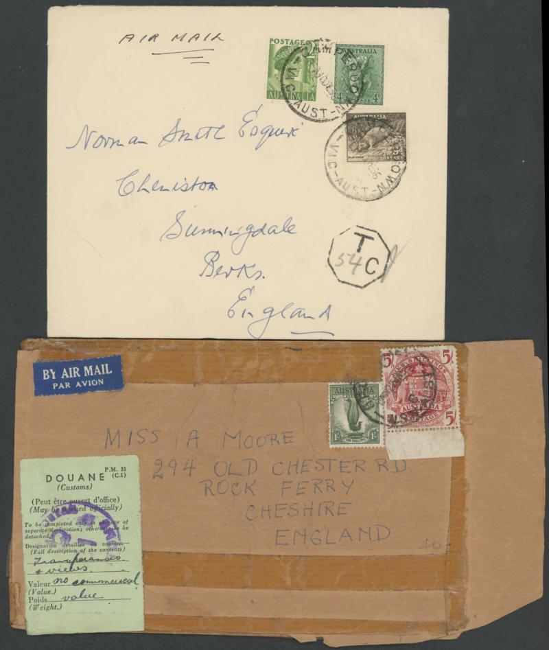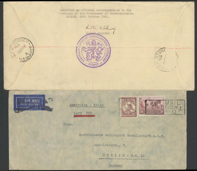 France, Germany, Switzerland, USA , etc, for second weight-step domestic mail, one on Avis de Reception card, one tied 'LATE FEE/ADELAIDE' & another 'T.P.O. 1 NTH WEST/NSW' both paying late fees, also lots of make-up usages for the airmail surcharge