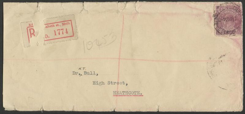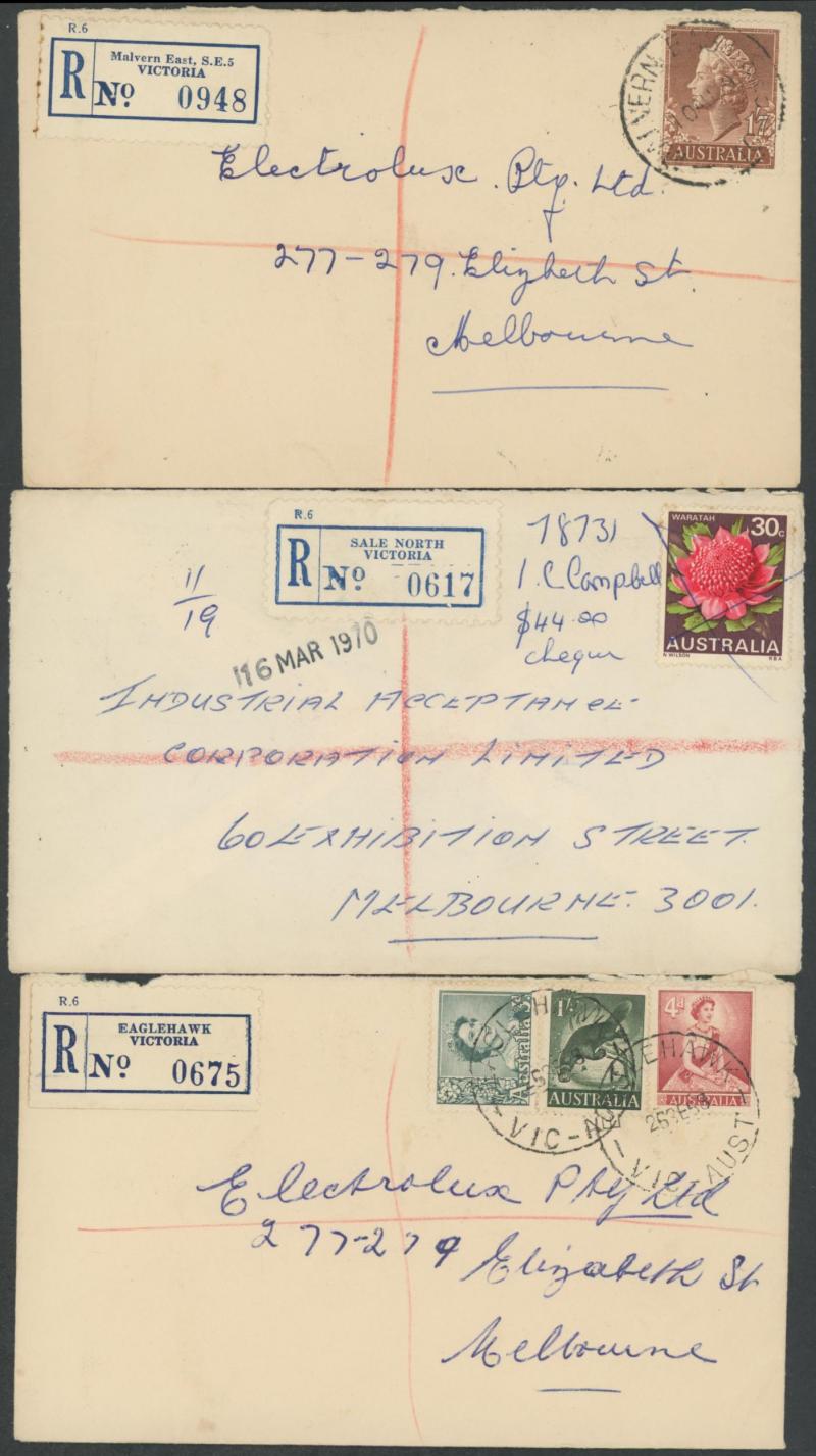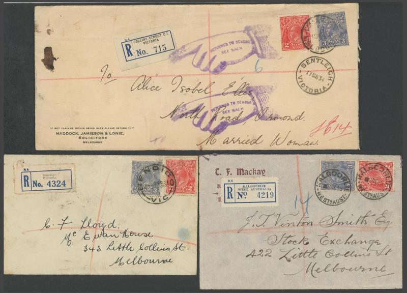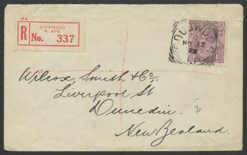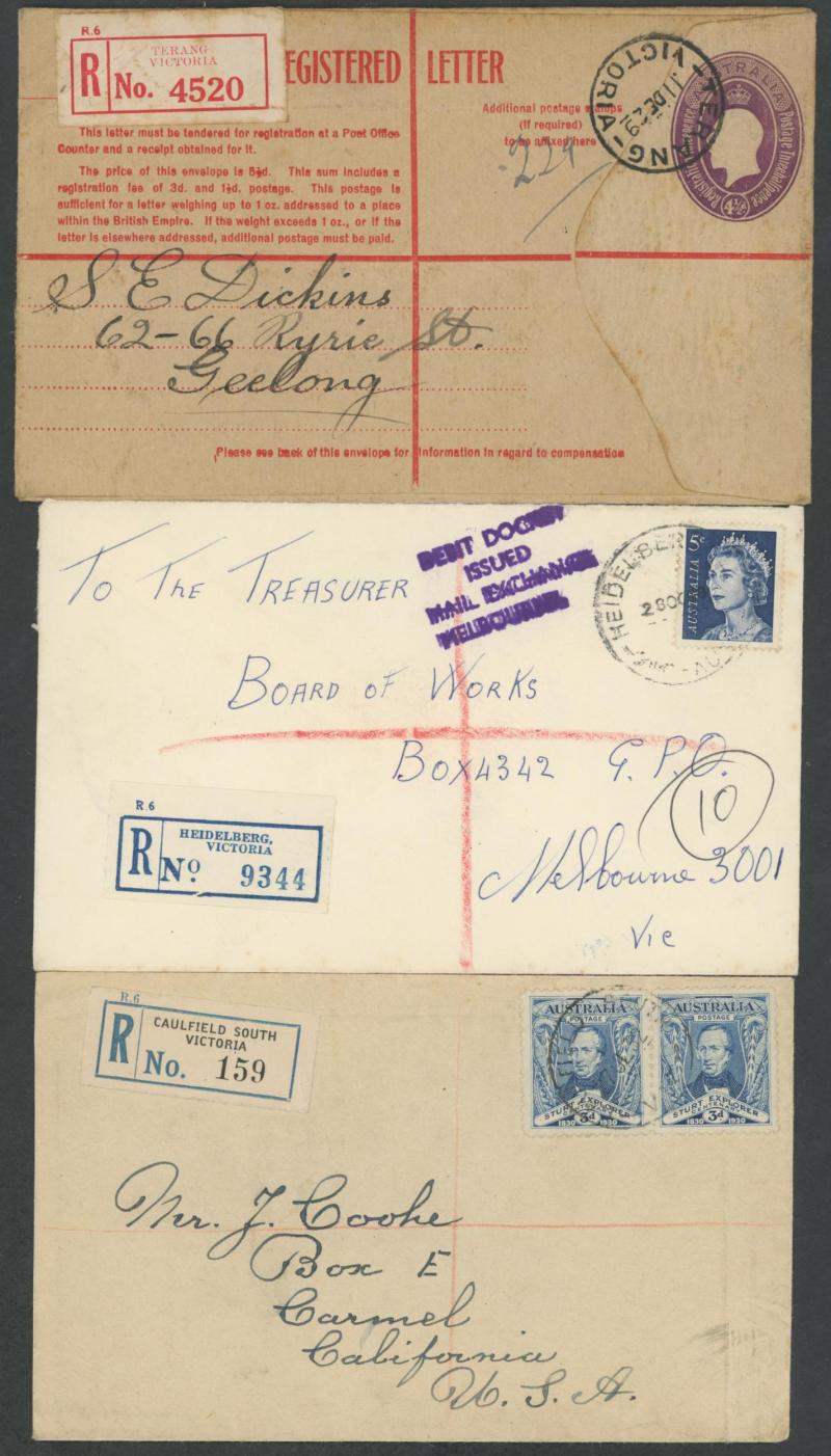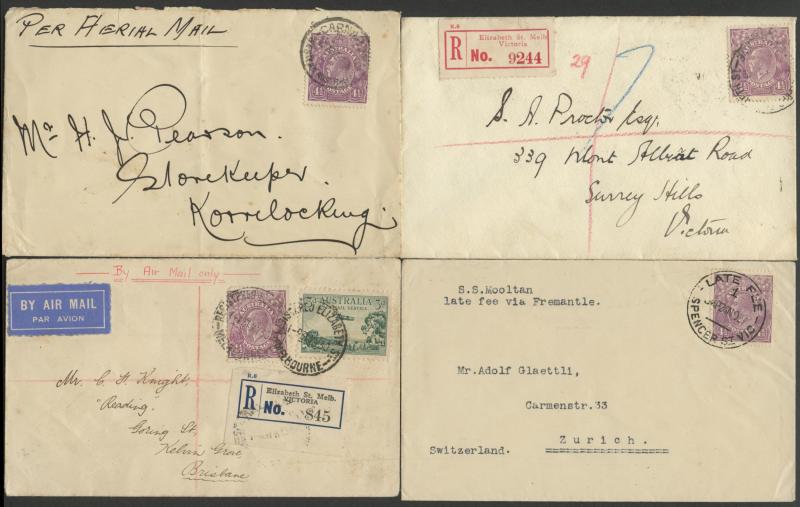 registration fee with 'GOODWOOD/SA' squared circle datestamp & red R label, for domestic letter plus airmail surcharge tied 'CARNARVON' cds, and for foreign letter plus late fee tied 'LATE FEE/SPENCER ST VIC' cds (½d convenience overpayment), also 3d