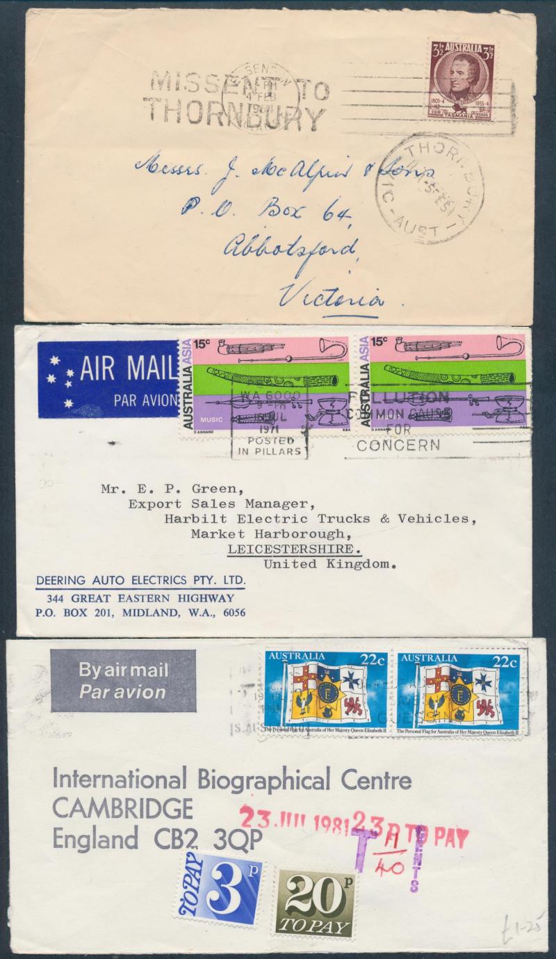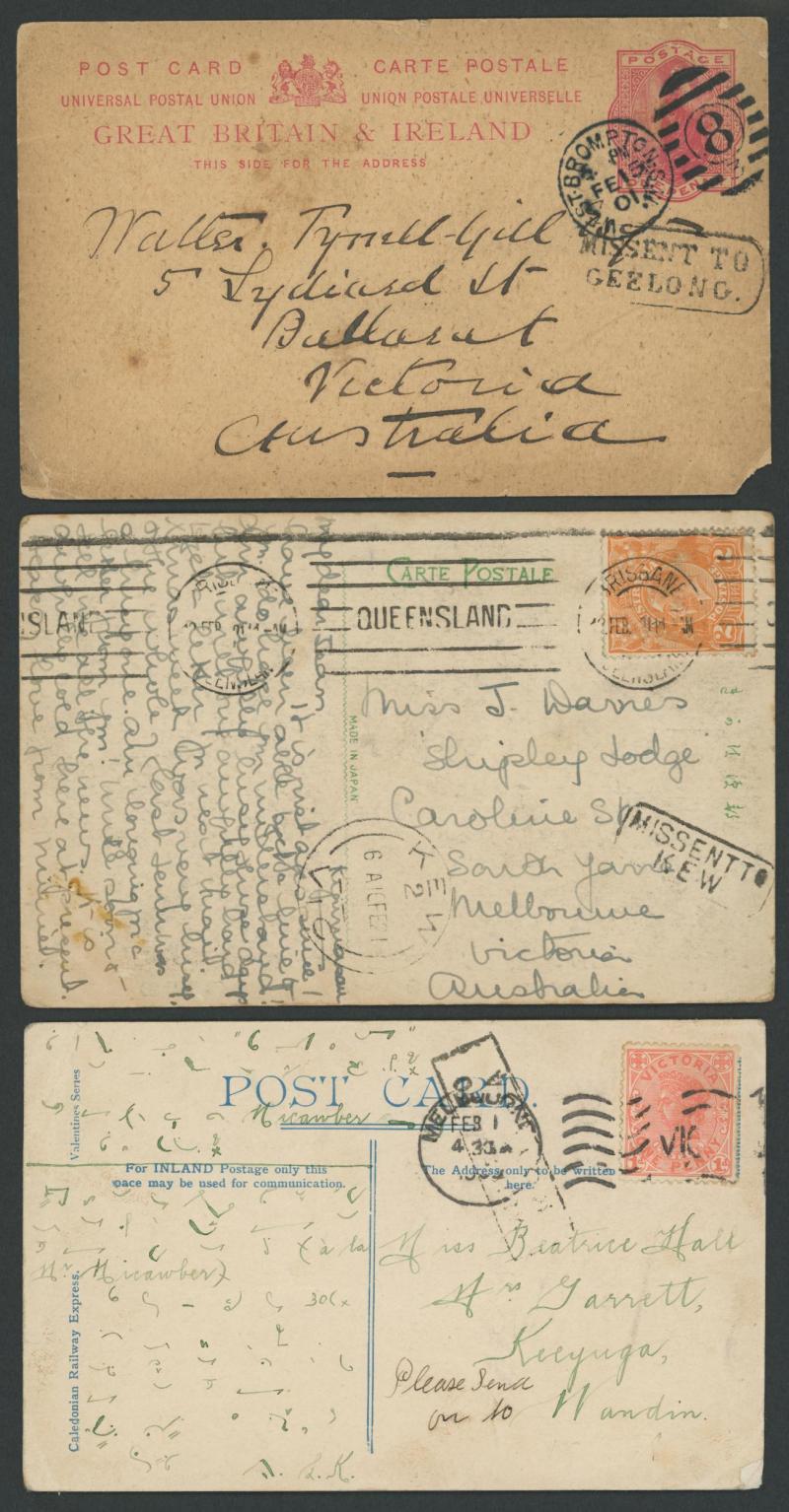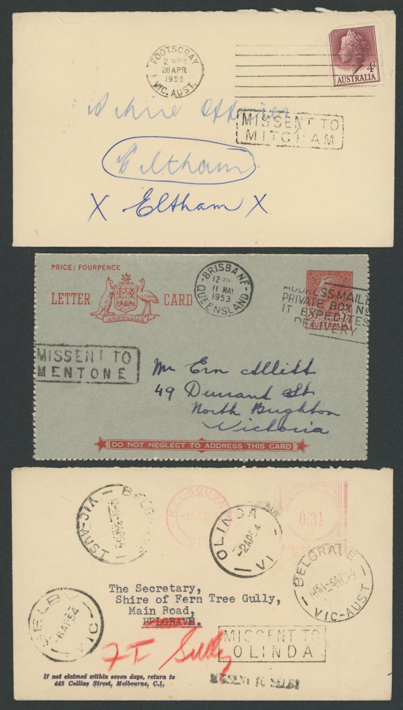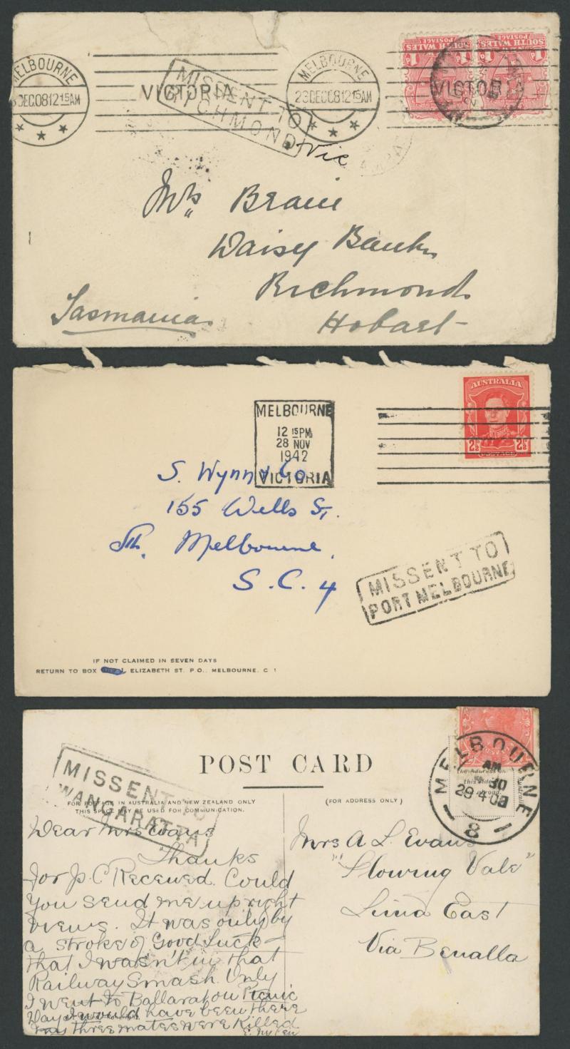 1901-58 selection with boxed 'MISSENT TO/...' handstamps of '.../DONCASTER', '.../FLEMINGTON' x2 (one taxed, '.../GEELONG' (1901
