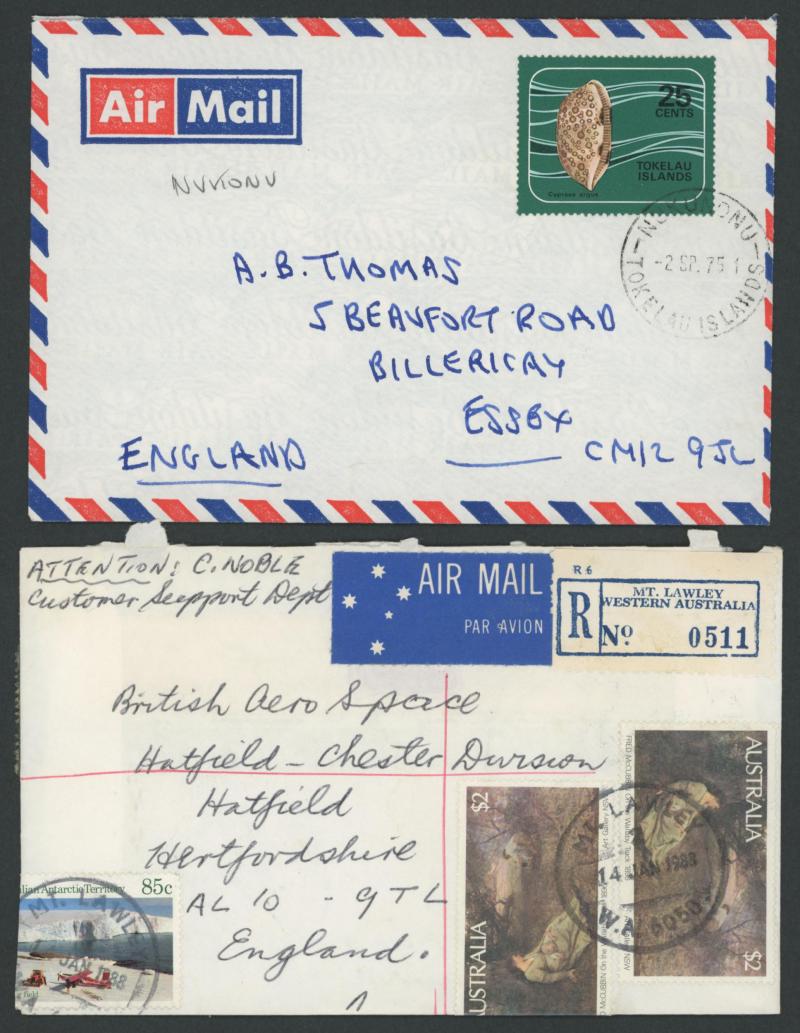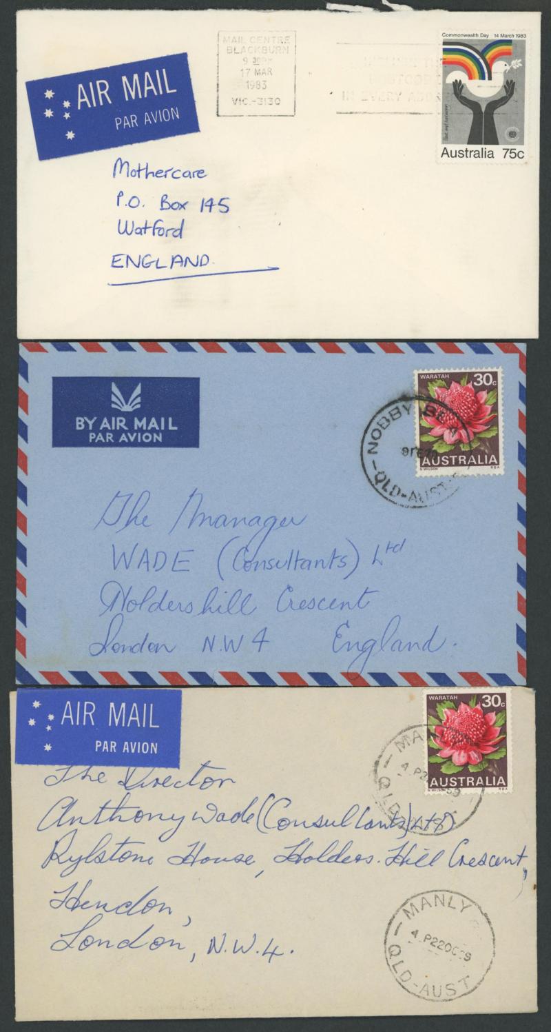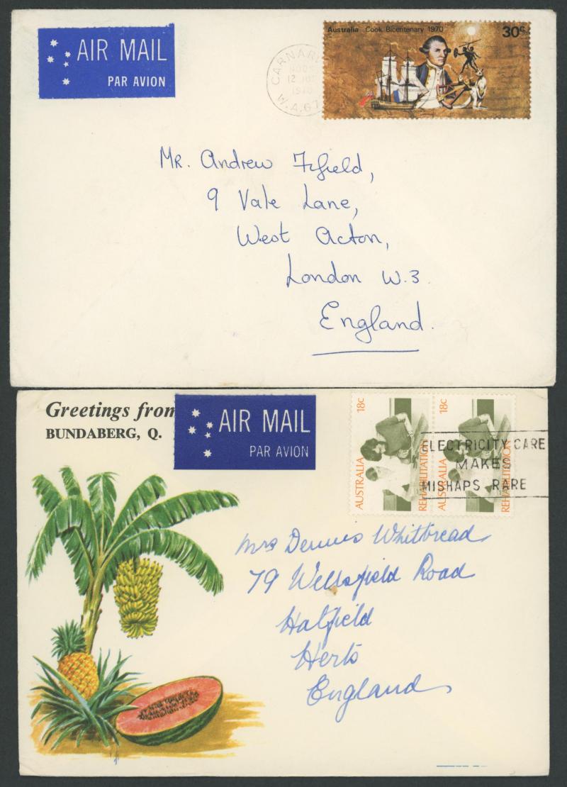 Box of commercial & philatelic covers mostly by air to England with a plethora of frankings including 30c Captain Cook, 35c Beef &
