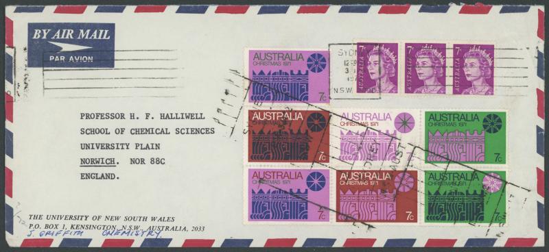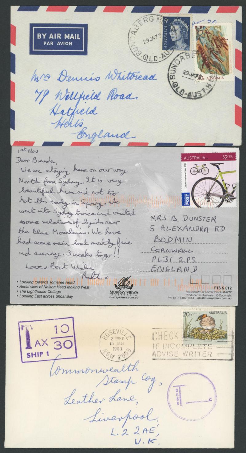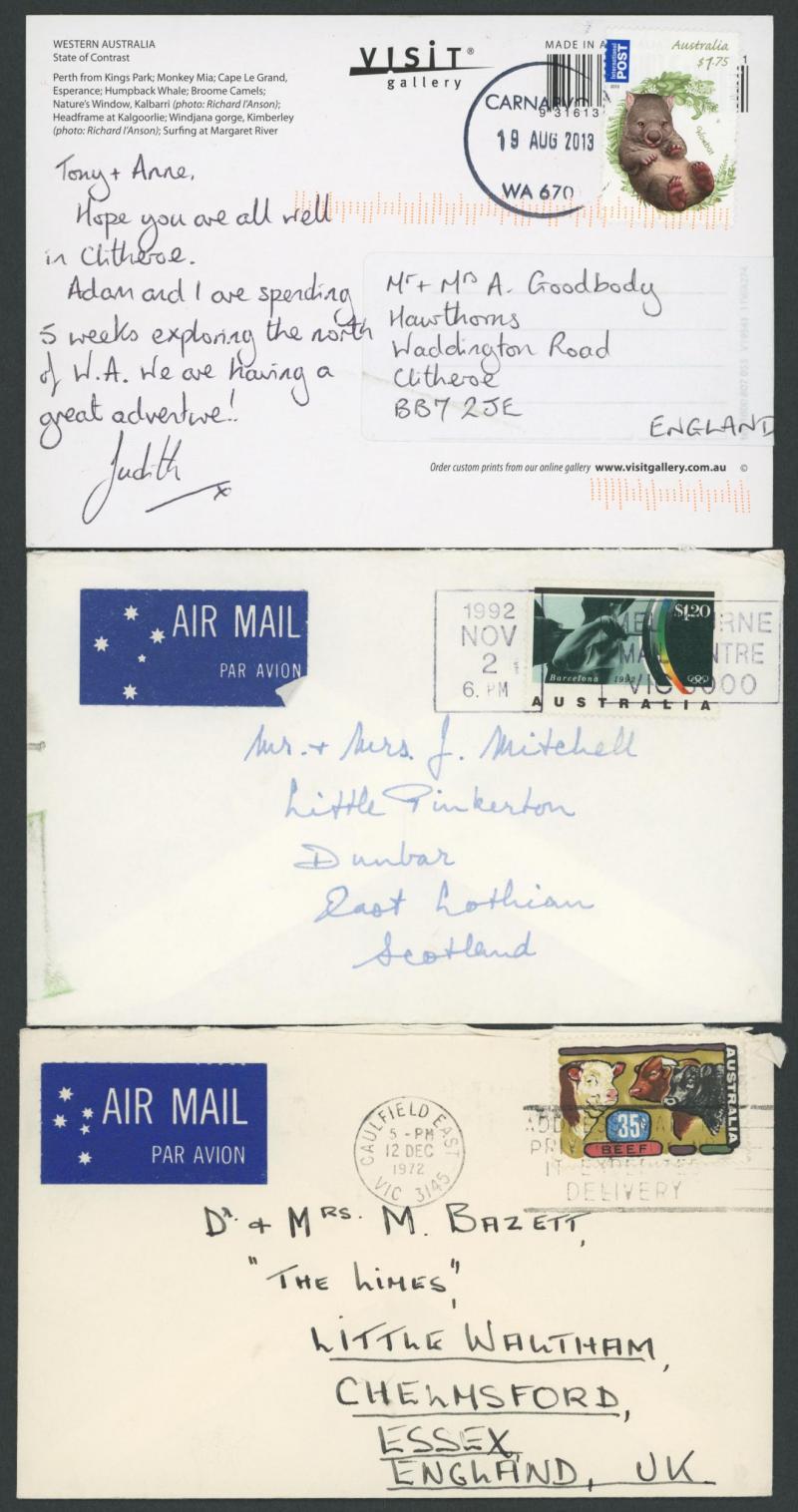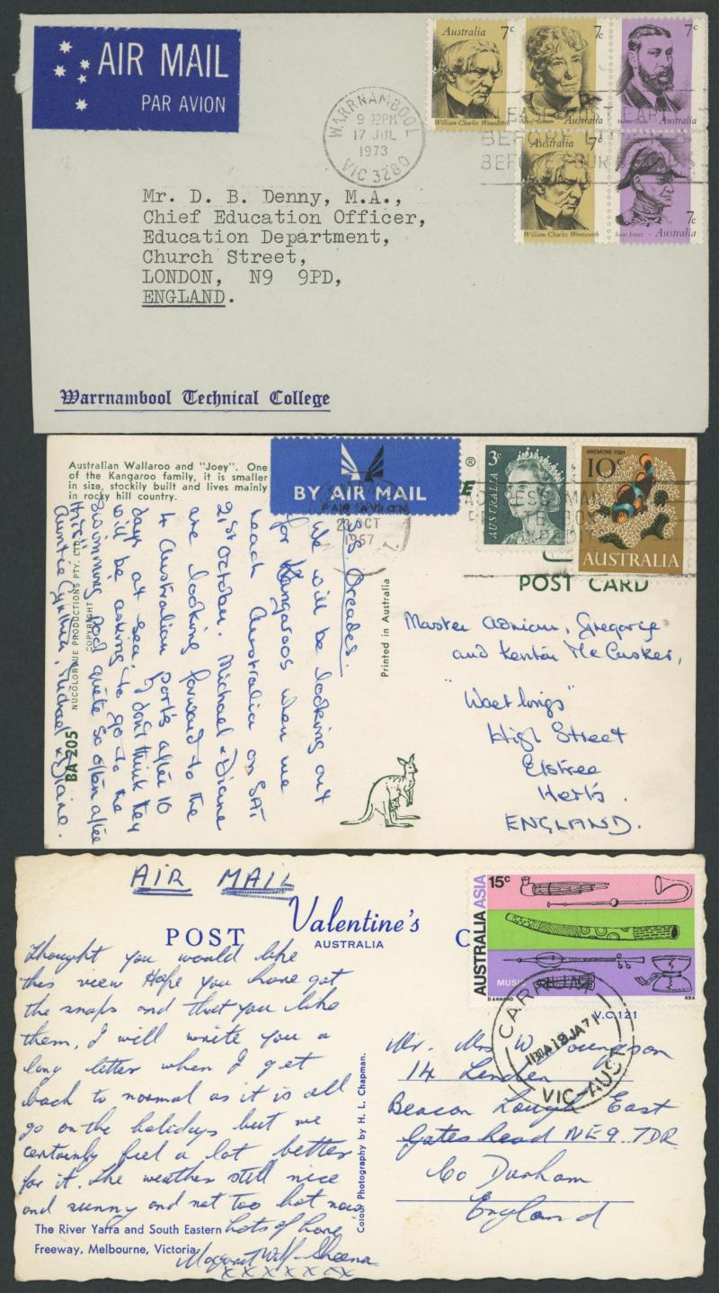 Box of commercial & philatelic covers mostly by air to England with a plethora of frankings including 30c Captain Cook, 35c Beef &