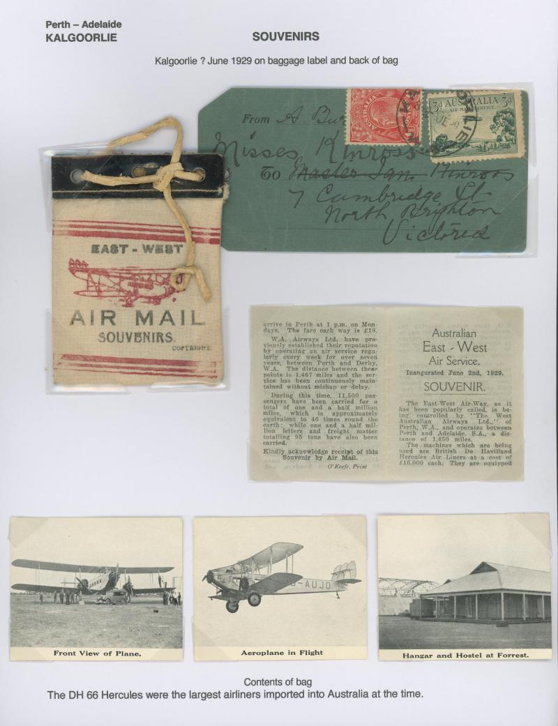Creek, 1929 East-West Air Mail souvenir mail bag (with contents) attached to a parcel tag from Kalgoorlie.