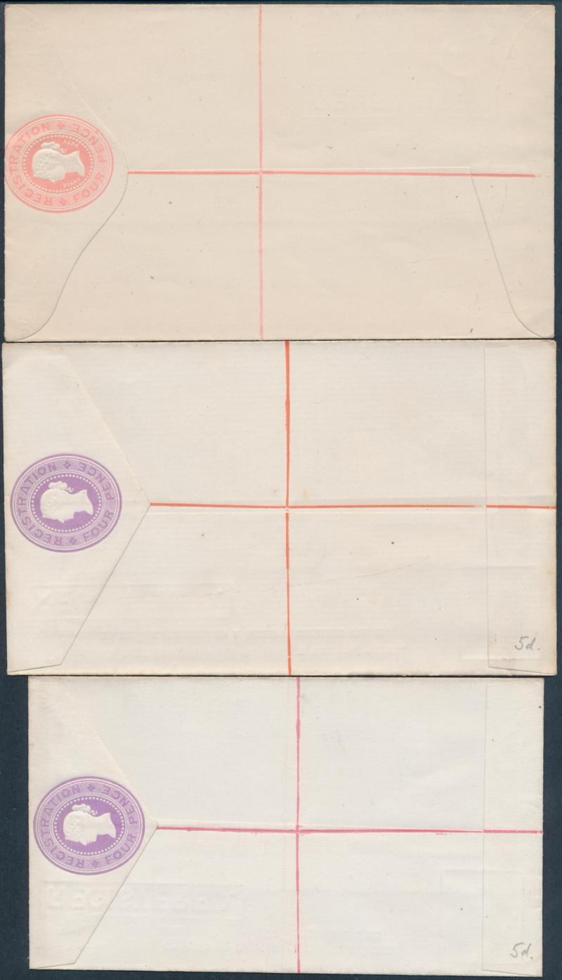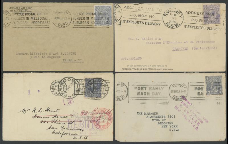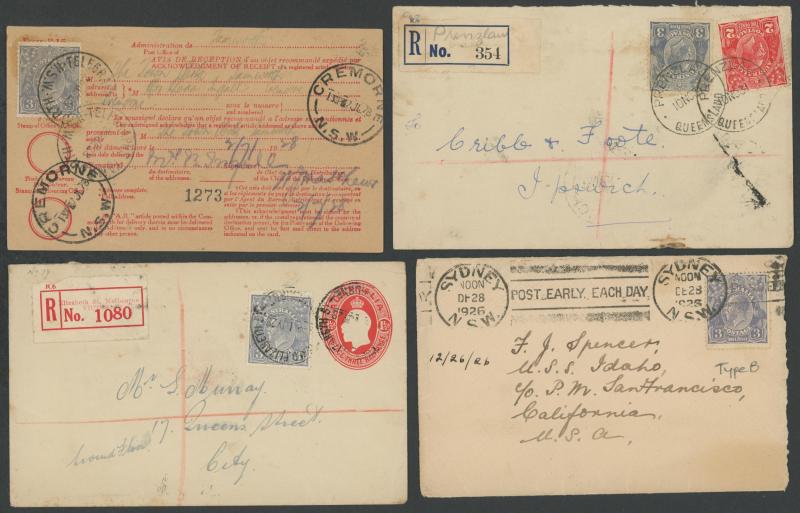 KGV Heads 4½d violet usages comprising solo frankings for domestic letter plus registration fee, for Empire letter rate to NZ plus