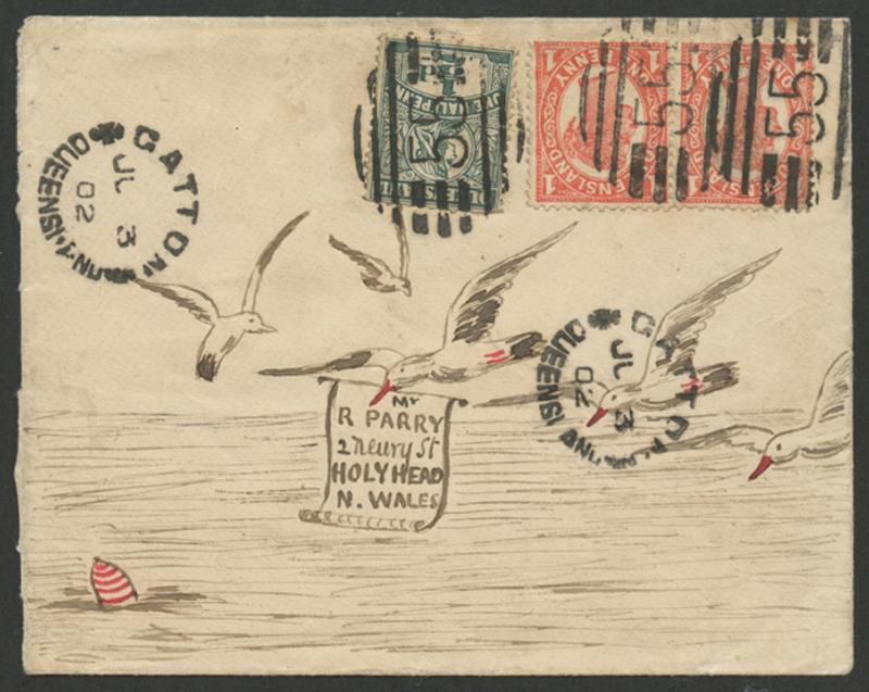 1902 (July 3) cover from the Parry Correspondence of hand-illustrated envelopes with pen & ink illustration of seagulls, to Wales