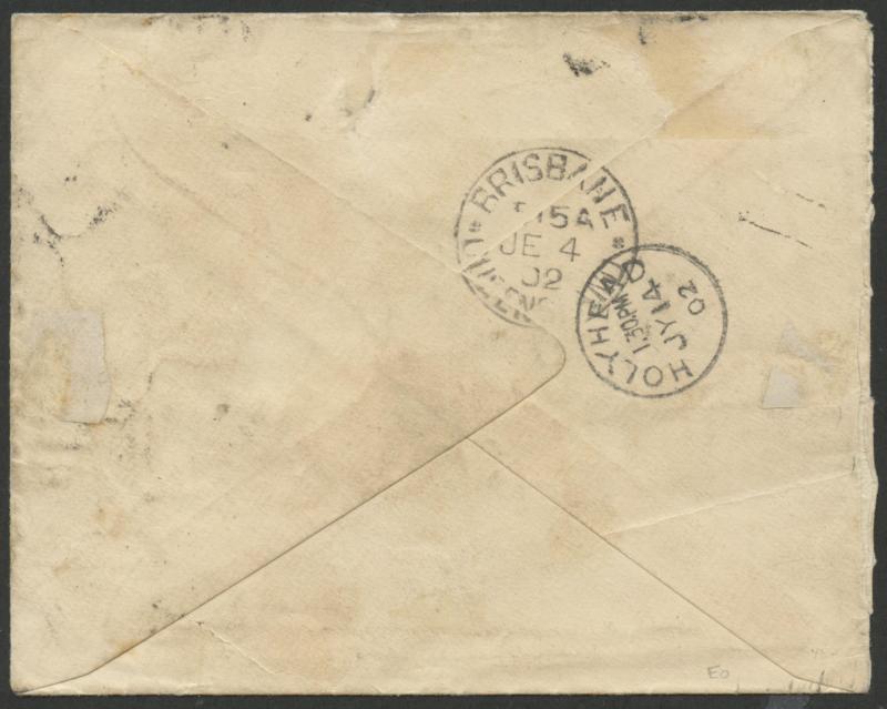 with ½d & 1d pair tied by superb BN '55' & 'GATTON/JL3/02/QUEENSLAND' cds below, Brisbane transit & 'HOLYHEAD/JY14/02' arrival backstamp. Most attractive. Ex Gerald Ellott. The sender was Commander John F Parry of HMS 'Dart', of the Royal Navy's