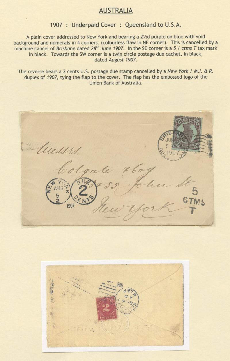 overweight cover to Yorkshire with 2½d rosine only & superb '5D/FB' handstamp of London (UPU rate introduced 1.10.1891), 1907 cover to USA correctly franked with 2½d purple/blue but curiously with very fine '5/CTMS' handstamp & US Postage Due 2c tied