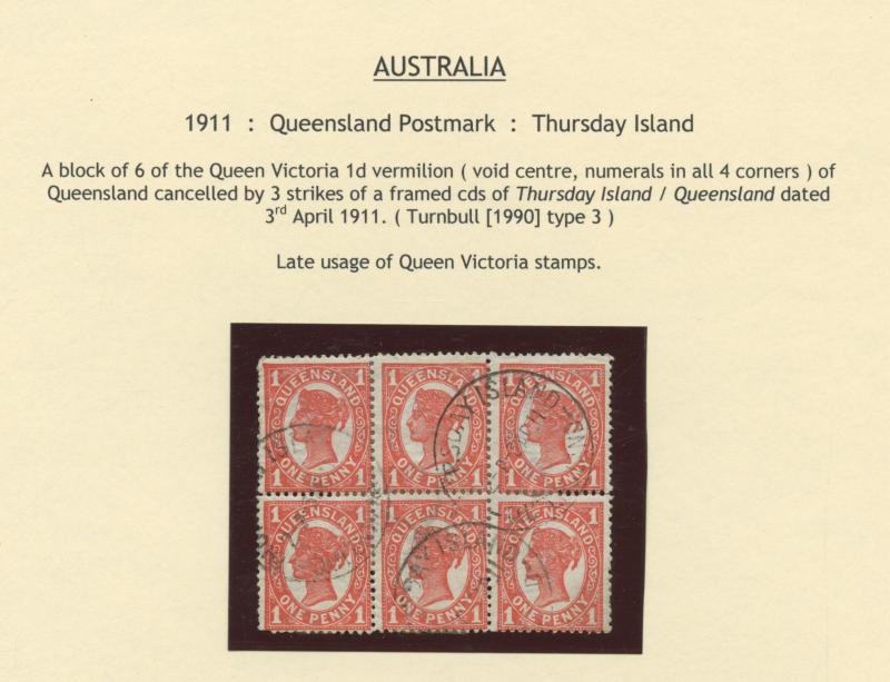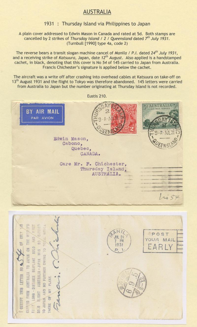 to the reverse, a few Commonwealth period postmarks, 1931 airmail 'THURSDAY ISLAND' to Canada via Japan with huge cachet on the reverse signed by the pilot "Francis Chichester", and Victoria 1856 entire to "Borough Distillery/London" with Woodblock