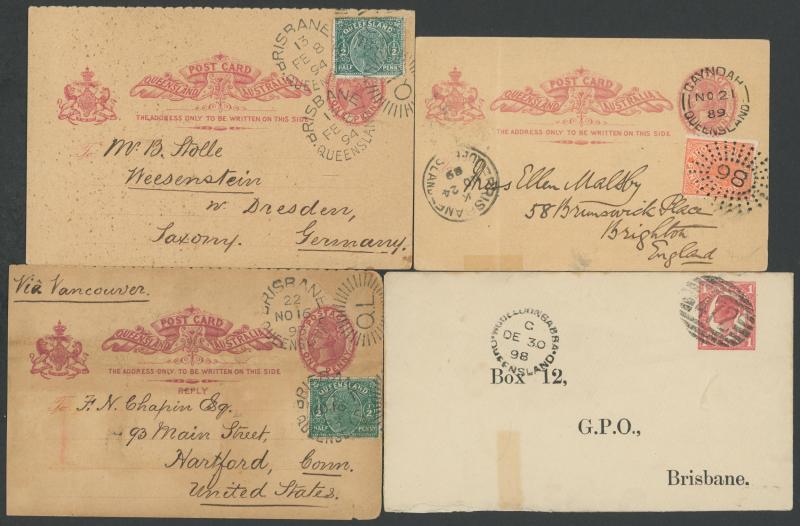 POSTAL STATIONERY: Eclectic batch including 1889 1d Postal Card to GB with superb 'GAYNDAH' cds & Rays '98', 1898 STO 1d Envelope