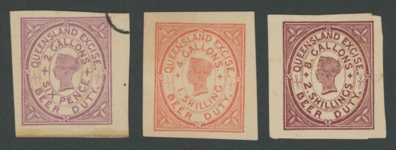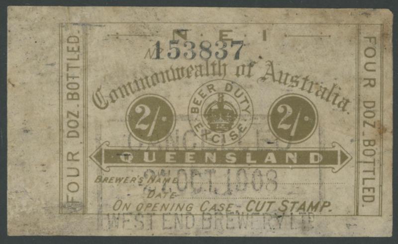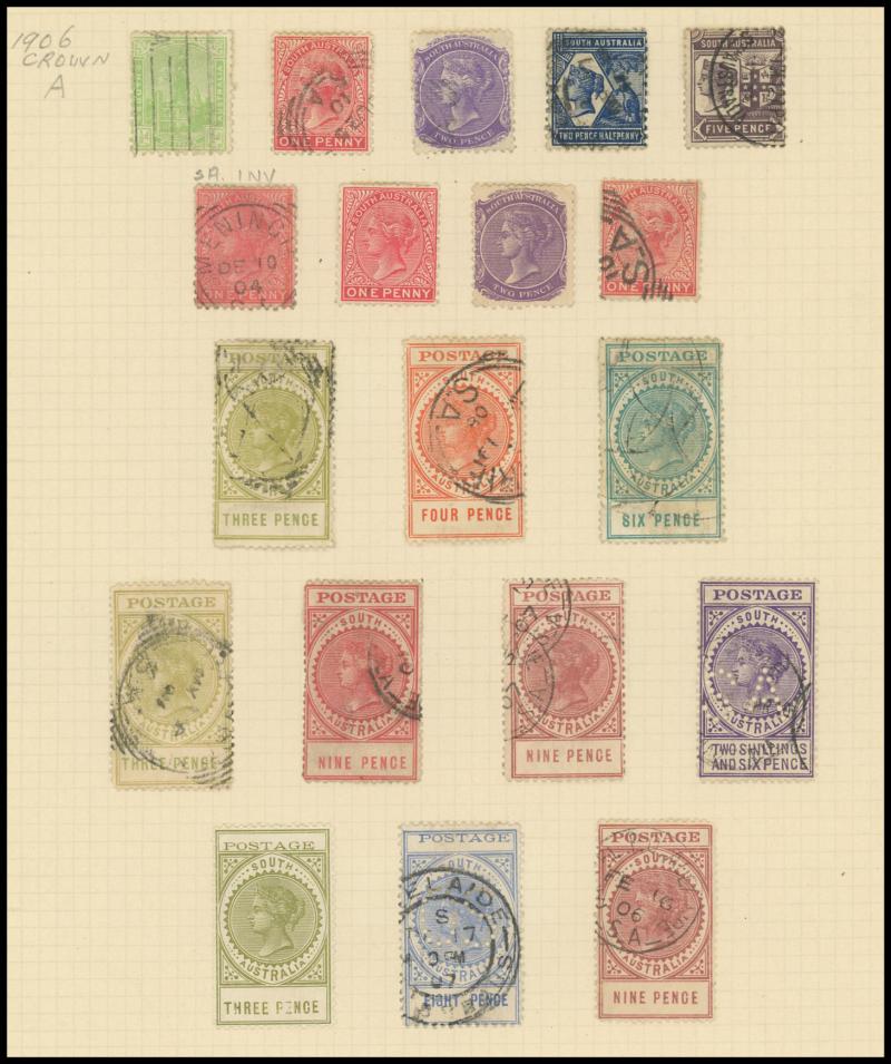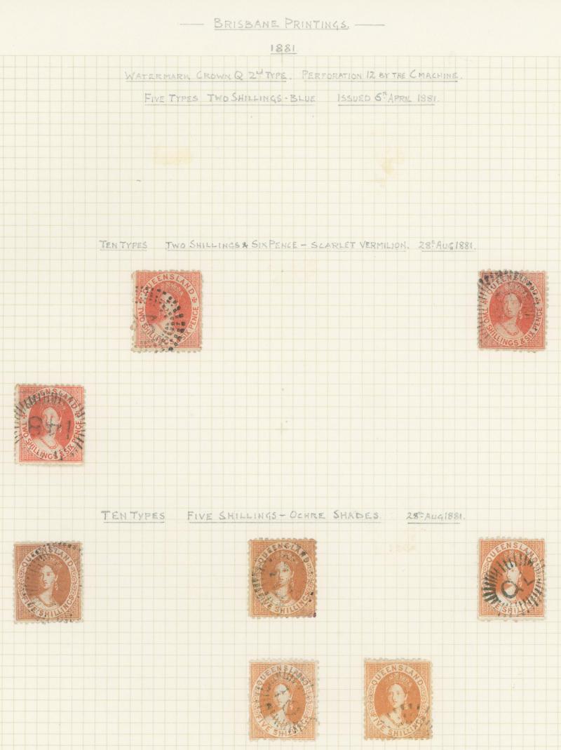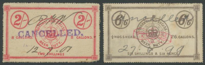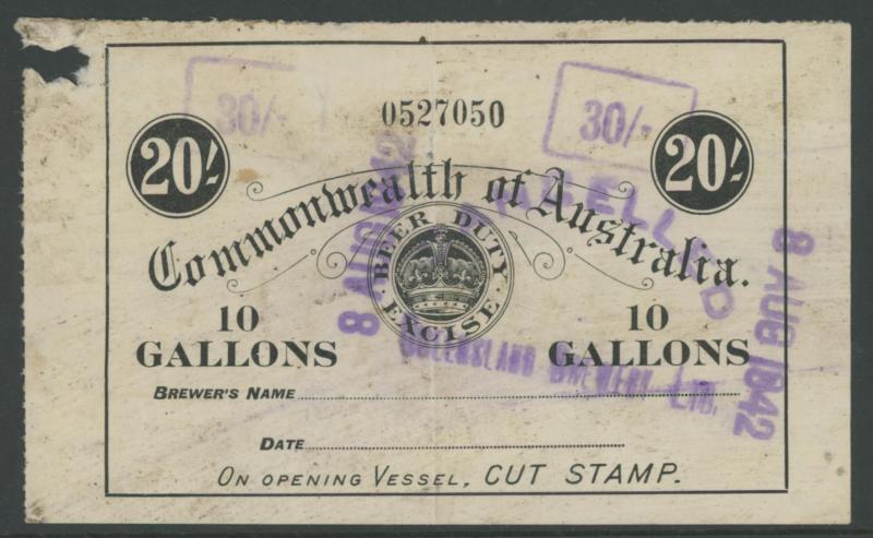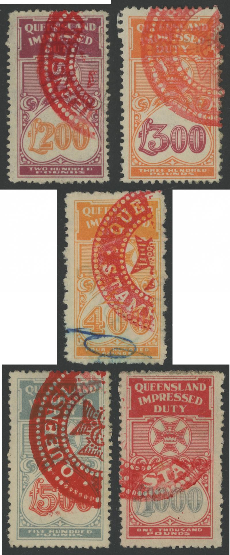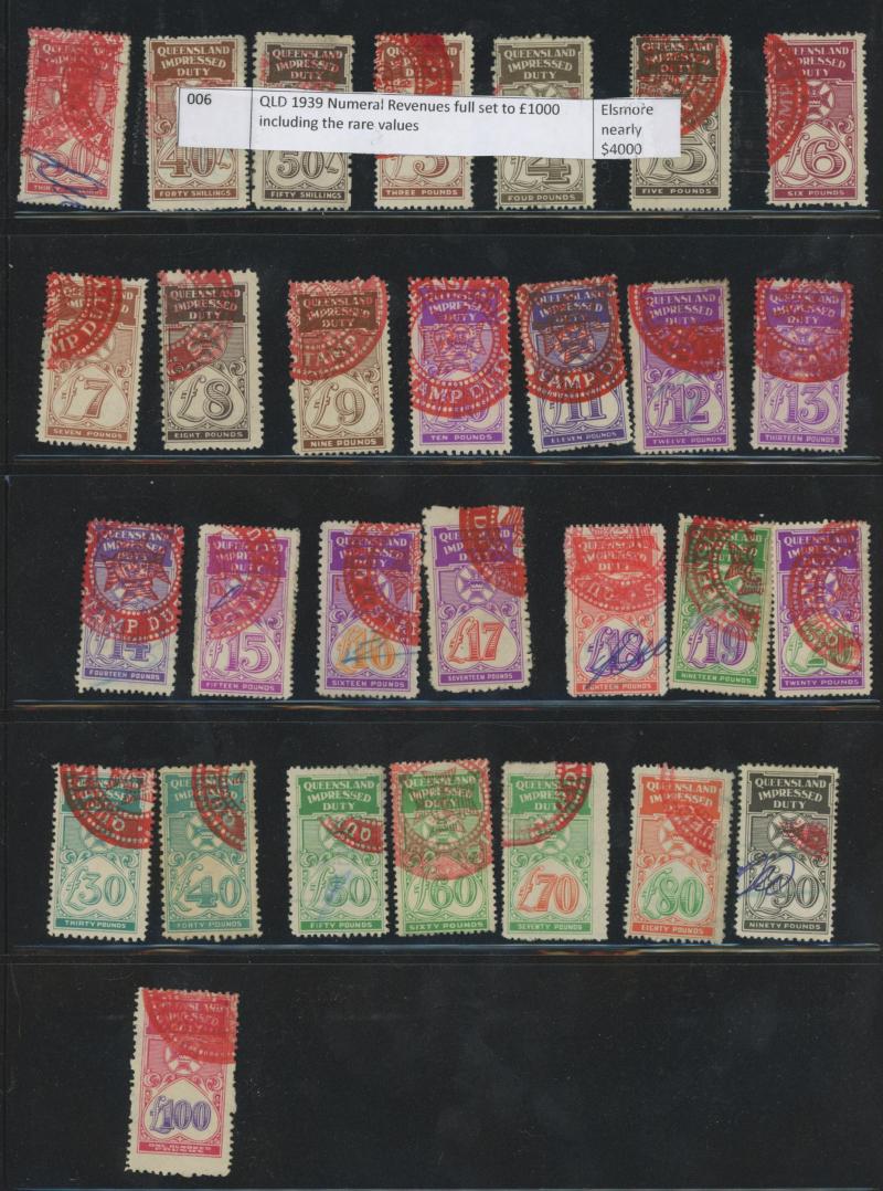 handstamp; 1903 Large Format 2/- (soiled; rare); BULK 1897 2/- & 6/6d; and Commonwealth of Australia 1942 boxed '30/-' in violet on 20/- black used in Queensland (fault at upper-left); Elsmore Online Cat $5000 approximately.