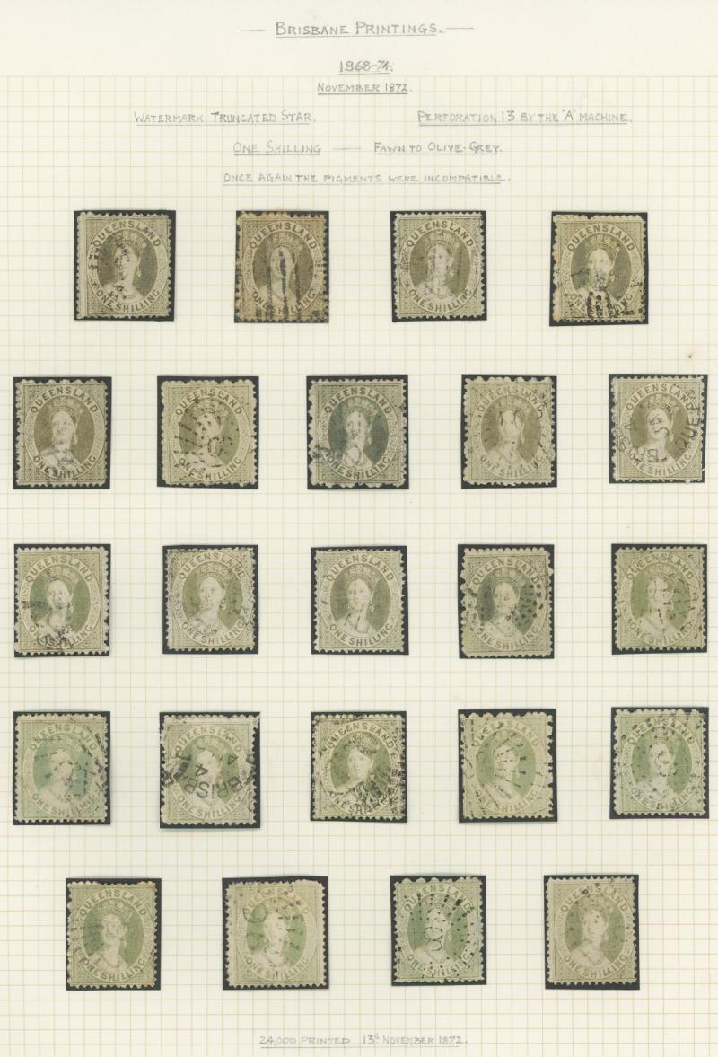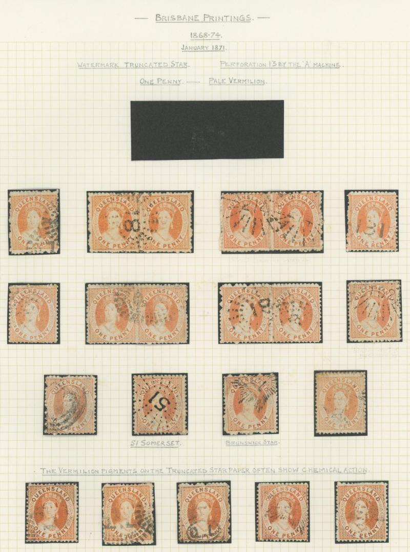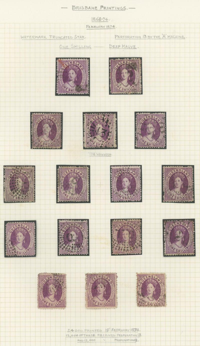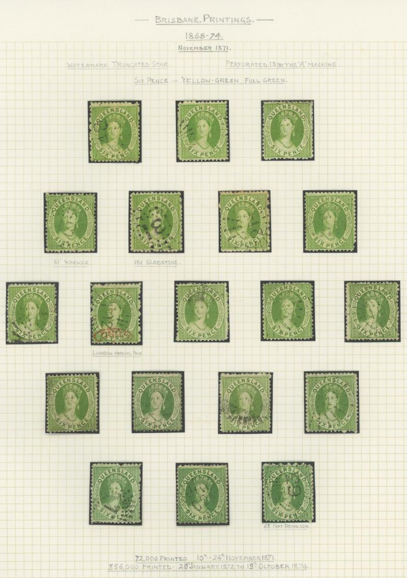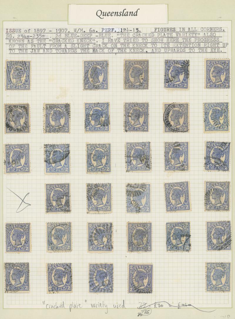 Q16d (SG 234a/235a) page of examples showing the progression of the flaw from the Earliest State x2 (rare) to the Latest State showing the Full Extent of the Crack, various cancels many clear or largely clear of the crack, Cat $2625+ (£1400+).