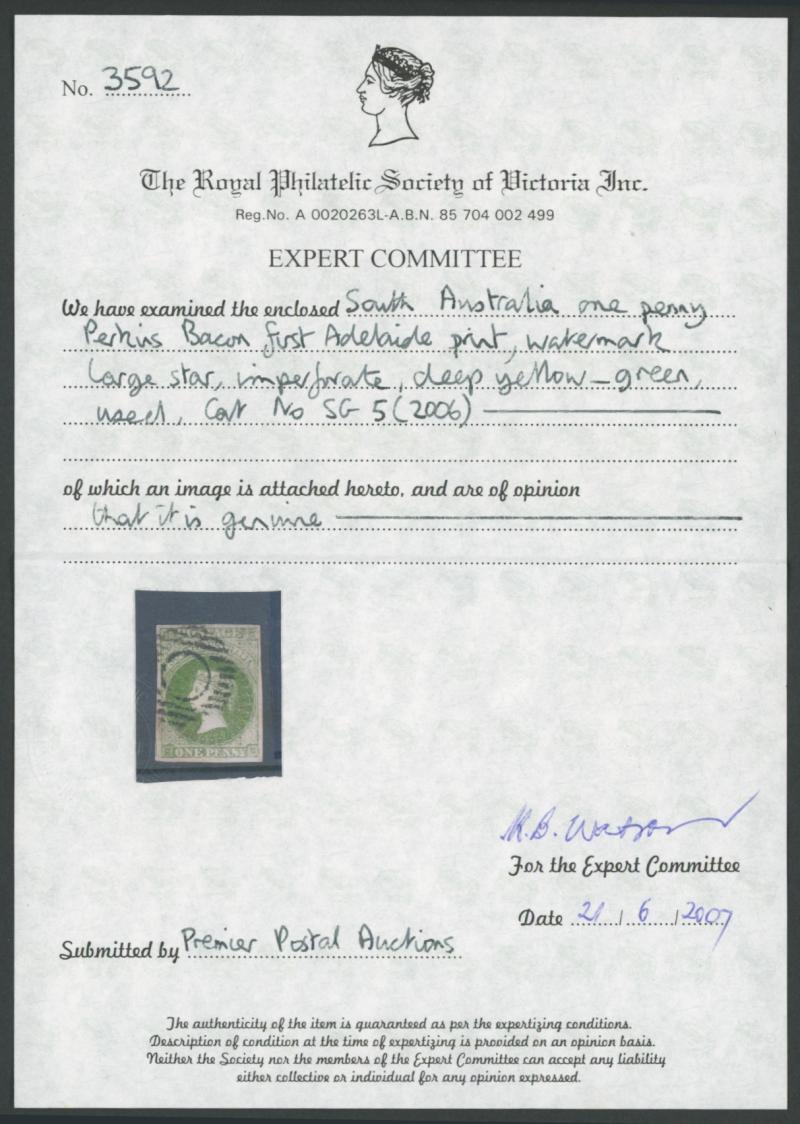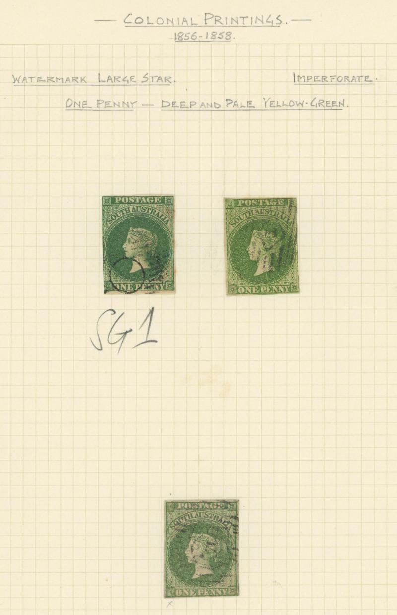 shade. Most examples in the market are, or are likely to be, SG 13 or 14 (now also amalgamated, as SG 13) with the roulettes trimmed-off. Genuine examples of the Imperf Adelaide Penny are much scarcer than the catalogue value would suggest] (Image1) (Image2)