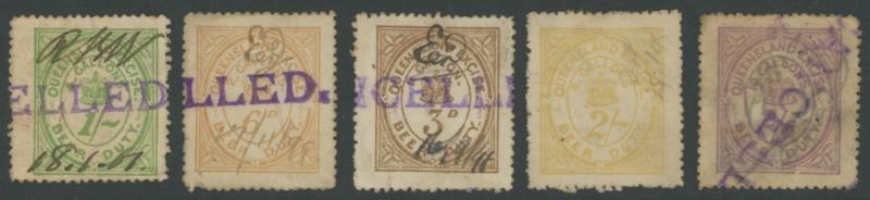 including the 1/3d buff-yellow; unrecorded at Elsmore Online, the 3d & 2/- with part-Papermaker's Watermark, all with chamfered-boxed 'CANCELLED' handstamp; 1898 New Design with Crown six values to 9/- all except the 2/- with seriffed 'CANCELLED'