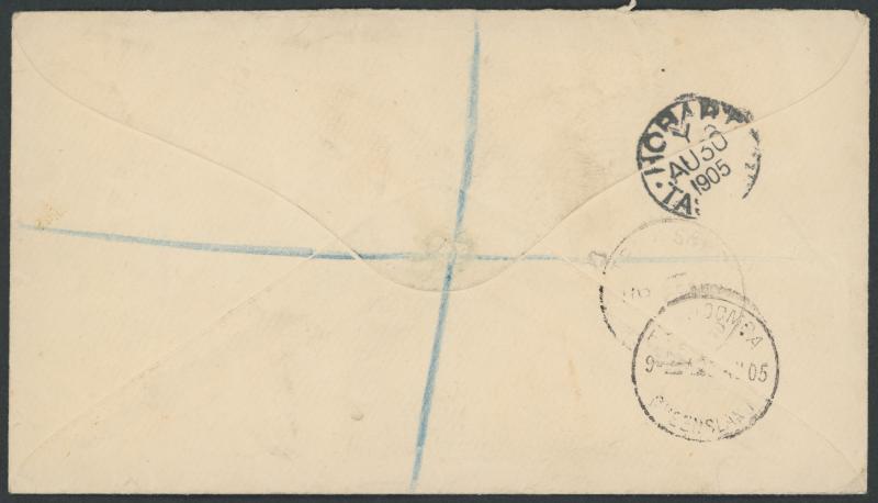 self-censored by him, to Brisbane with light but clear octagonal 'ARMY POST OFFICE/WAKKERSTROOM/NATAL FIELD FORCE' datestamp, superb 'T'-in-circle & very fine '1D' handstamps, light wrinkles & minor fault on the reverse. Lt Felix Bernard Theodore