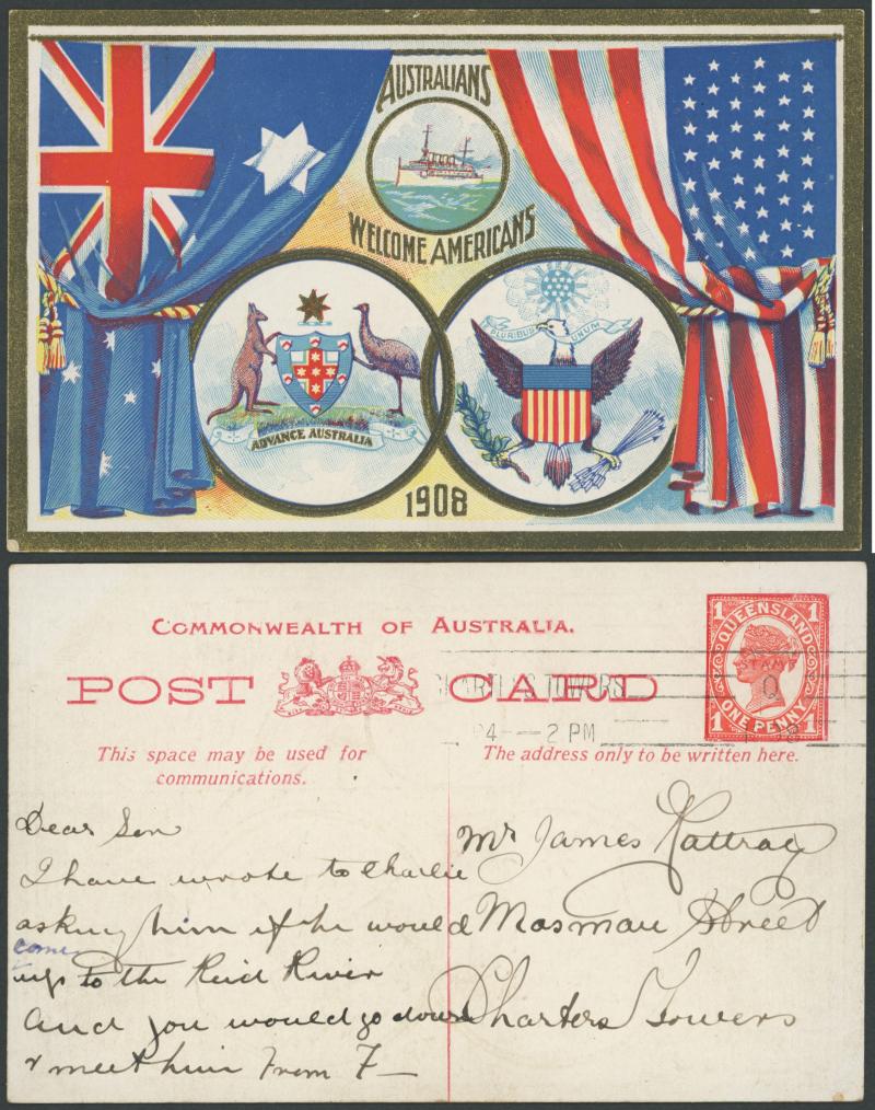 POSTAL STATIONERY: Postal Card 1908 Visit of the American Fleet 1d unused, and another local social usage with scarce 'CHARTERS
