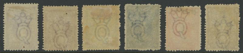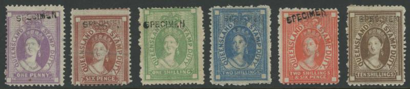 POSTAL FISCALS: 1866-68 Wmk Large Crown/Q 1d, 6d brown, 1/-, 2/-, 2/6d, 10/- & 20/- (ink mark on the face) all with sans-serif