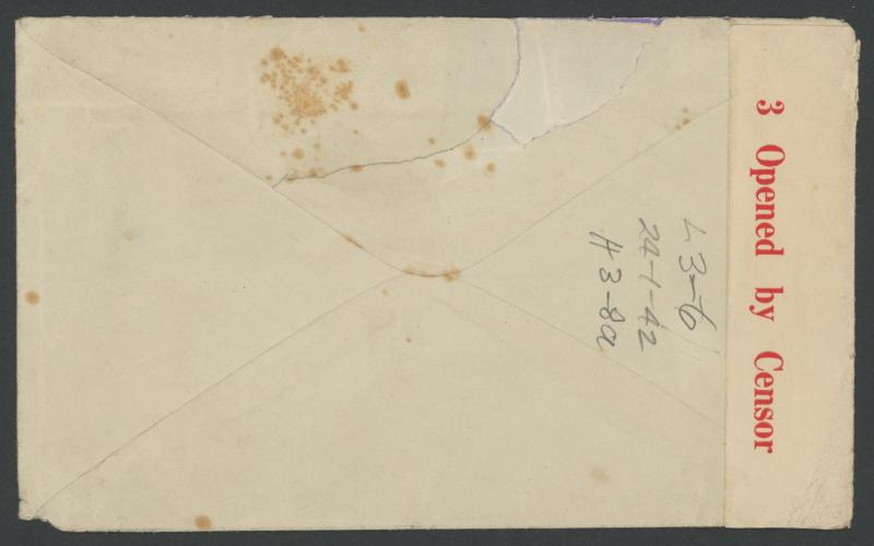 '5½d' on 5d Ram strip of 3 & KGVI 3d, Melbourne censor label & cachet, some toning mostly on the reverse. Rated RRR. RO 31.5.1904; PO 28.4.1914; closed 31.10.1956. [9km SW of Trafalgar, near Mirboo North] (Image1) (Image2)