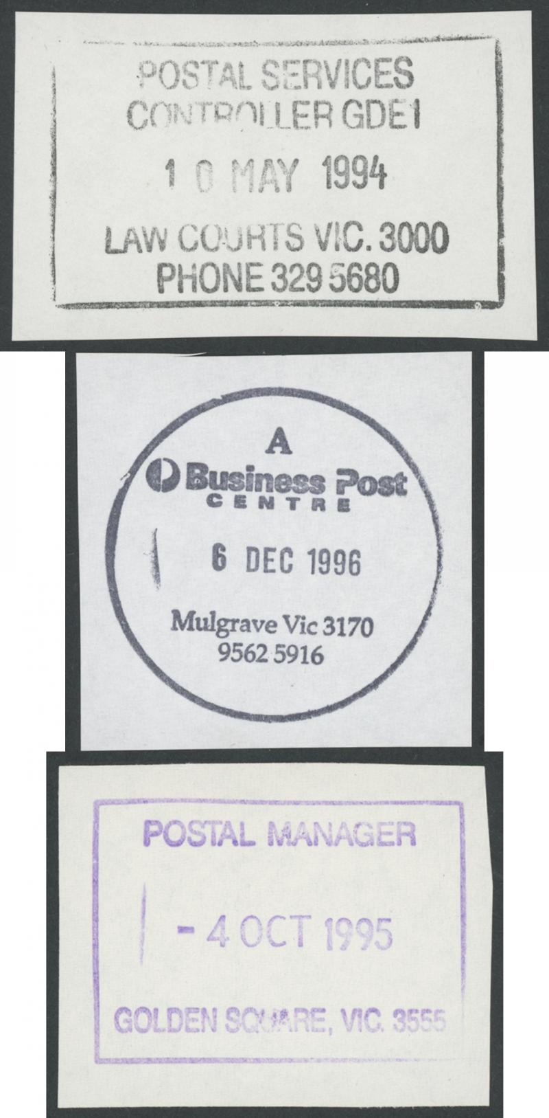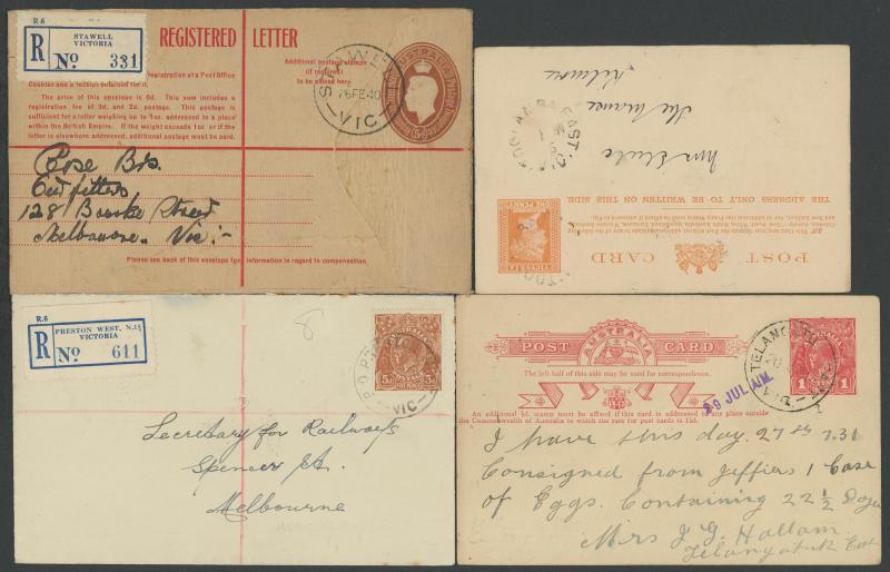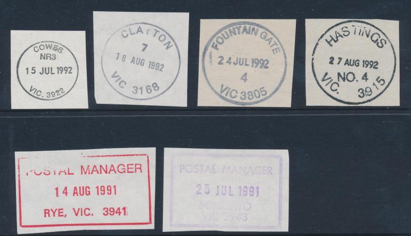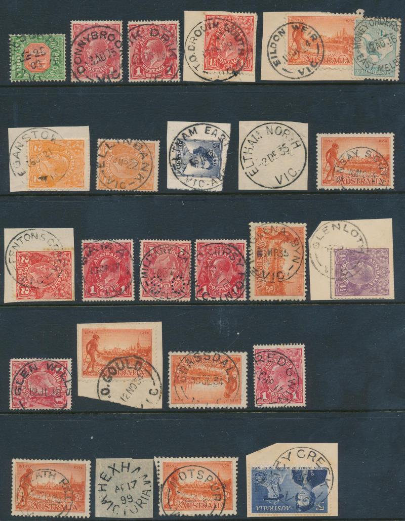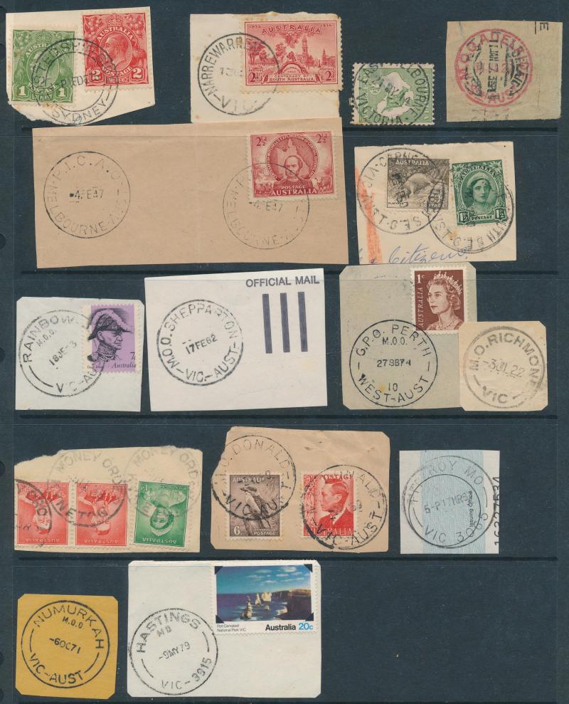 'M.O.O./ELIZ ST/MELBOURNE' (1945), superb oval 'POST OFFICE/ ELWOOD S3' (1964), triple-oval 'KERANG/VIC' (1940, OHMS registered), etc, mostly fine to very fine.