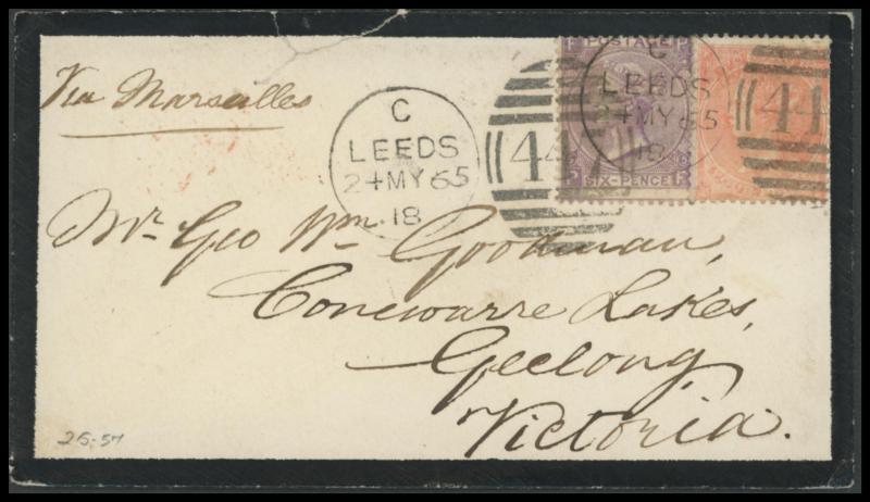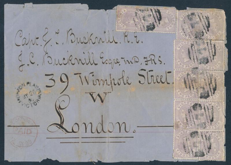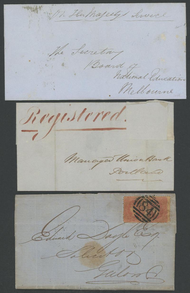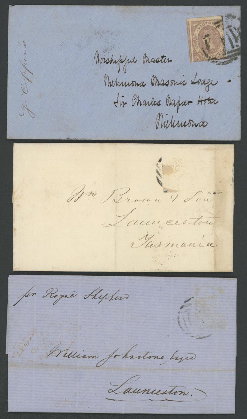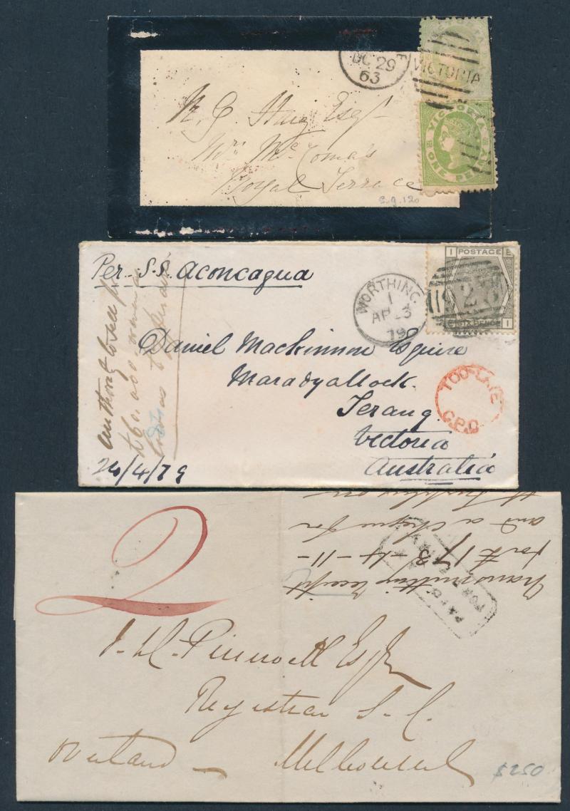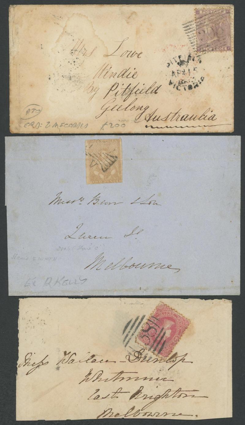 (1863), 'CONNEWARRE' (1863, on GB mourning cover), superb 'DURHAM OX' (1869), 'KILMORE' (1860, on the face), overinked 'PENTLAND HILLS' (1859), fair 'REEDY CK' (1860) & a couple of others, condition variable.
