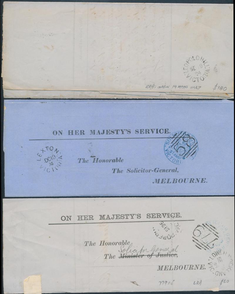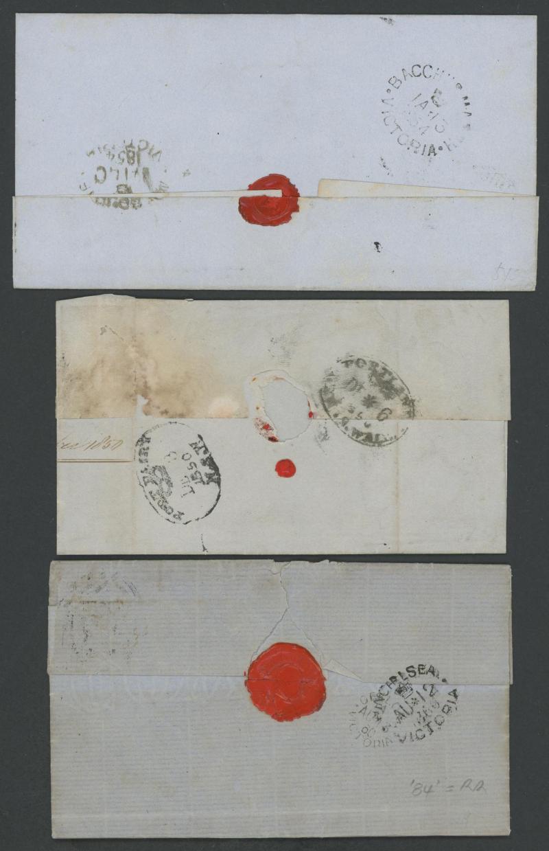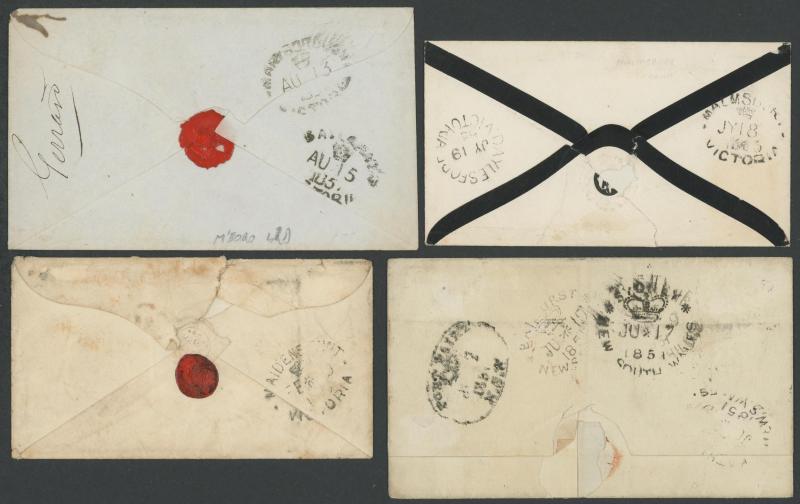 Crowned-Oval backstamps all-different selection on 1845-65 outers entires & covers including 'BACCHUS MARSH' (1854 OHMS), 'BENALLA'