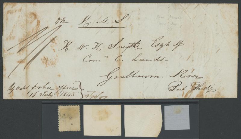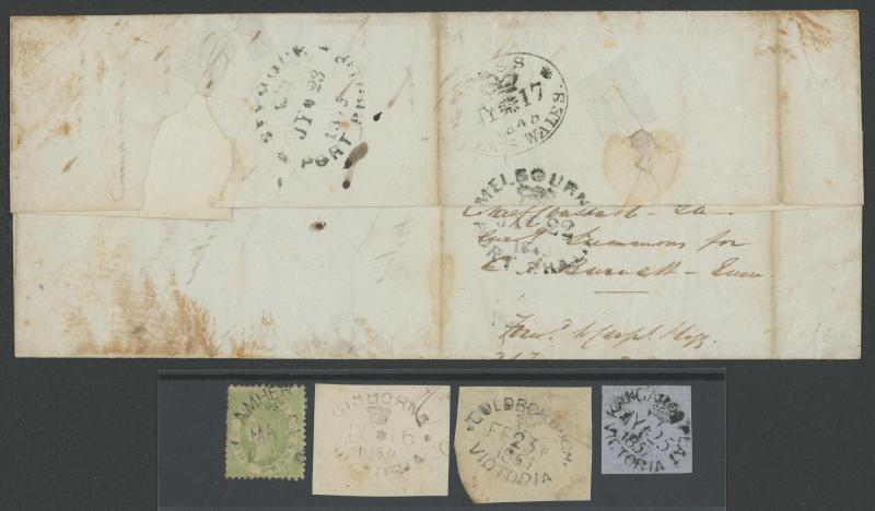 framed 'PORT FAIRY/NSW' (1851, stamps removed), framed 'PORTLAND/NSW' (1850, stamps removed), 'SEYMOUR/PORT PHILLIP' (1845), 'WINCHELSEA' (1860, with superb BN '84' on Beaded Ovals 4d pair), plus 'AMHERST' on 1d Netted Corners and pieces with