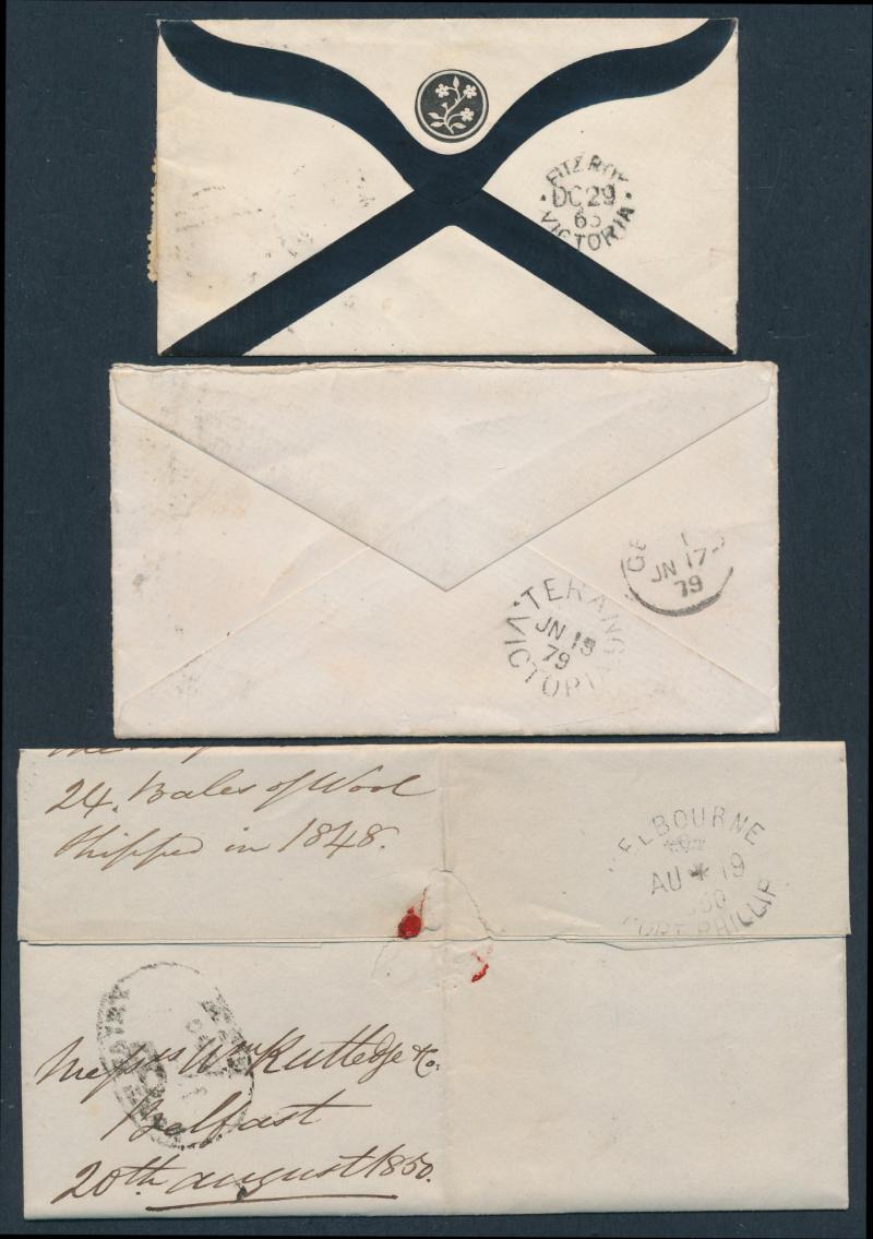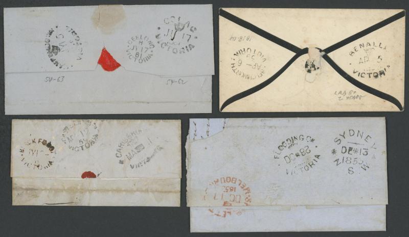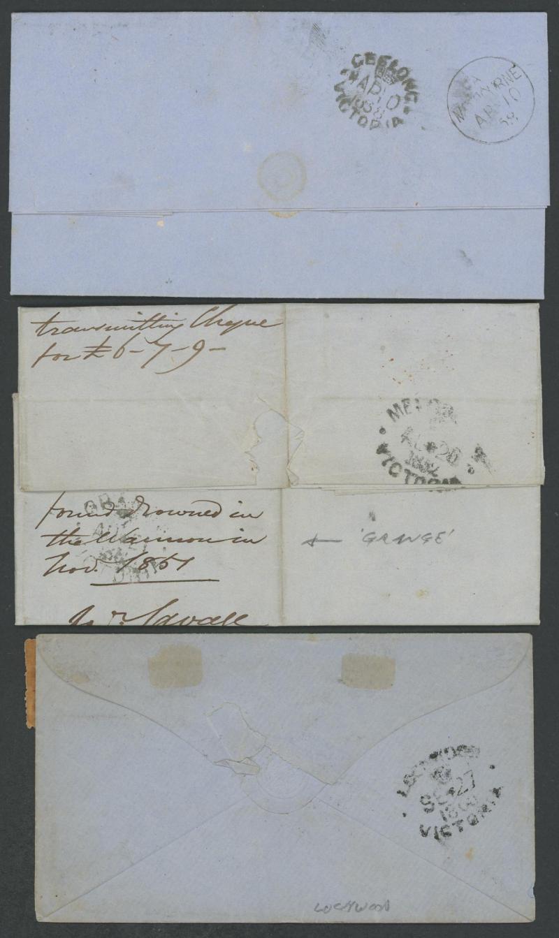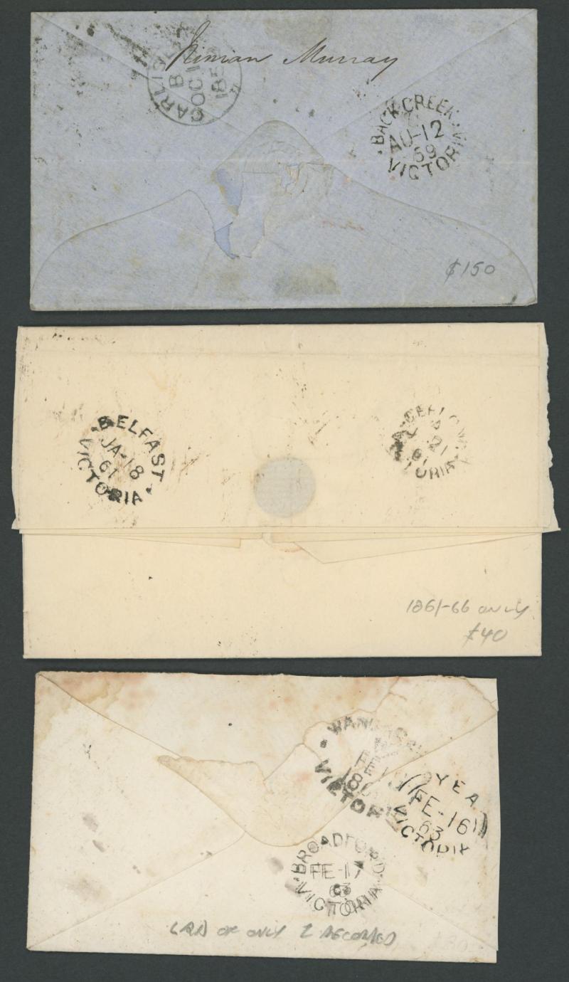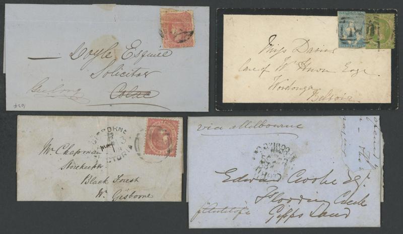 (1859, with 3d Half-Length + 1d Emblems), 'CAMPERDOWN' + 'COLAC' (1861), 'GISBORNE' (1859, on the face with 'CARISBROOK' & uncrowned 'BLACK FOREST' backstamps), 'FLOODING CREEK' (1853, stamp removed), 'GRANGE' (1852, with boxed 'THE GRANGE/POST PAID'