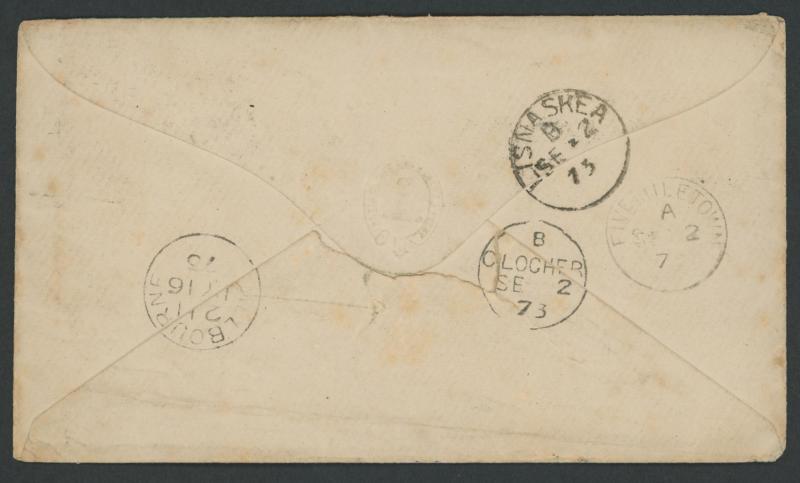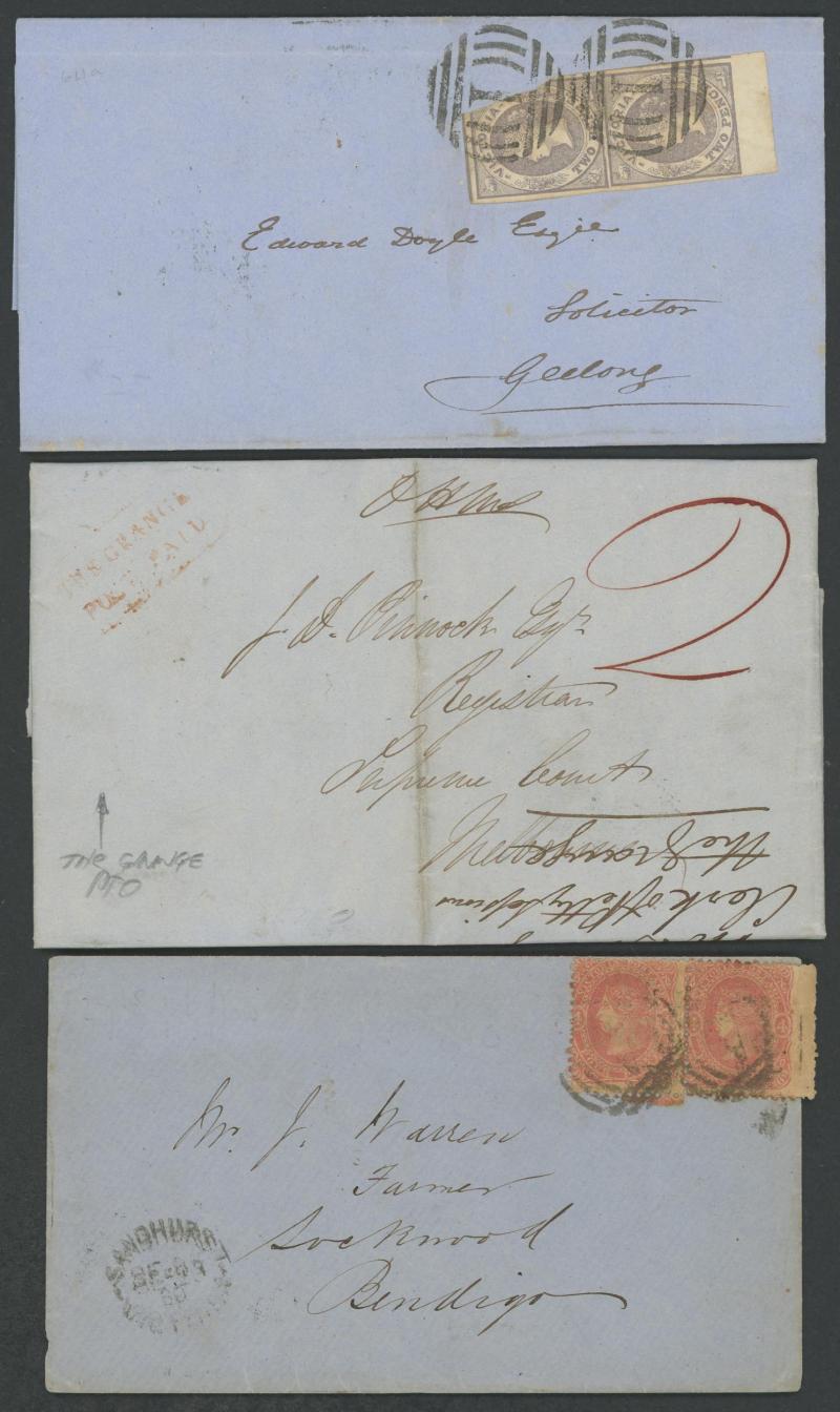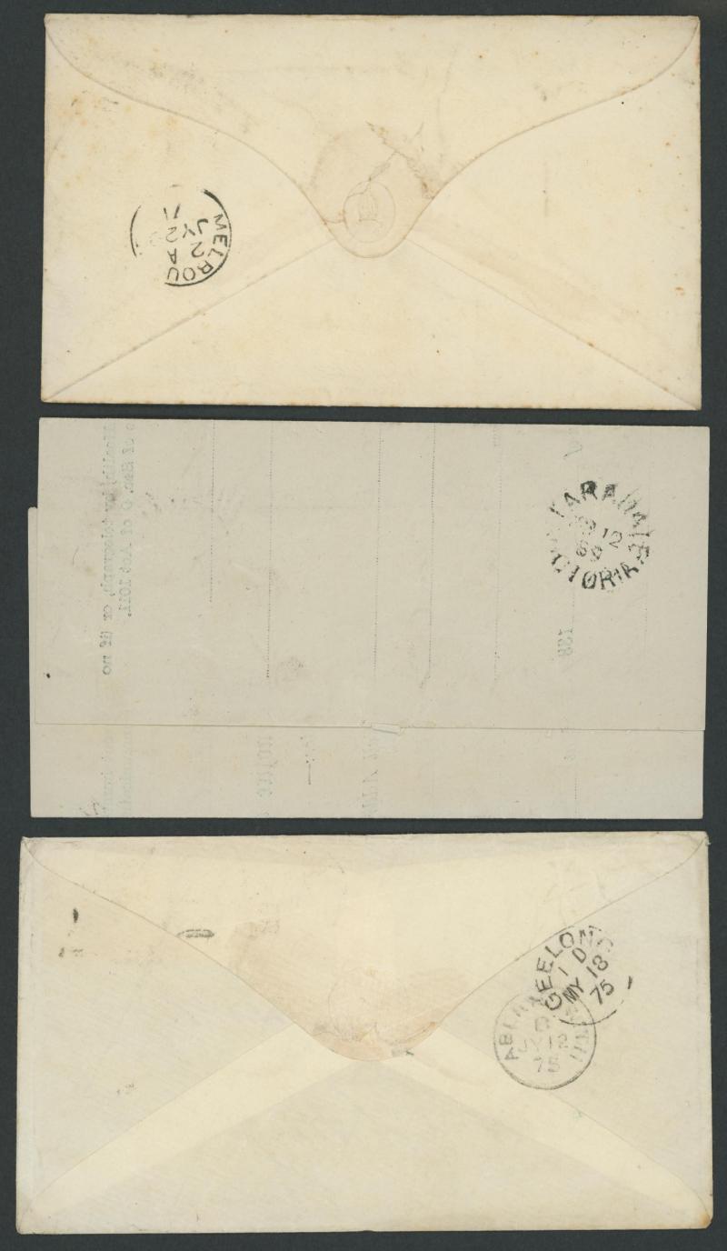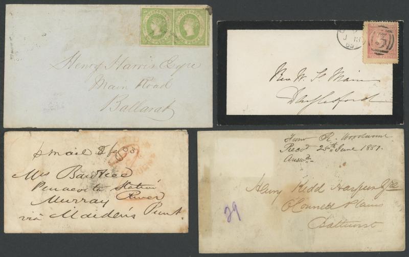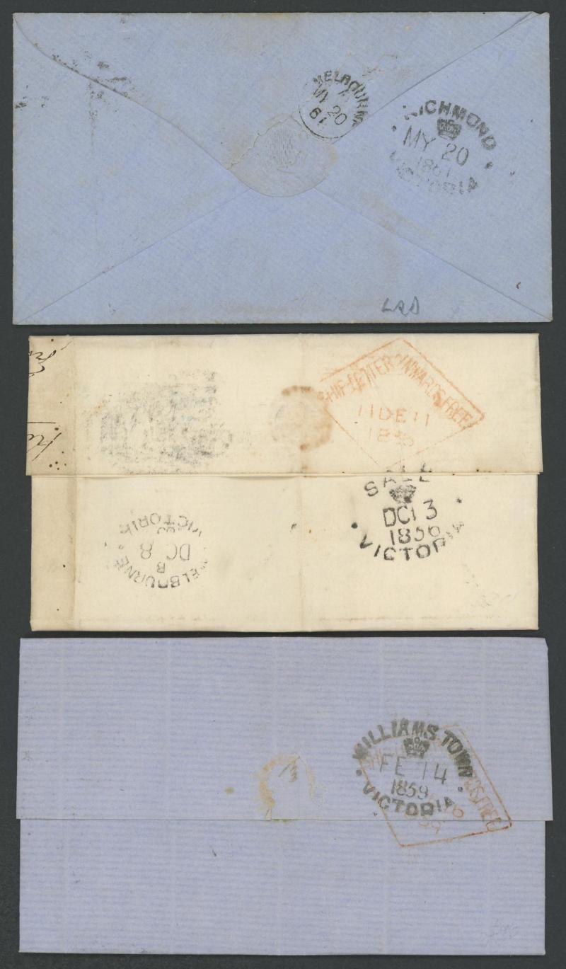 (1859, with 3d Half-Length + 1d Emblems), 'CAMPERDOWN' + 'COLAC' (1861), 'GISBORNE' (1859, on the face with 'CARISBROOK' & uncrowned 'BLACK FOREST' backstamps), 'FLOODING CREEK' (1853, stamp removed), 'GRANGE' (1852, with boxed 'THE GRANGE/POST PAID'