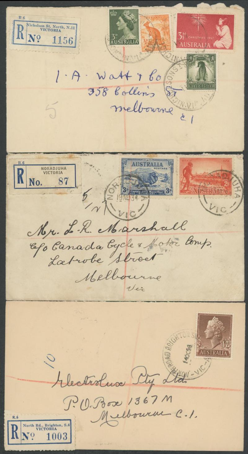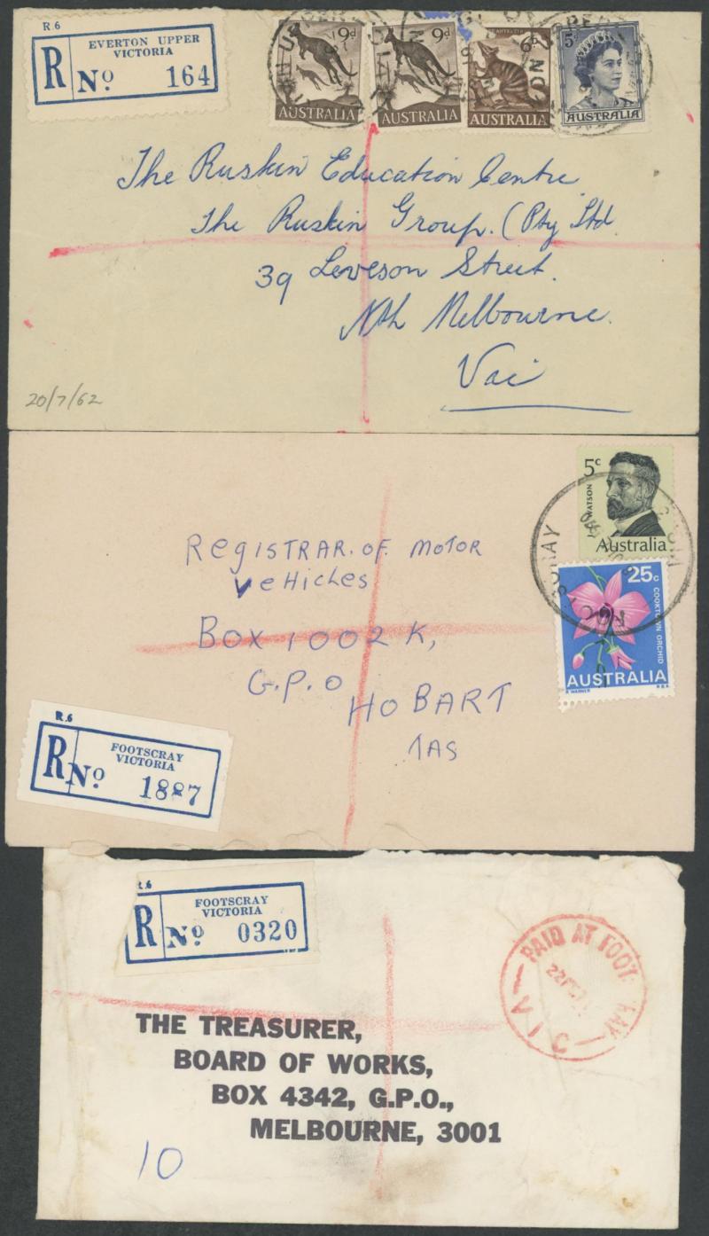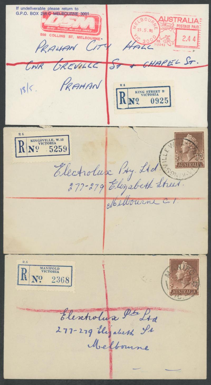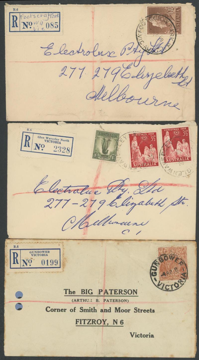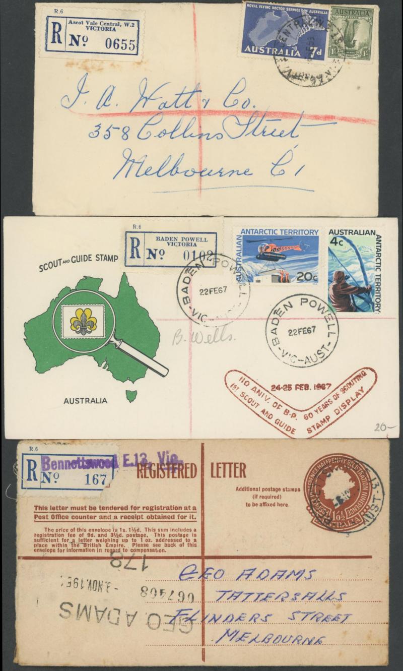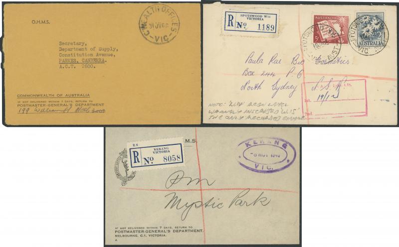 1963-73 John Webster registereds from '14TH STREET MILDURA', 'ARMSTRONG'S', 'BROWNS PLAINS', 'CASHMORE', 'CANNIE', 'CHETWYND' & 'CLARENDON', also 'RELIEF/7MY54/No15' with "Mildura/Mil PO" on blank R label, 1950 with 'BOLTON/VIC-AUST' on the face,