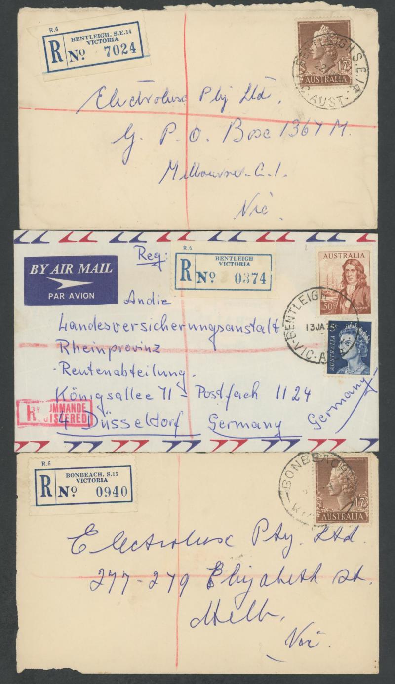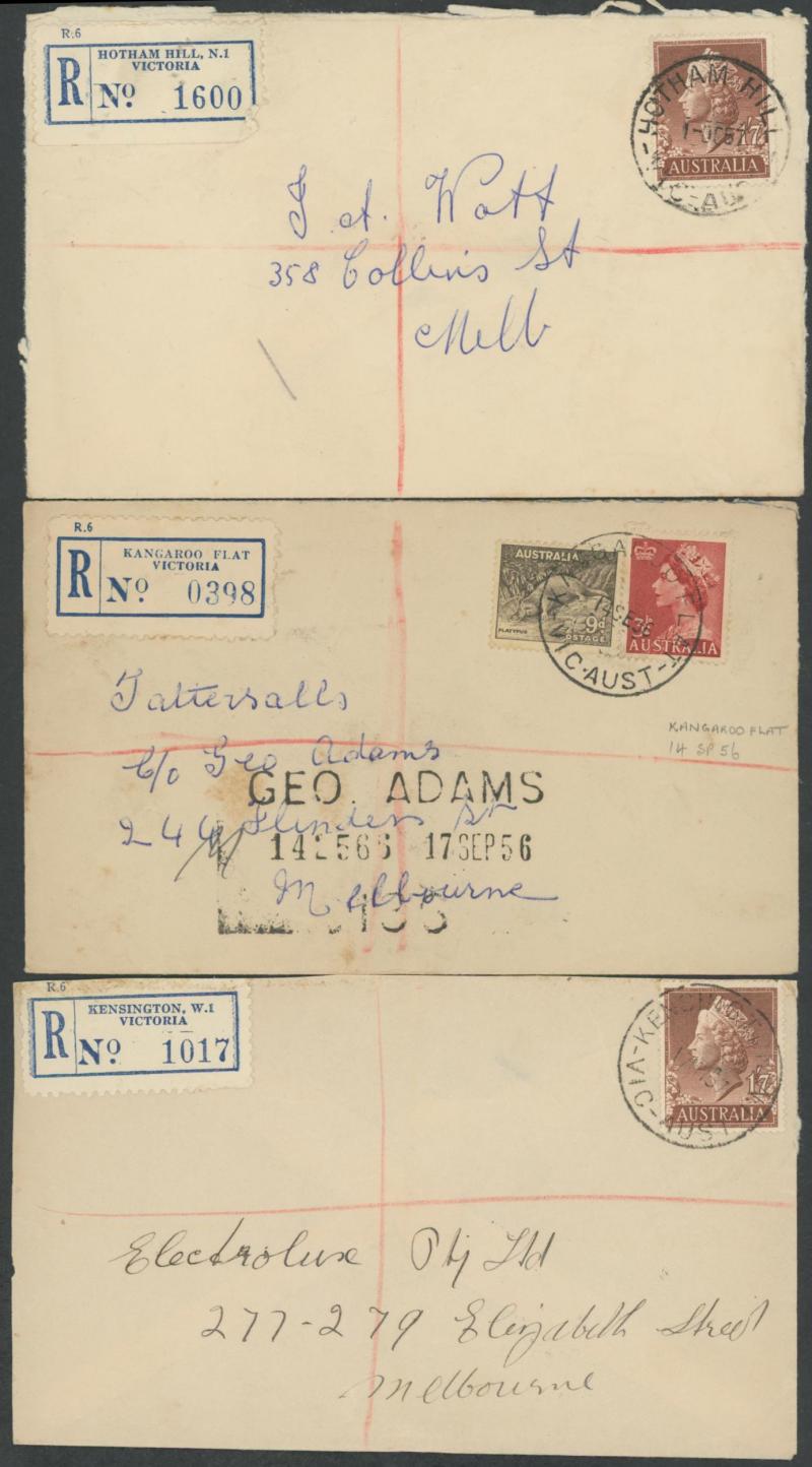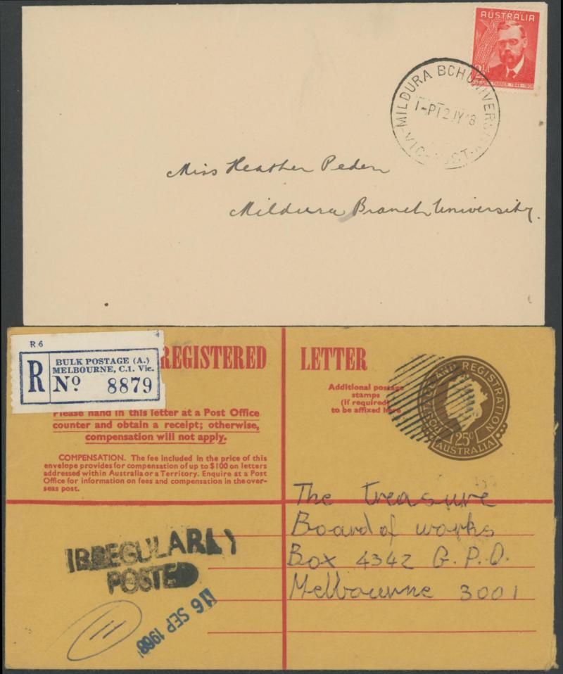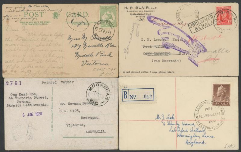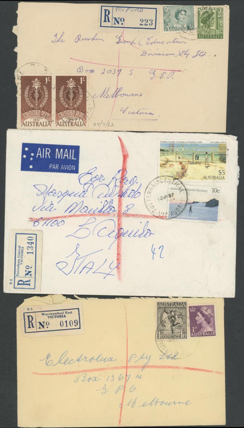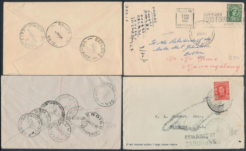 1963-73 John Webster registereds from '14TH STREET MILDURA', 'ARMSTRONG'S', 'BROWNS PLAINS', 'CASHMORE', 'CANNIE', 'CHETWYND' & 'CLARENDON', also 'RELIEF/7MY54/No15' with "Mildura/Mil PO" on blank R label, 1950 with 'BOLTON/VIC-AUST' on the face,
