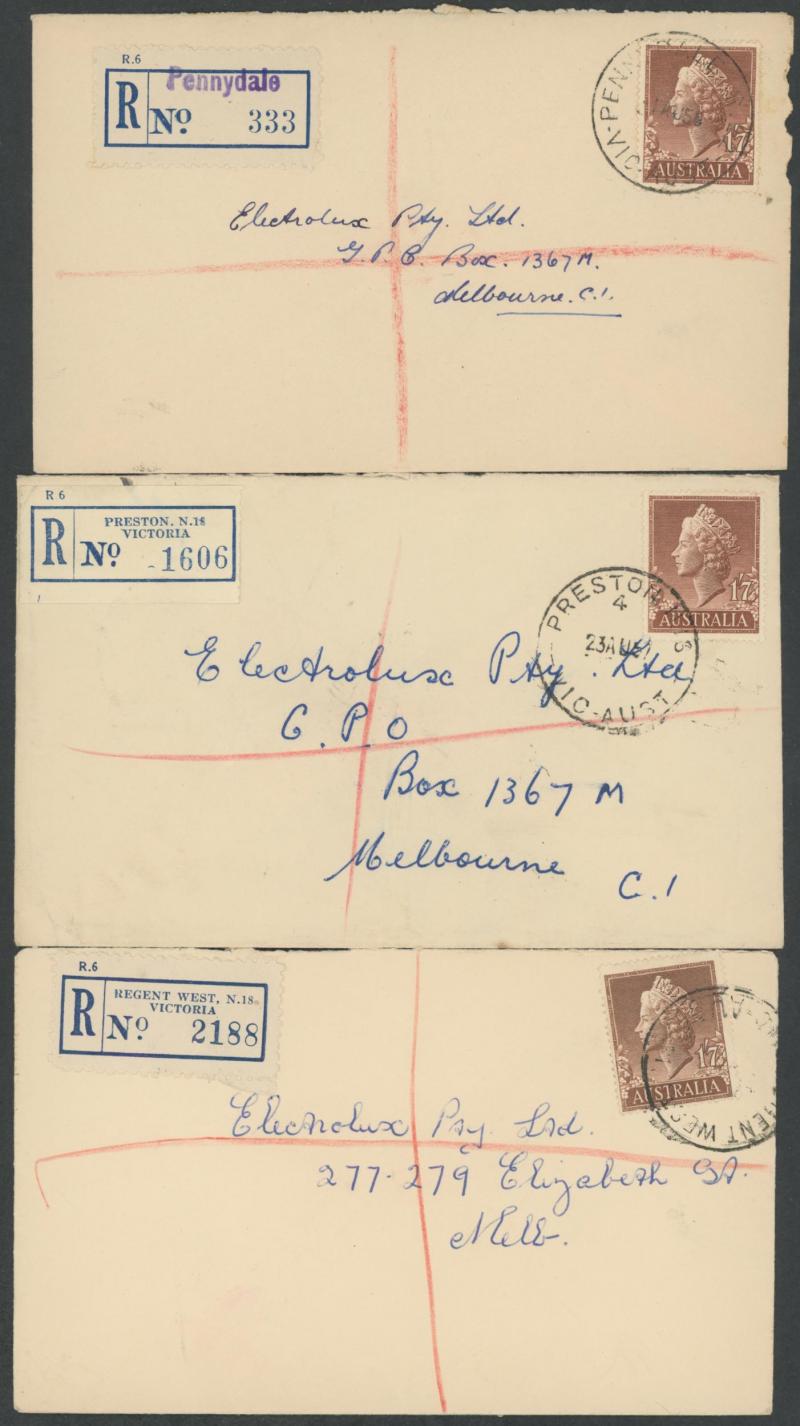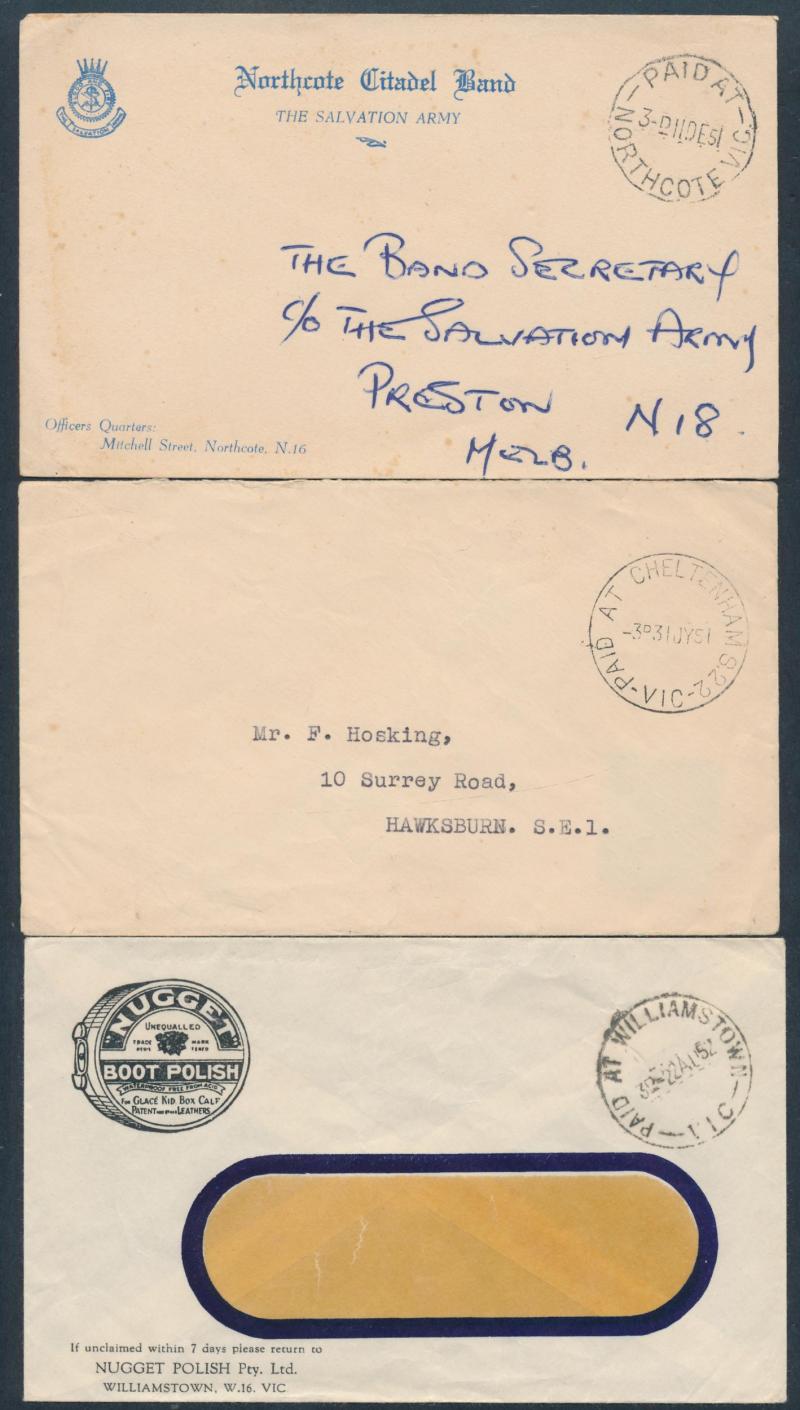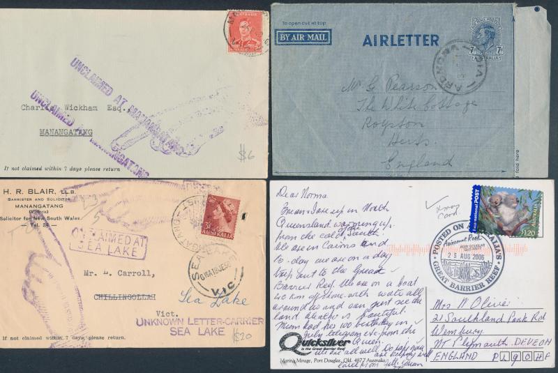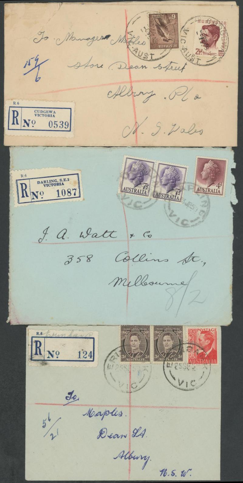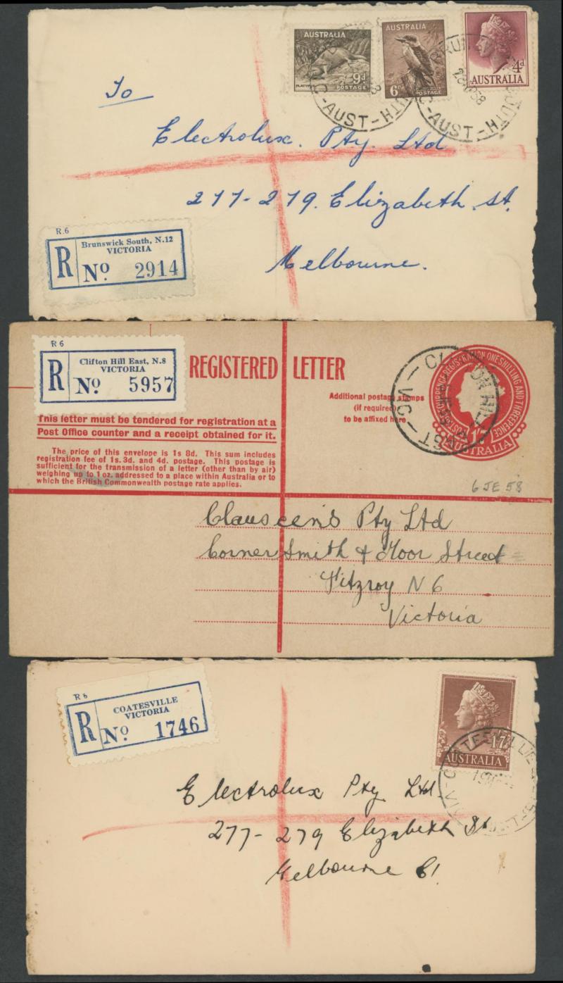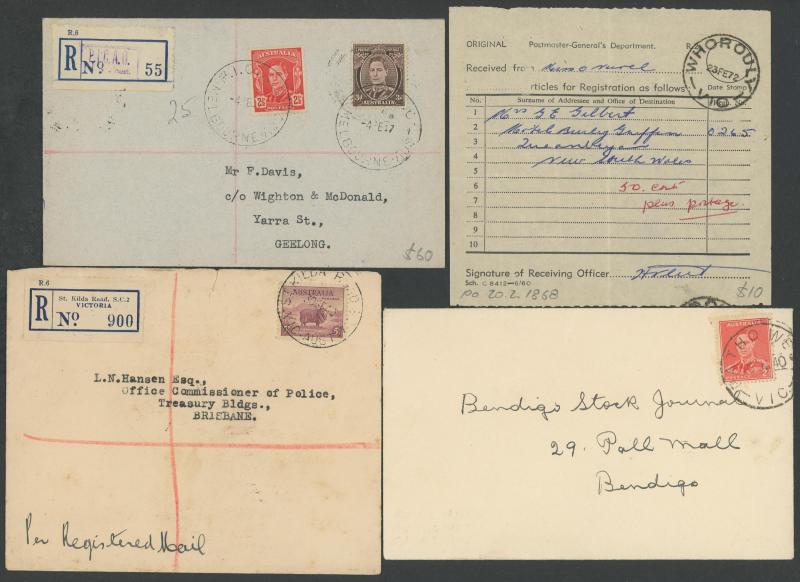 1963-73 John Webster registereds from '14TH STREET MILDURA', 'ARMSTRONG'S', 'BROWNS PLAINS', 'CASHMORE', 'CANNIE', 'CHETWYND' & 'CLARENDON', also 'RELIEF/7MY54/No15' with "Mildura/Mil PO" on blank R label, 1950 with 'BOLTON/VIC-AUST' on the face,