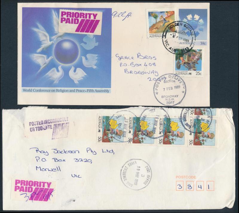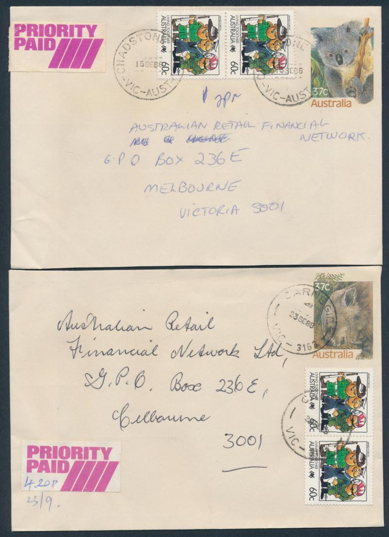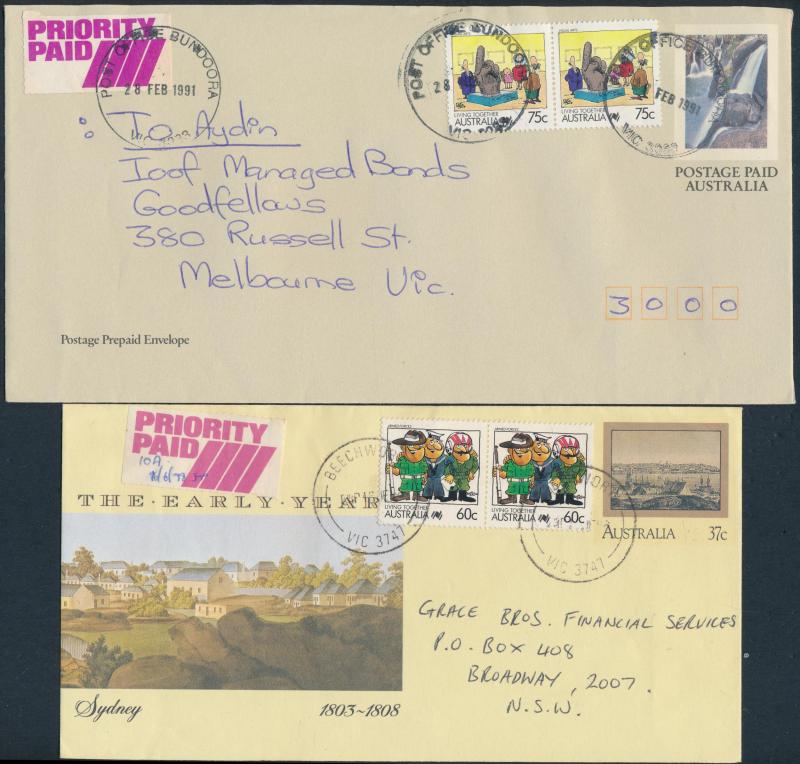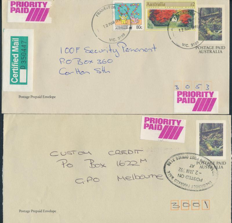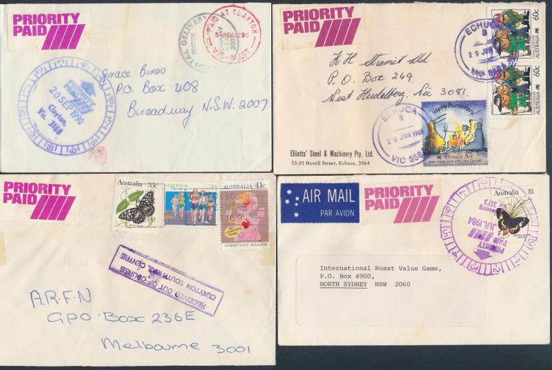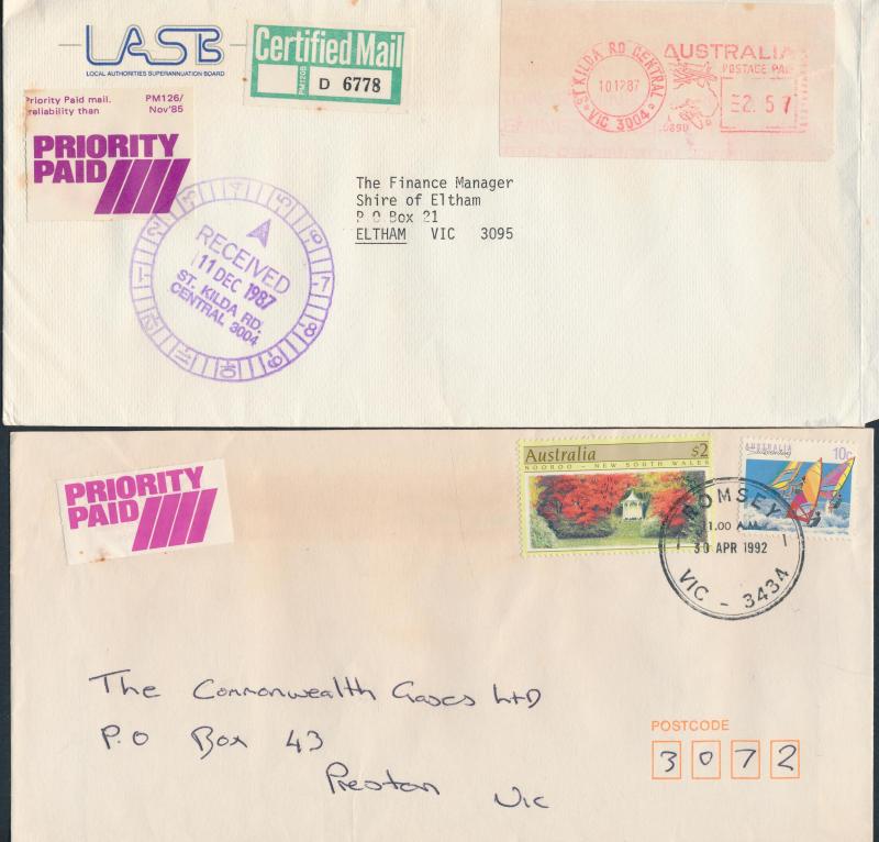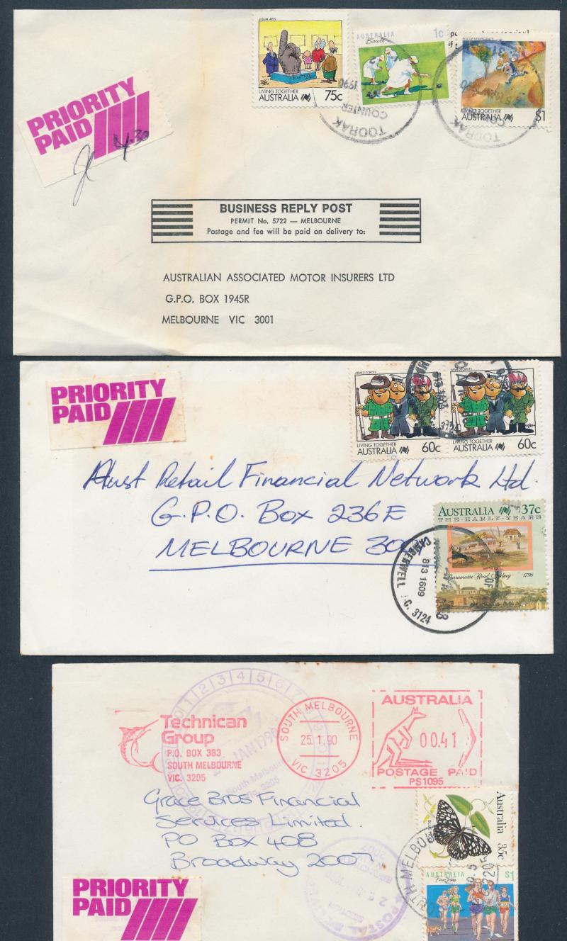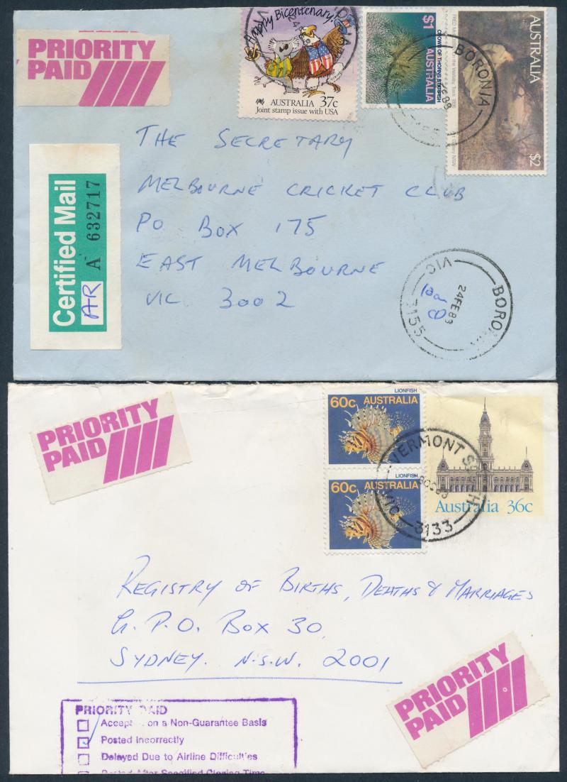 1963-73 John Webster registereds from '14TH STREET MILDURA', 'ARMSTRONG'S', 'BROWNS PLAINS', 'CASHMORE', 'CANNIE', 'CHETWYND' & 'CLARENDON', also 'RELIEF/7MY54/No15' with "Mildura/Mil PO" on blank R label, 1950 with 'BOLTON/VIC-AUST' on the face,