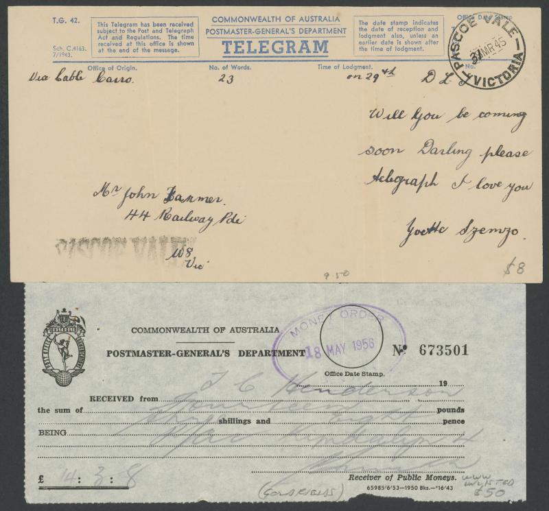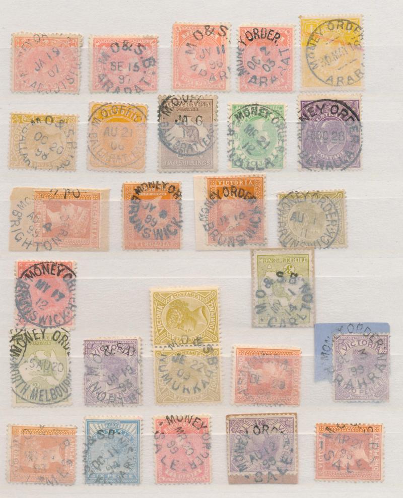 'MONEY ORDER' or 'MO&SB' cds & double-oval 'POST & TELEGRAPH OFFICE' datestamps mostly part-strikes on single stamps but all