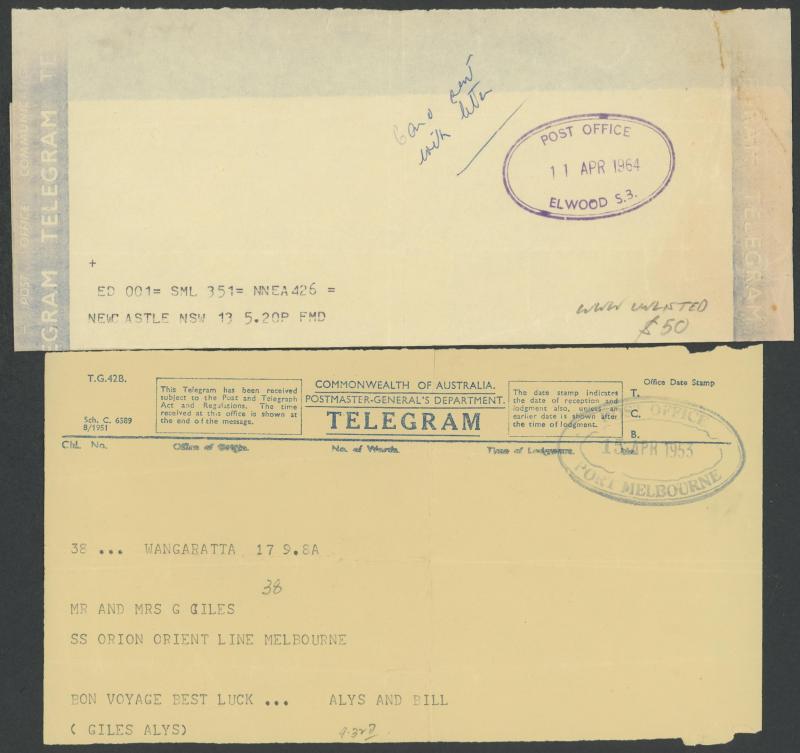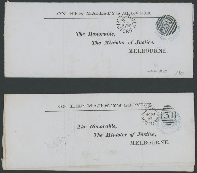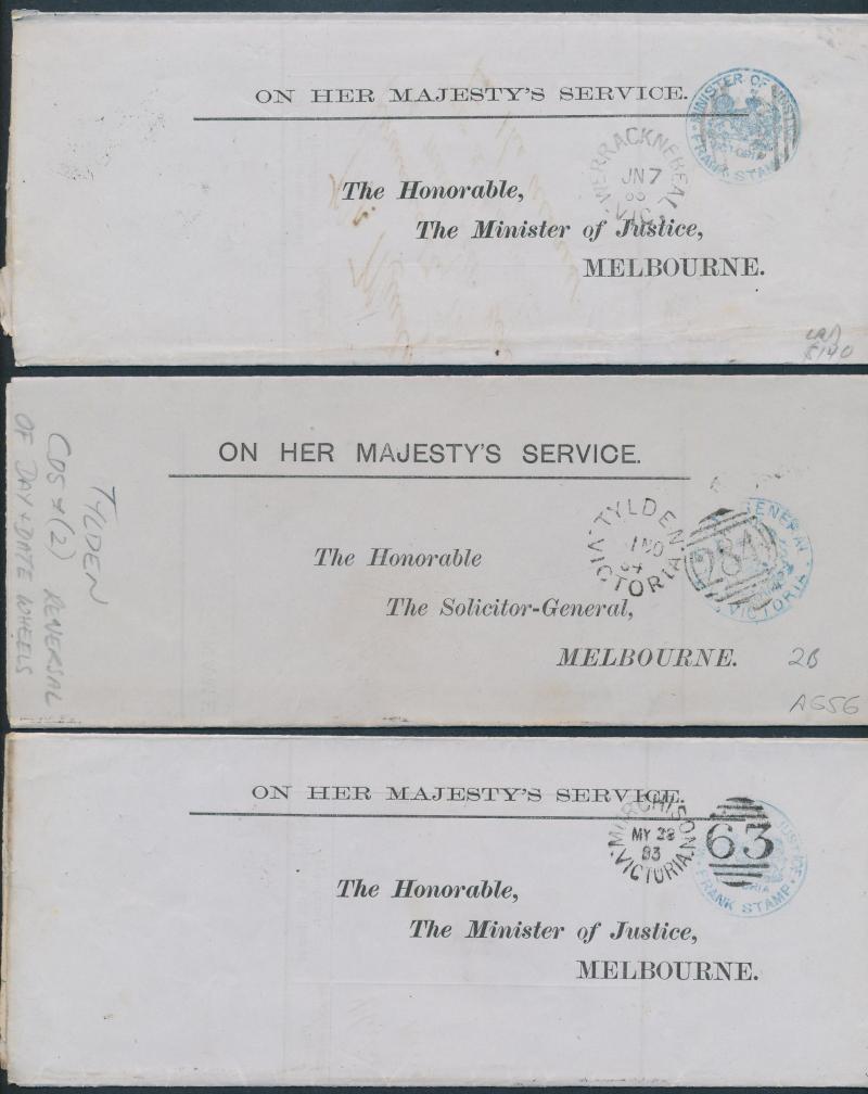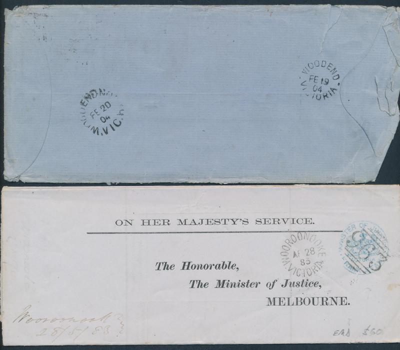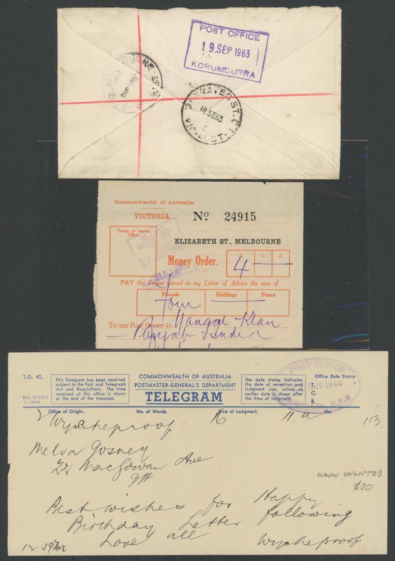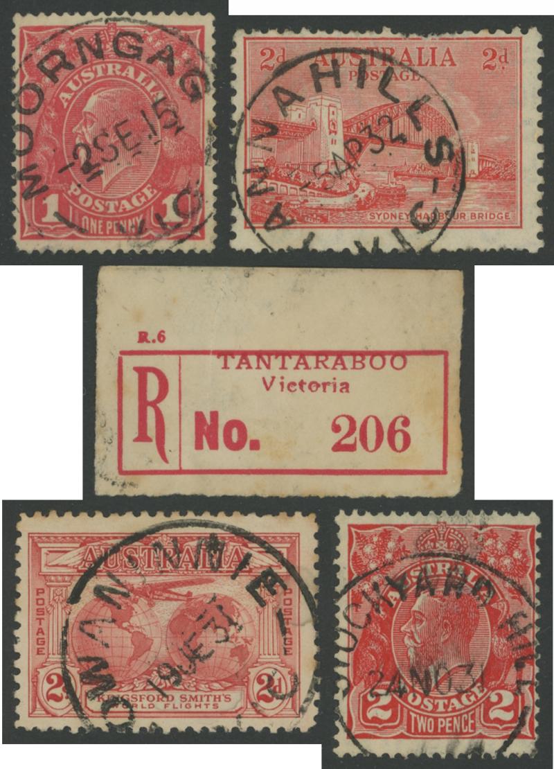 ORDER/JE-23-14/HAWTHORN' (on ½d Kangaroo only and taxed), 'MOORNGAG/VIC' (1928, arrival), 'PATHO WEST/VIC' (1940), 'R.O. PRESTON WEST/VIC' (1938, registered), 'SPOTSWOOD W15/...' (1961, error for 'W14' - the only recorded examples - with 'W14' R