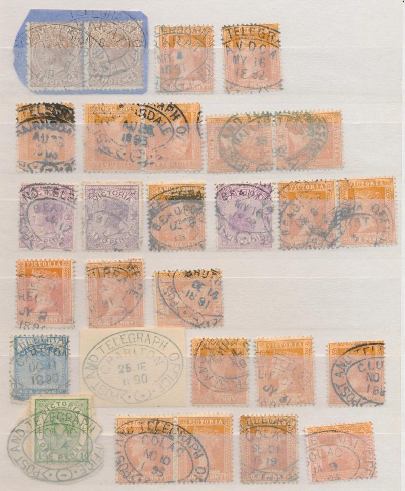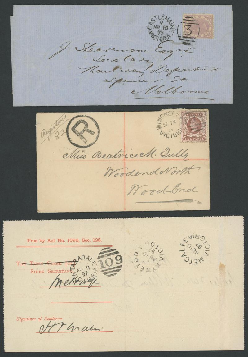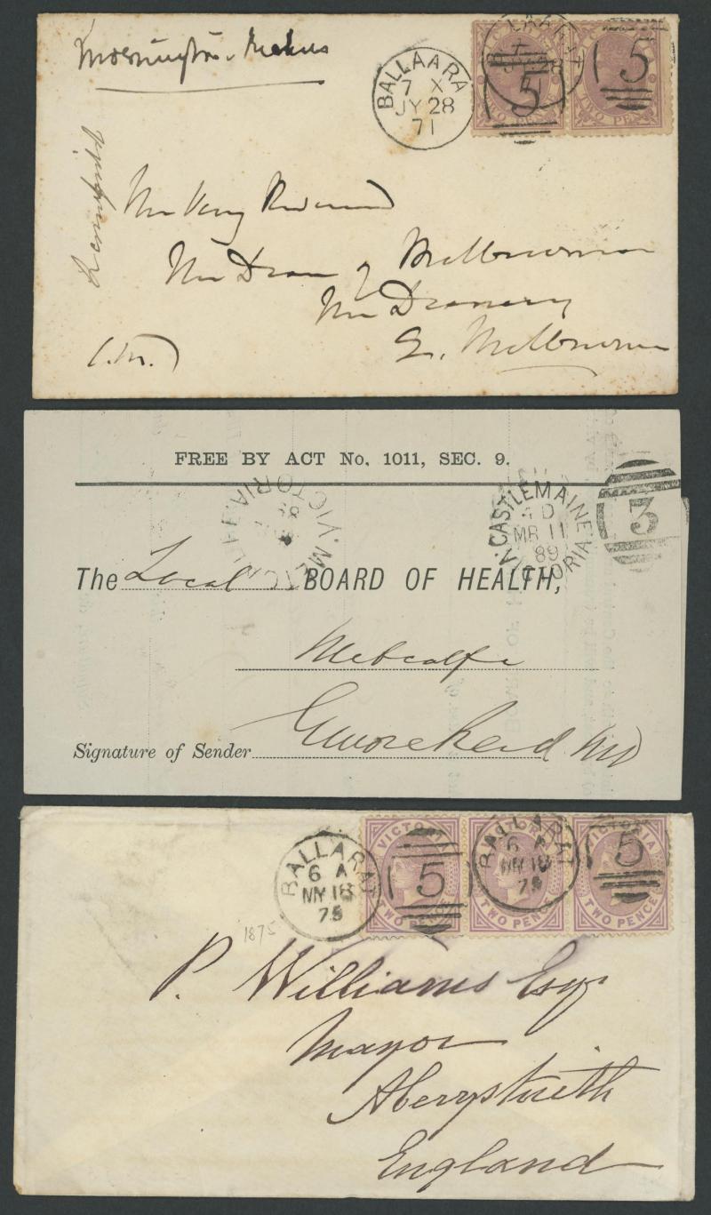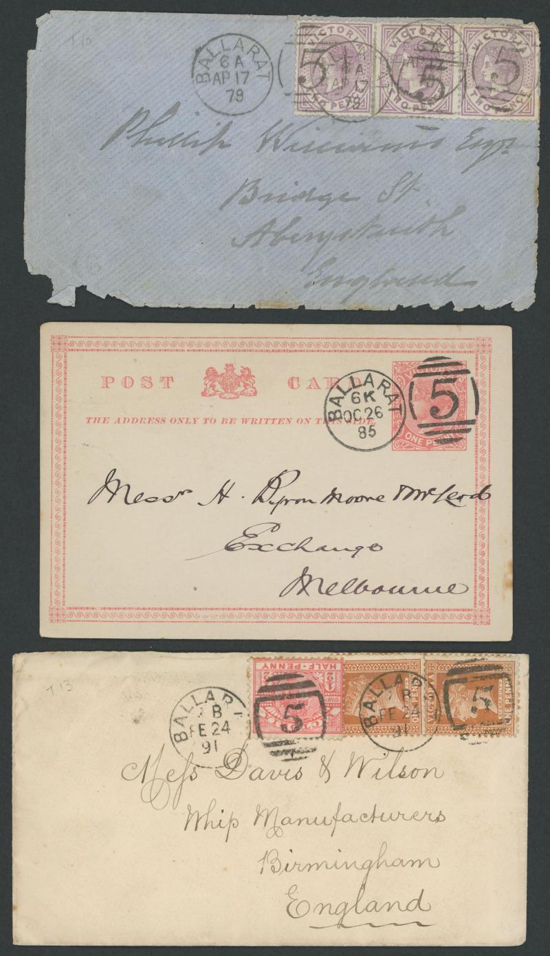 blue on 1888 registered to England and '1877' & 'ELSTERNWICK RECG HOUSE' on 1905 PPC, and a batch with duplexes including 'BALLAARAT - 5', recut 'BALLAN - 16', 'MALMSBURY - 98' & 'TARADALE - 109' both on 1890s posted telegrams, 'HOTHAM - 209' (rated