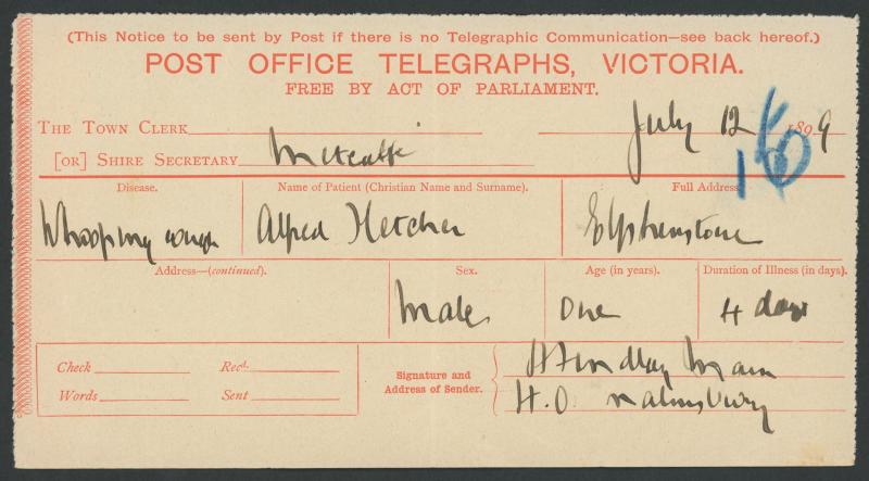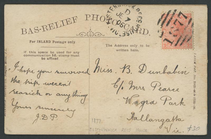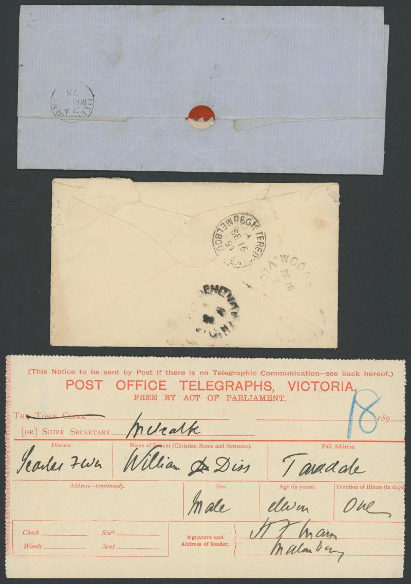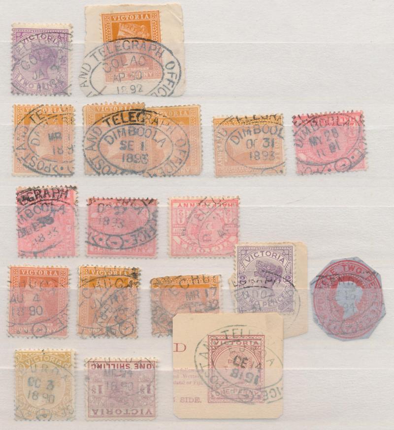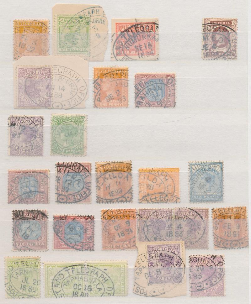blue on 1888 registered to England and '1877' & 'ELSTERNWICK RECG HOUSE' on 1905 PPC, and a batch with duplexes including 'BALLAARAT - 5', recut 'BALLAN - 16', 'MALMSBURY - 98' & 'TARADALE - 109' both on 1890s posted telegrams, 'HOTHAM - 209' (rated