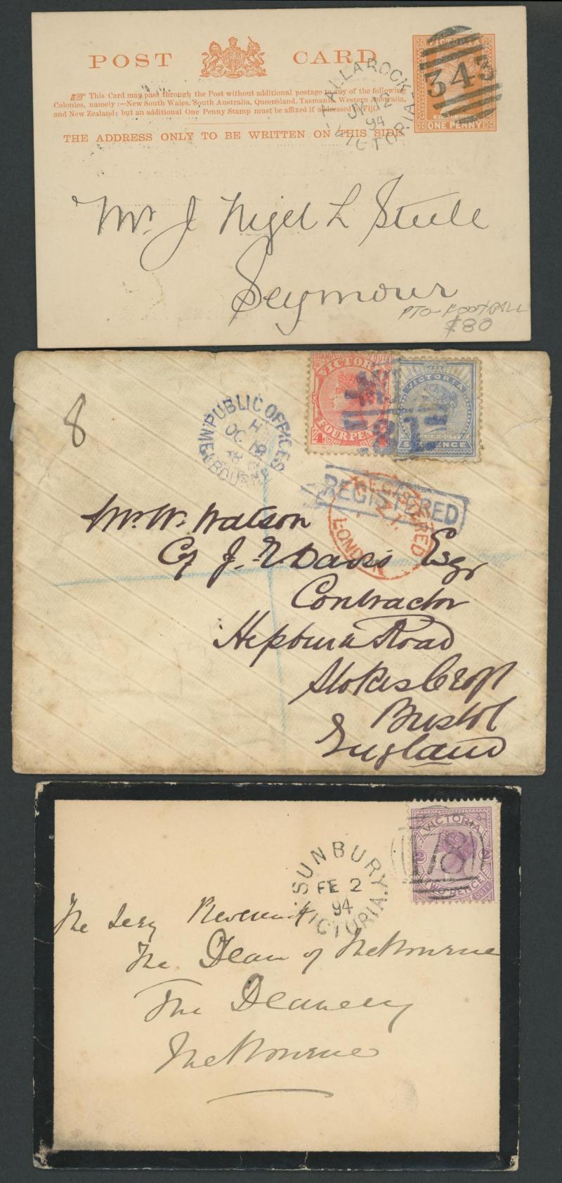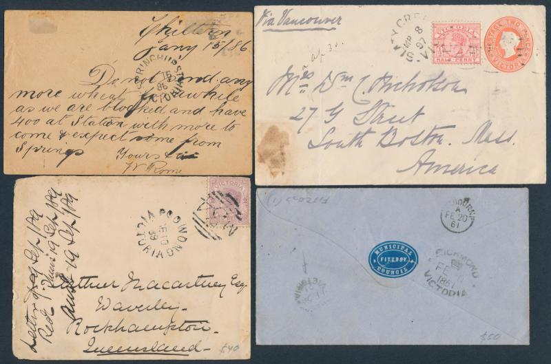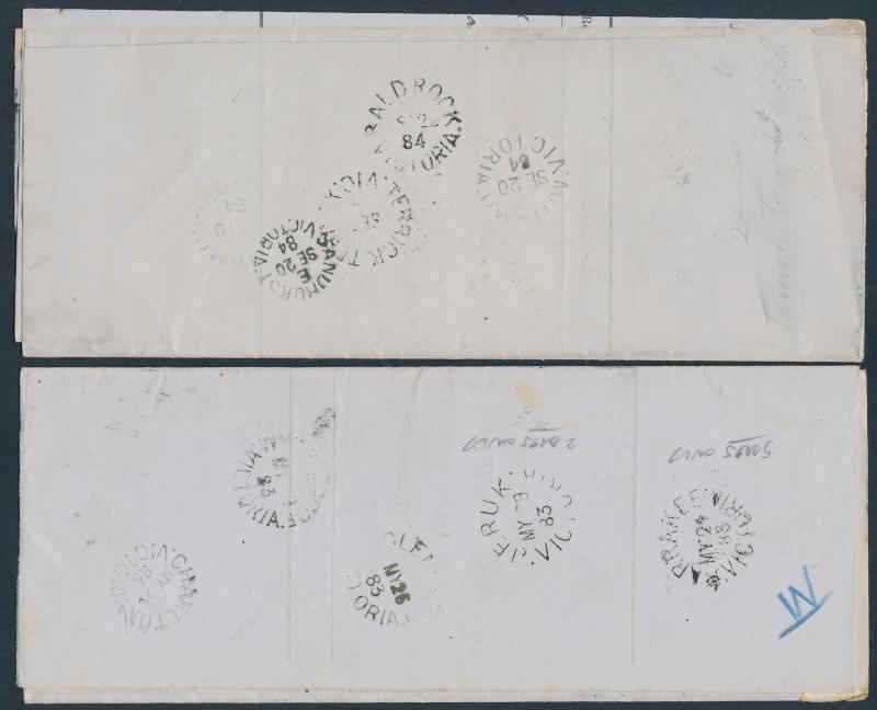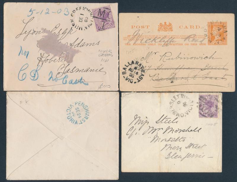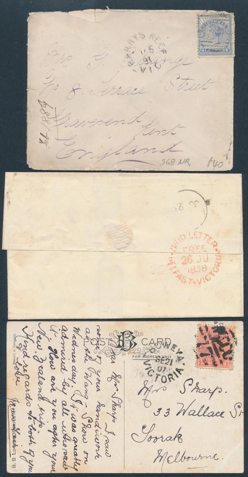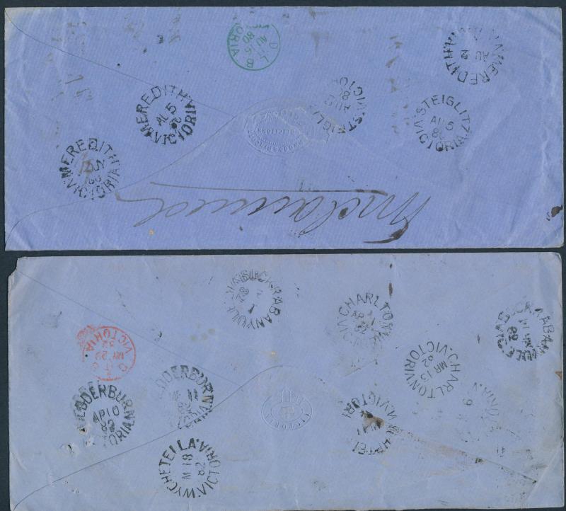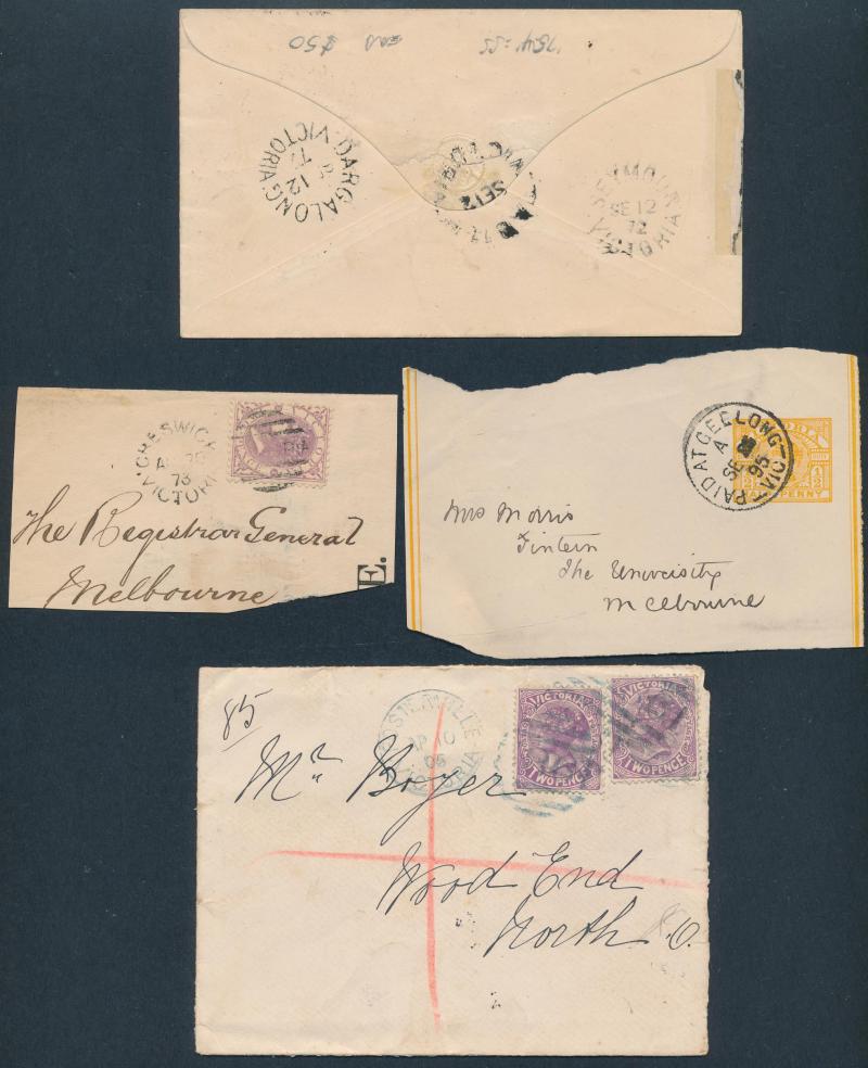 TERRICK'), 'BARRY'S REEF', 'SHIP LETTER/FREE/BELFAST VICTORIA' in red, 'BOWEYA', 'BUCKLAND', 'DARGALONG', 'DURDIDWARRAH' (registered, with 'STEIGLITZ' backstamp), framed 'PAID AT GEELONG' (on 1895 wrapper-front), 'GRIFFITHS POINT' (with superb BN