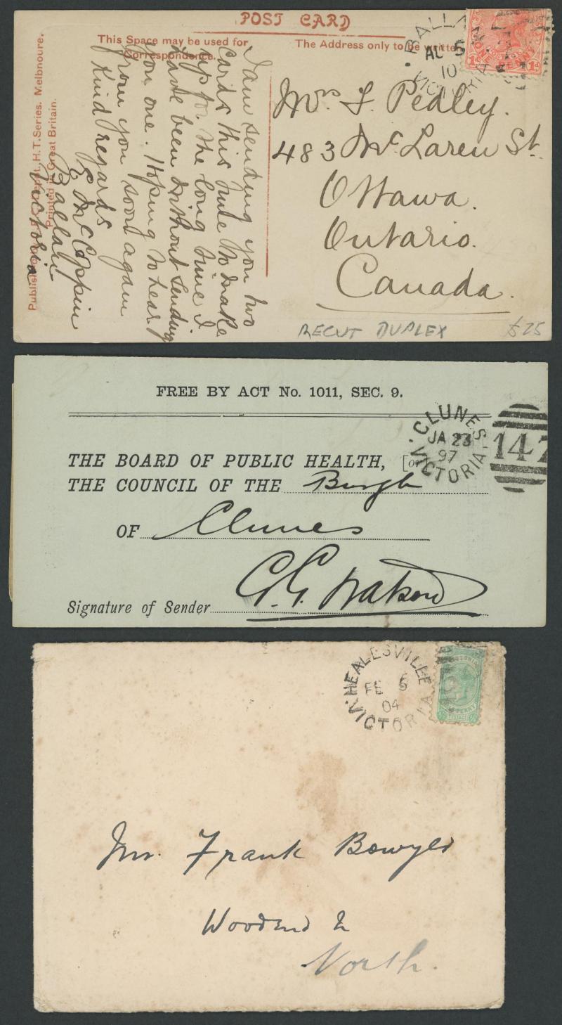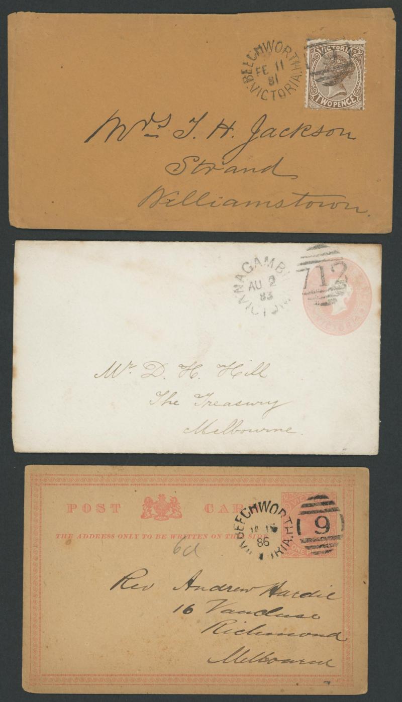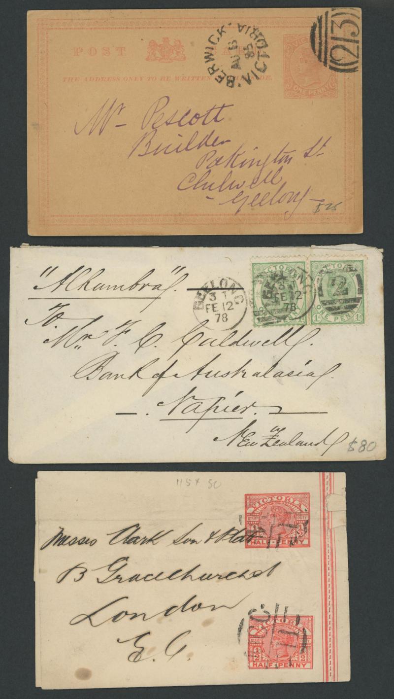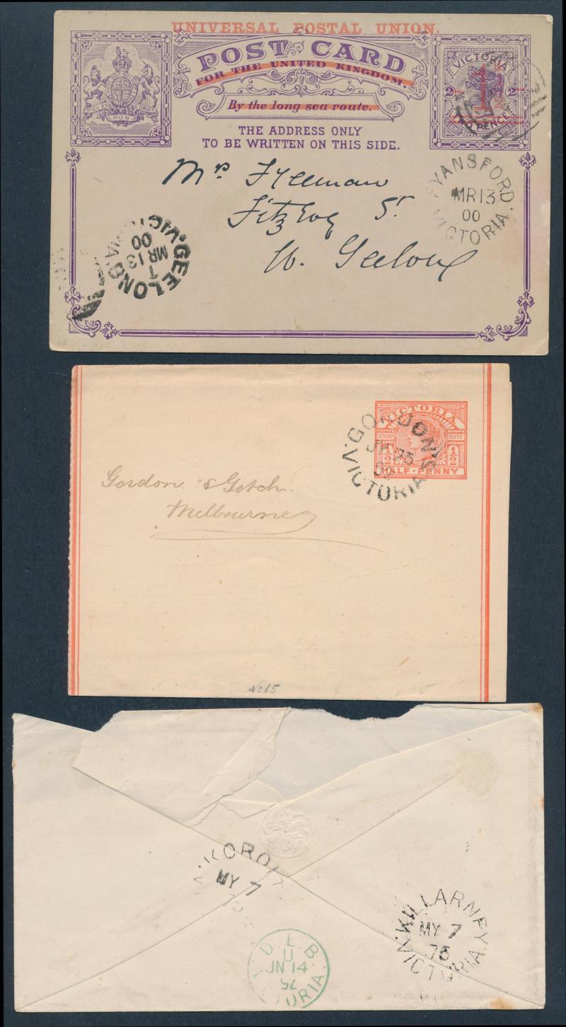 TERRICK'), 'BARRY'S REEF', 'SHIP LETTER/FREE/BELFAST VICTORIA' in red, 'BOWEYA', 'BUCKLAND', 'DARGALONG', 'DURDIDWARRAH' (registered, with 'STEIGLITZ' backstamp), framed 'PAID AT GEELONG' (on 1895 wrapper-front), 'GRIFFITHS POINT' (with superb BN