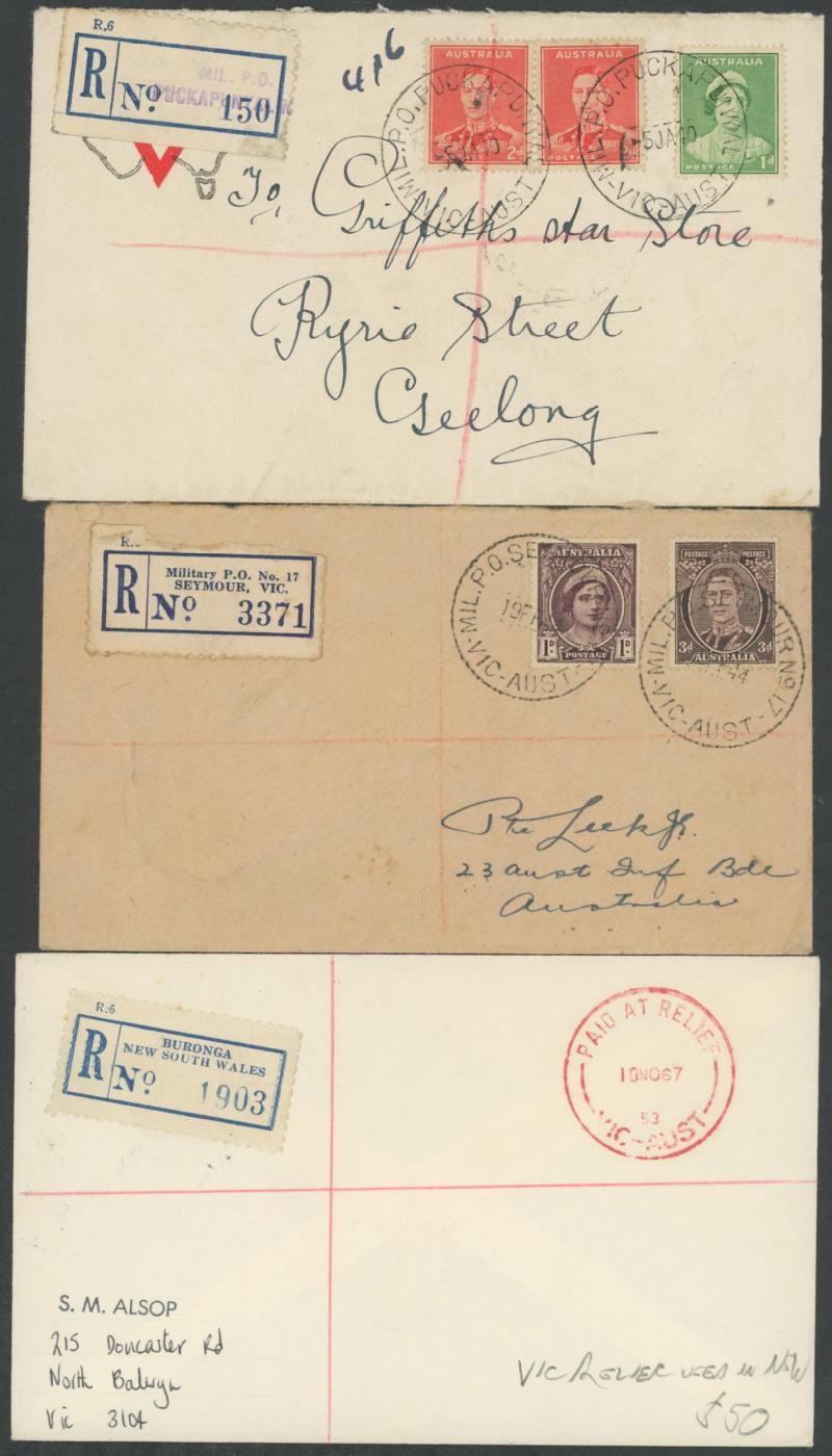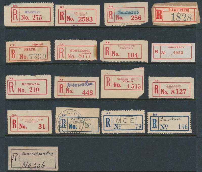 'PEDRINA PARK', 'MO RUSHWORTH', manuscript "Spring Plains" on R label but cancelled at 'MIA MIA', 'TELFORD', 'WOORAK', WWII Mil POs at Caulfield, Darley, Puckapunyal & Seymour No 17, many with provisional R labels, much moderate duplication,