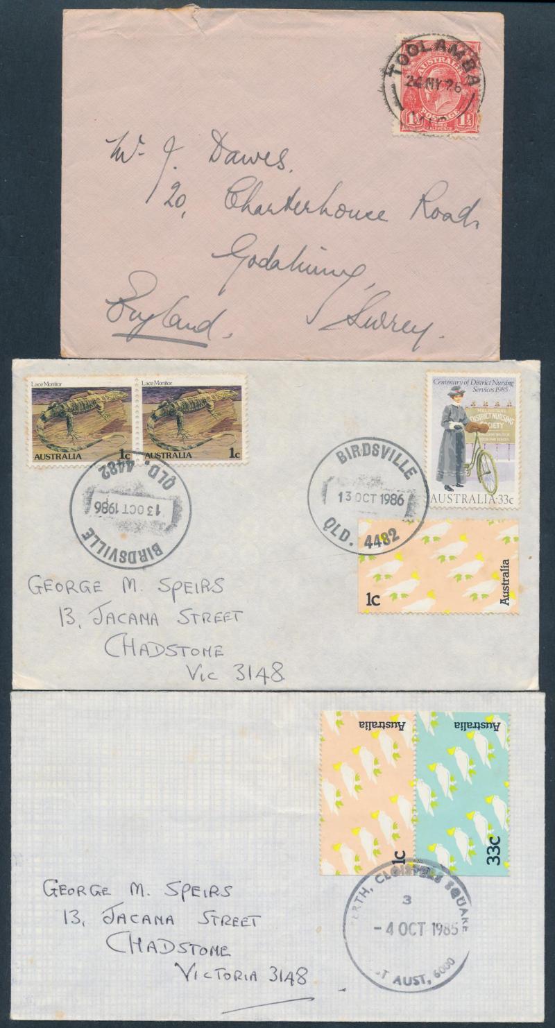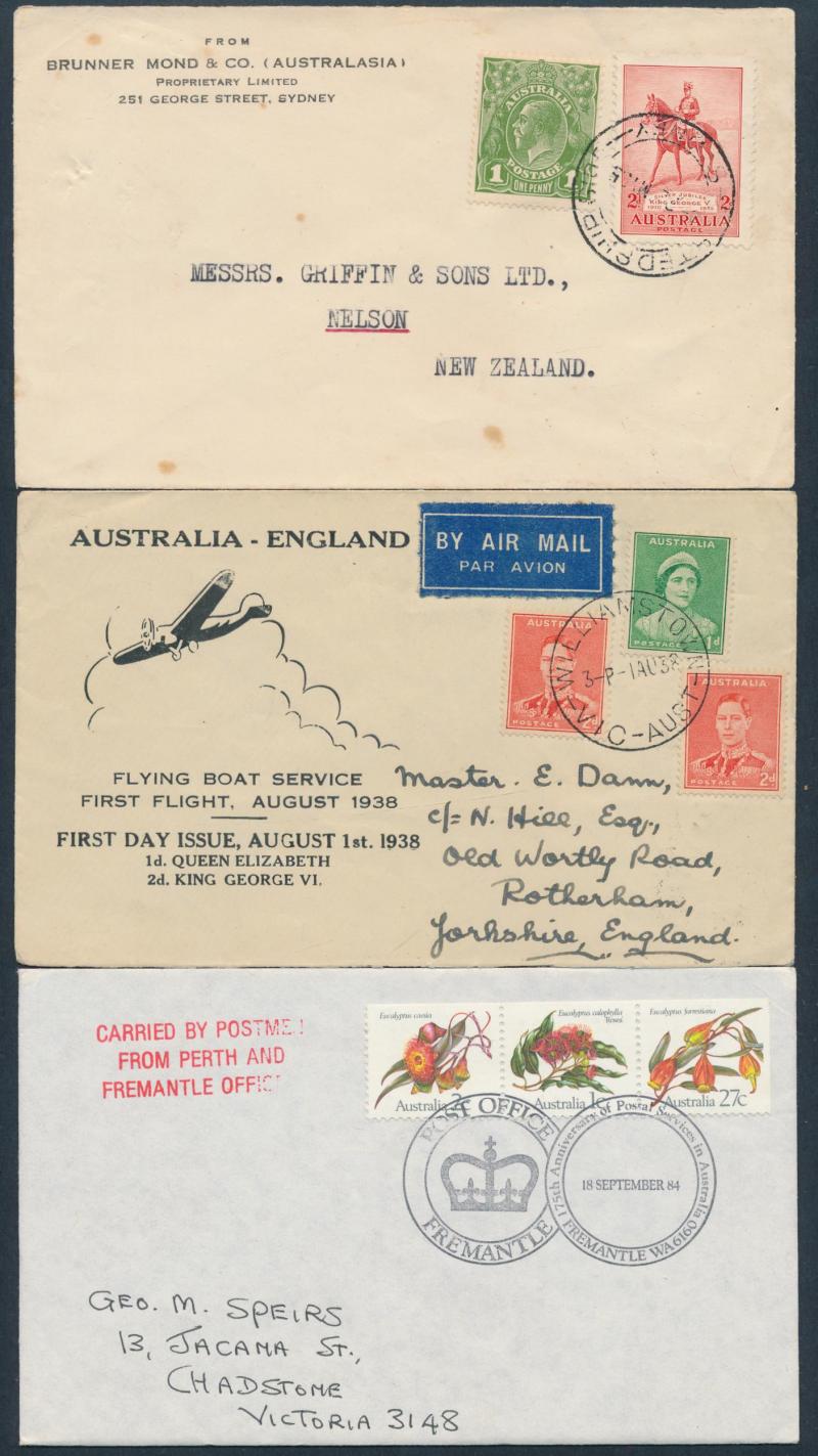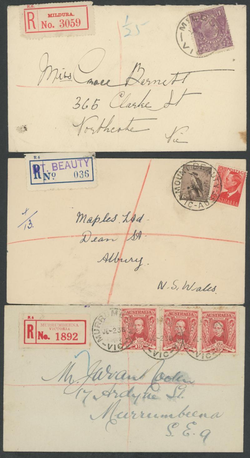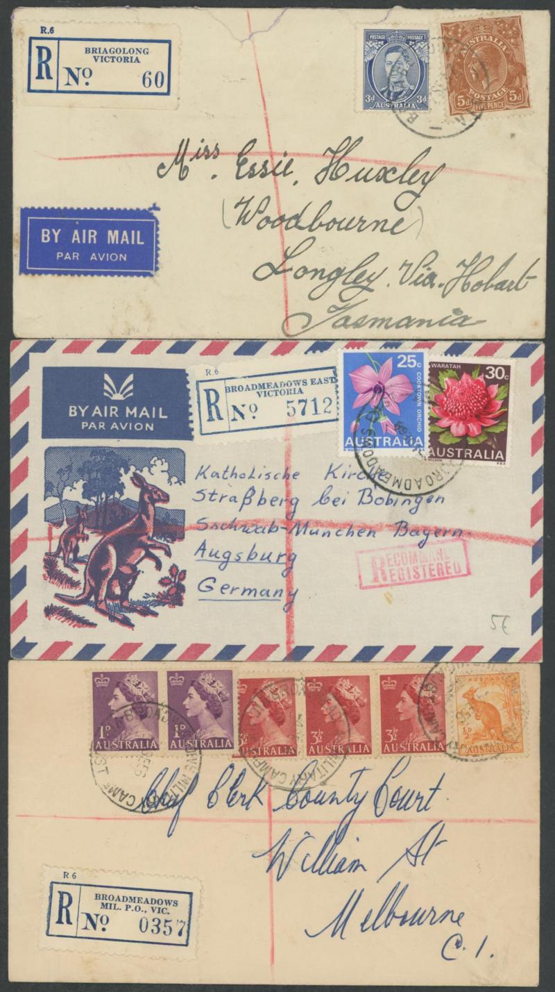 1933 with triple-oval 'MONEY ORDER OFFICE/RED CLIFFS' backstamp (the only recorded example), airmail covers with 2/- or 2/3d solo frankings, and a bundle of 2000s airmail covers to GB with an array of International Stamps including a few scarcer