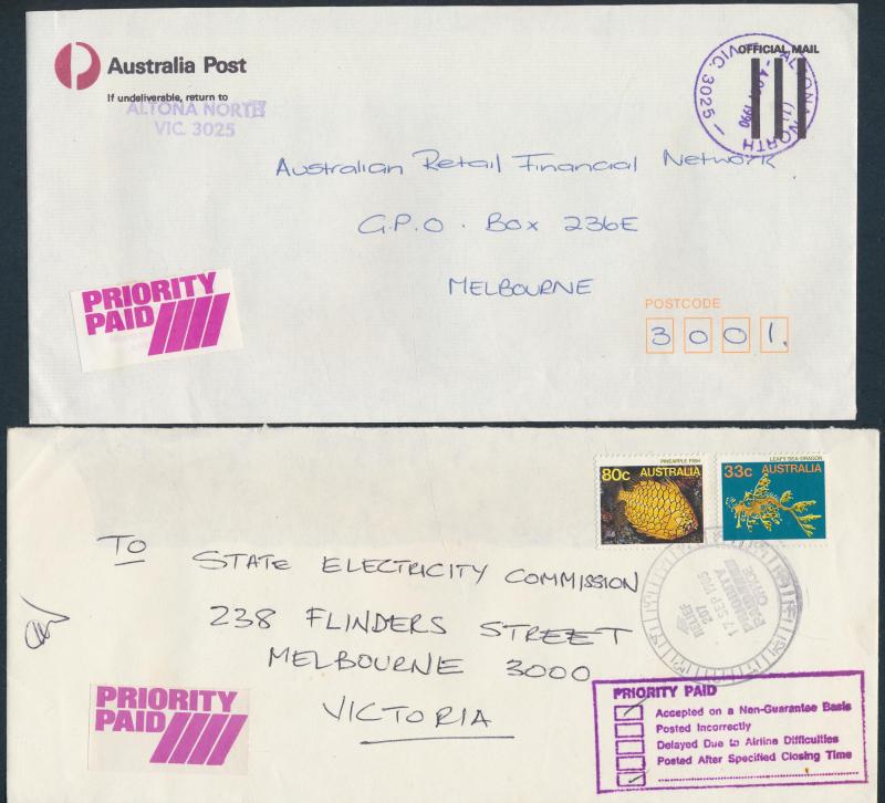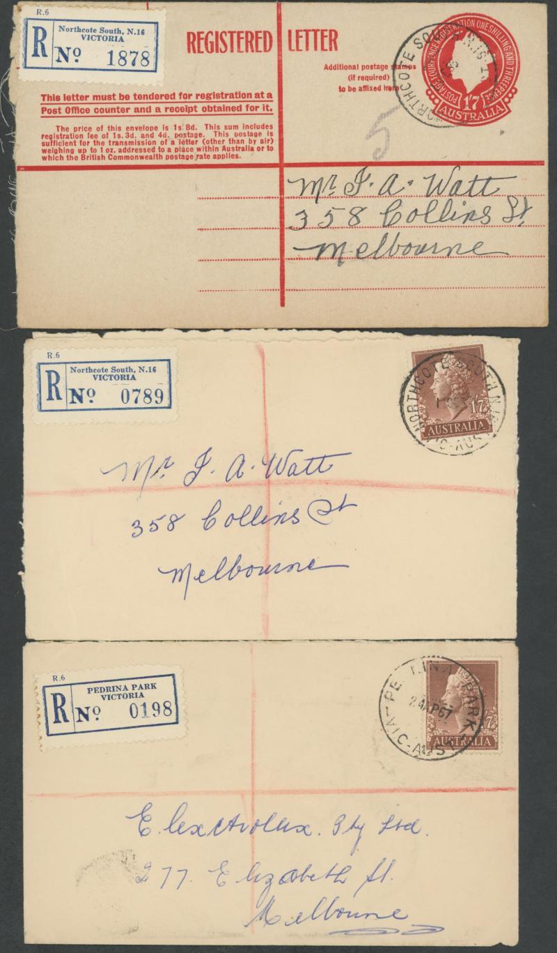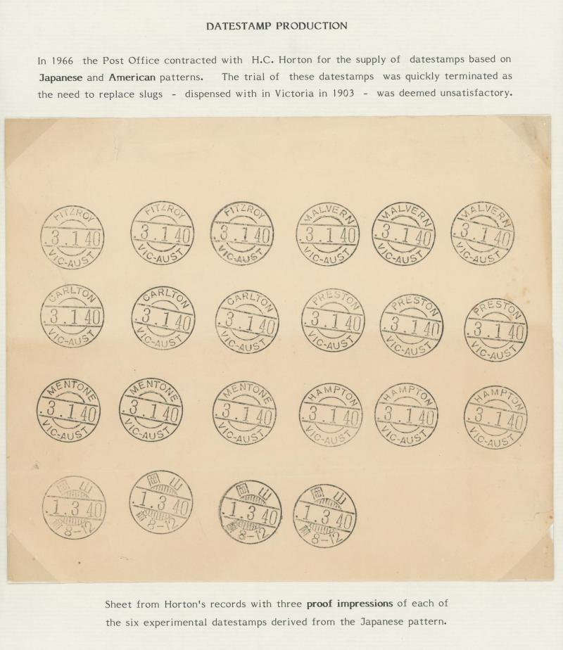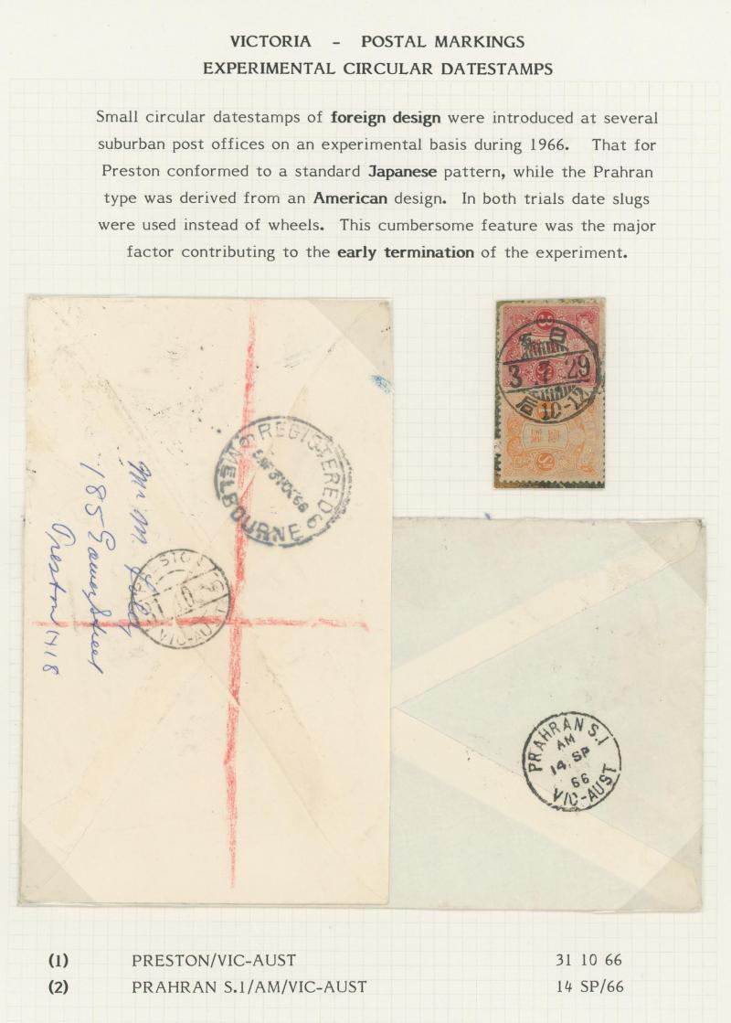 six 24mm experimental cds derived from the Japanese pattern for Carlton, Fitzroy, Hampton, Malvern, Mentone & Preston, plus usage of the 'PRESTON' cds on a commercial registered cover, and 1966 registered cover with a 25mm US- or Canadian-pattern