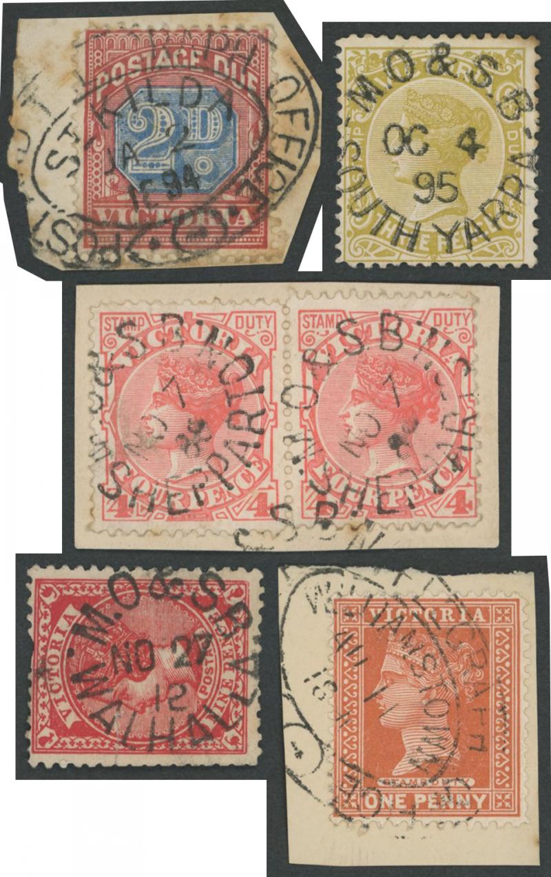 identifiable including many scarcer types & the rare 'SAVINGS BANK/PRAHRAN' cds, minor duplication, also Postal Cards with Belt & Buckle types for Nhill & Queenscliff and the rare 'MO&SB/MALMESBURY' (original spelling) and 1893 cover with